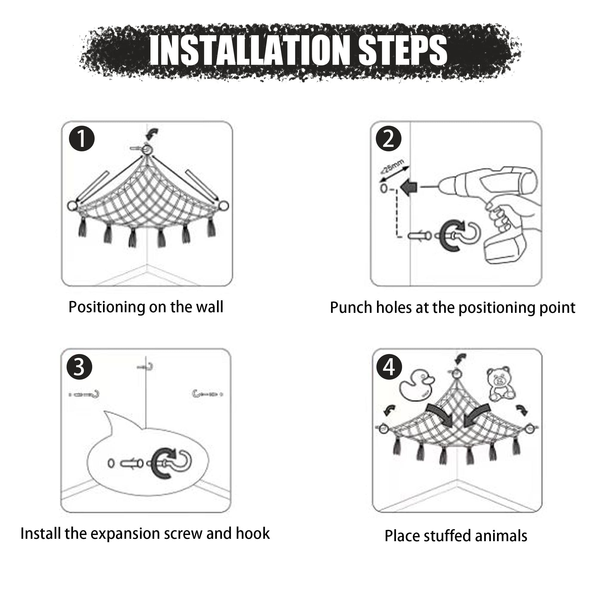 【Package Included】1*Stuffed Animal Hammock, 1*Led Light String in 78"(Battery not included), 3*Anchors and 3* Screws. No additional accessories are required. Find the ideal location and install the stuffed animal holder in the corner.