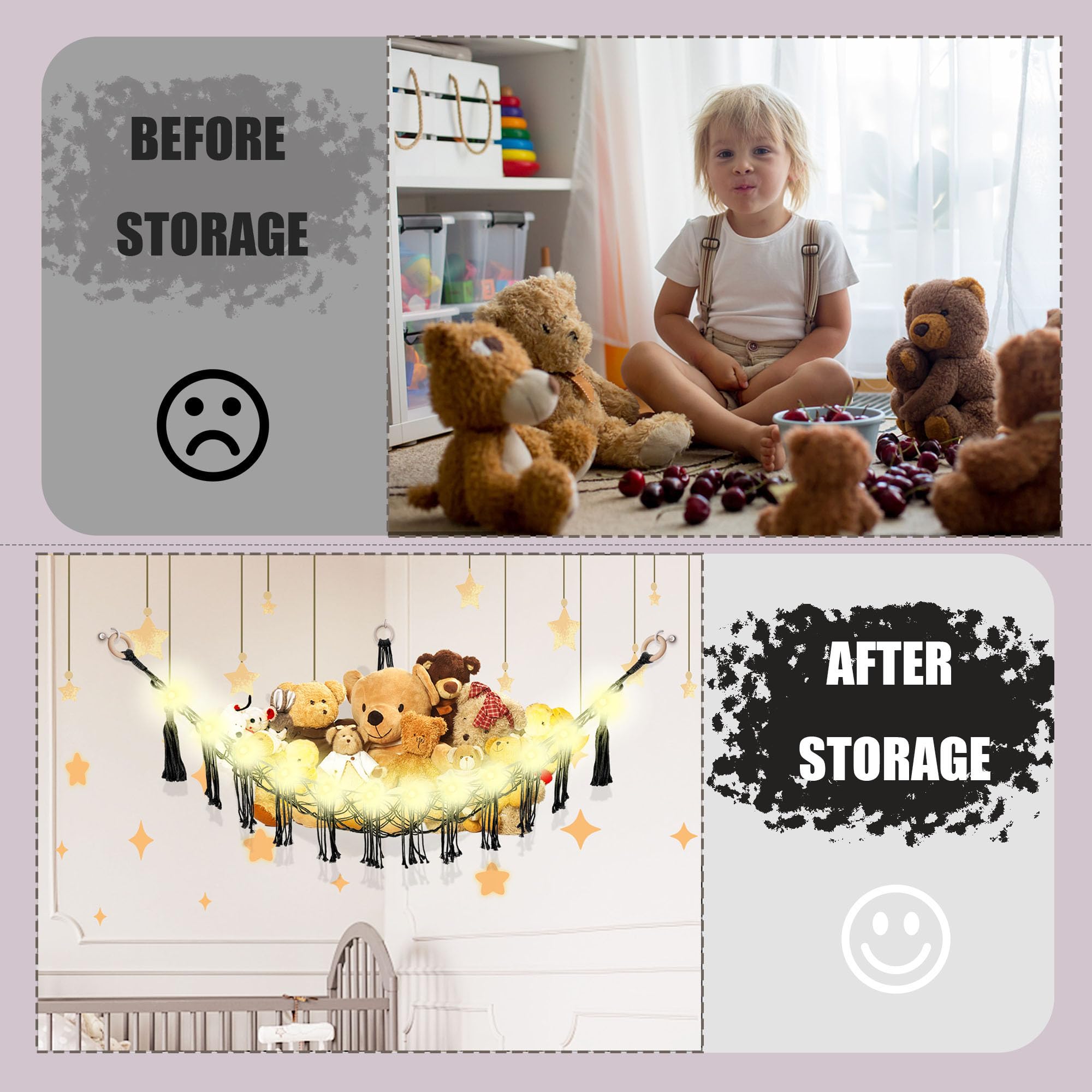 【Boho Toy Hammock】Handmade macrame stuffed animal hammock with tassels is a preferred decoration for kids' rooms. Come with an LED light string, providing reassuring companionship to kids at night.