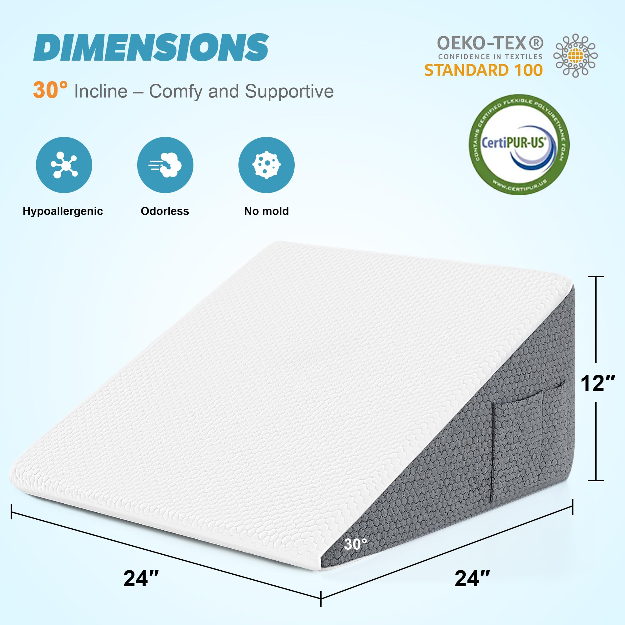 CONVENIENT PRACTICAL FEATURES: Equipped with dual side pockets for storing remotes, phones, or glasses within easy reach; a portable carrying handle for effortless mobility; and non-slip bottom fabric to keep the sleeping wedge pillow for adults securely in place. Upon arrival, allow 8-24 hours in a ventilated area for full expansion and odor dissipation — your thoughtful gift featuring this triangle pillow for family, seniors, or anyone seeking elevated comfort!