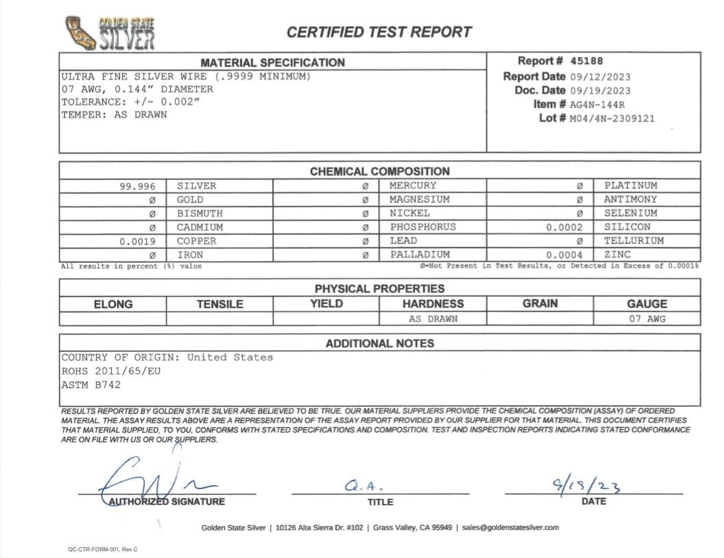 This is a 7-inch Rod Set of MINIMUM 99.995% Pure Silver Wire in 7 Gauge (0.144 in. / 3.66 mm). Each Rod is precision saw-cut (flush) on both ends, with a slight bevel around the edge. An excellent electrode choice for large-scale Colloidal Silver production. Guaranteed to be MINIMUM 99.995% Pure Silver, OR BETTER. This means even FEWER impurities than your standard 99.99% Silver. A copy of the Certified Test Report is included with every order, outlining the chemical composition (assay) of the silver, and the lot that it came from. You won't find a more trusted source for pure silver wire for colloidal. All of our silver is SOURCED, MANUFACTURED, SOLD, SHIPPED, and PACKED, right here in the UNITED STATES. We (Golden State Silver) have been supplying the highest quality, purity, and customer satisfaction for over 15 years. Come see why; Find Your Golden State