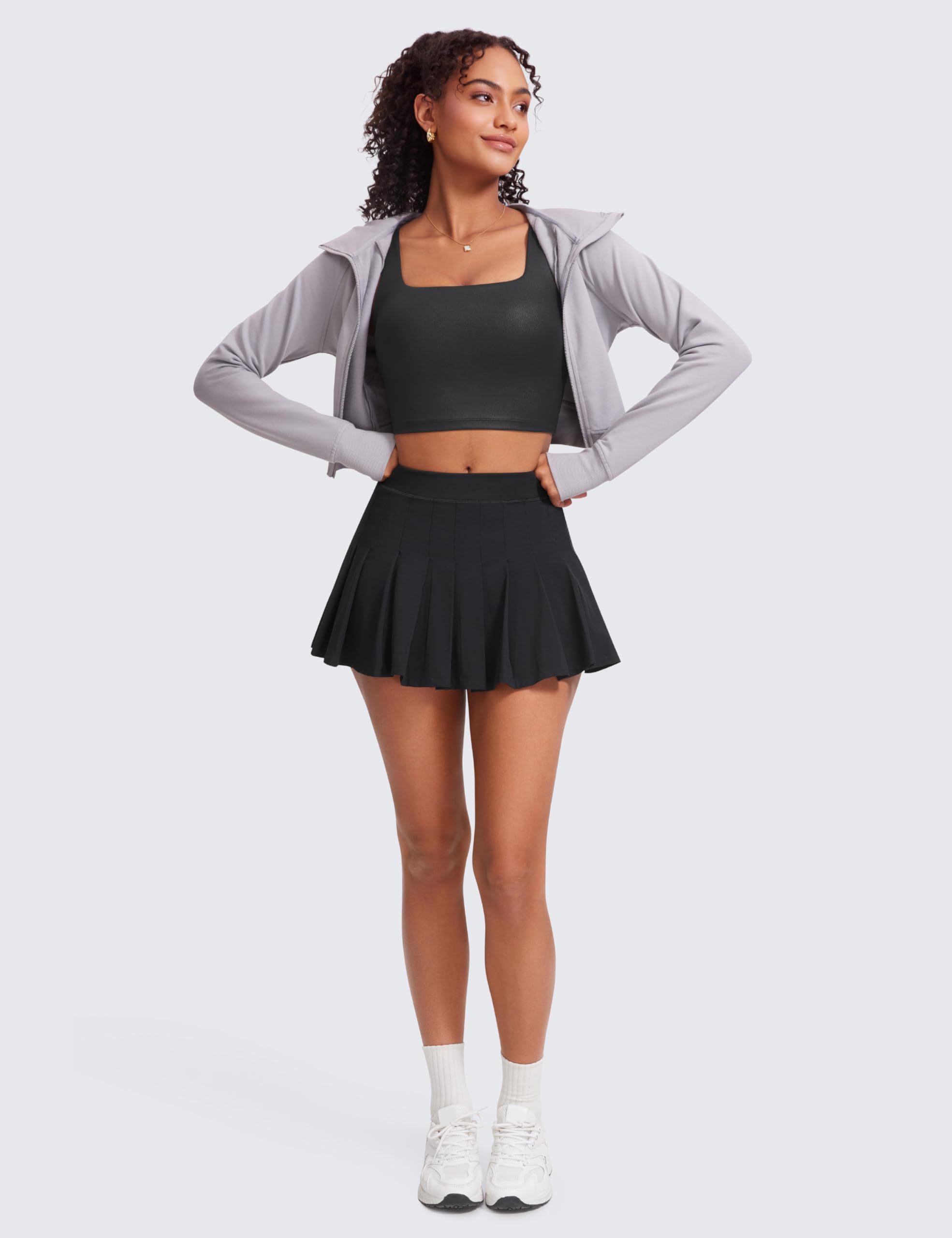 Cropped tank top that sits above the belly button, pairs well with high-waisted pants