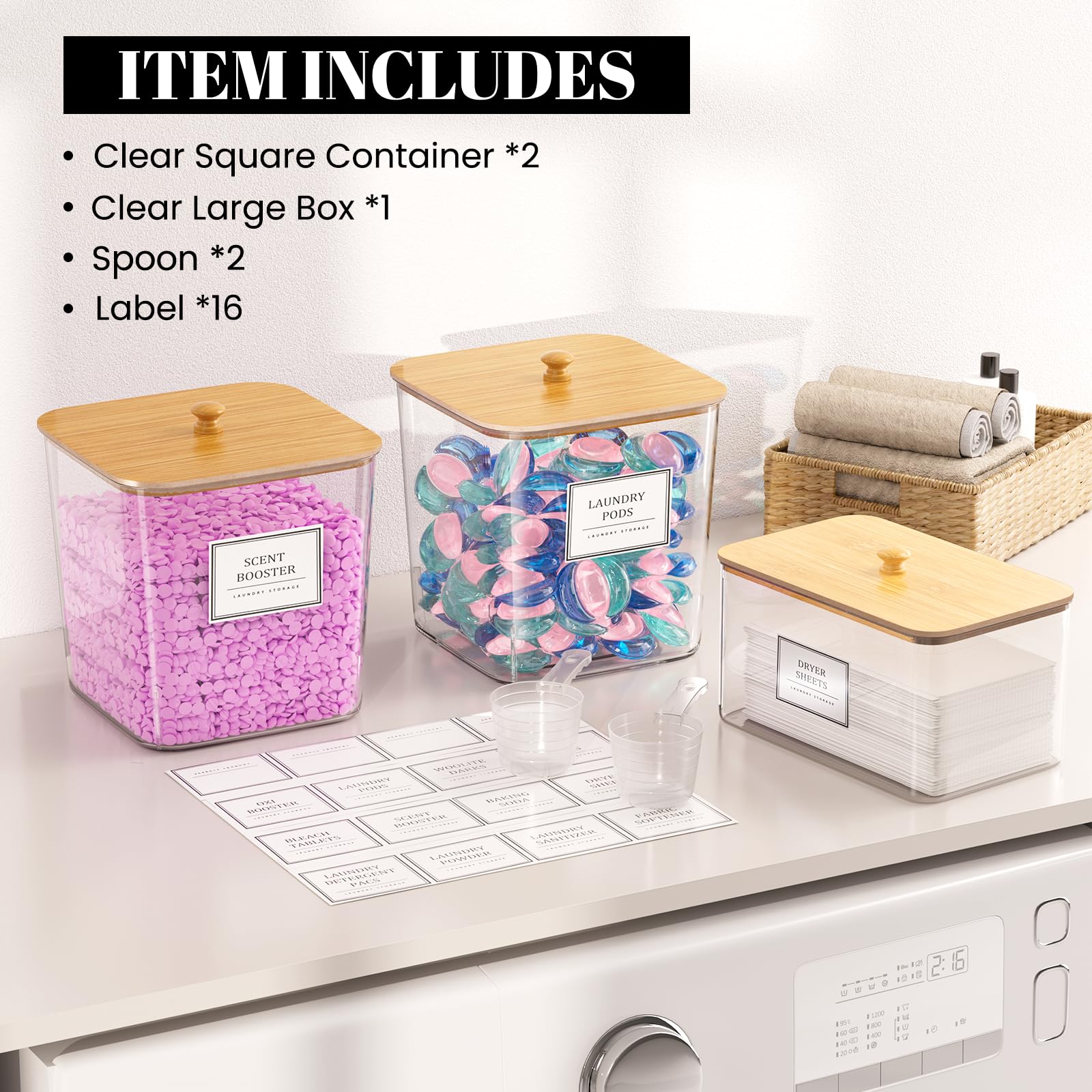 【Laundry Pods and Dryer Sheets Container Set】 This laundry scent booster container set includes clear containers with wooden lids (0.66 Gal/84 OZ) x2,dryer sheet holder x 1, scoops x2, waterproof labels x16. Laundry containers perfect for organizing and storing items in your laundry room, kitchen, bathroom, and other areas of your home. These laundry detergent container are dishwasher safe, while the wooden can be easily wiped clean with a damp cloth.
