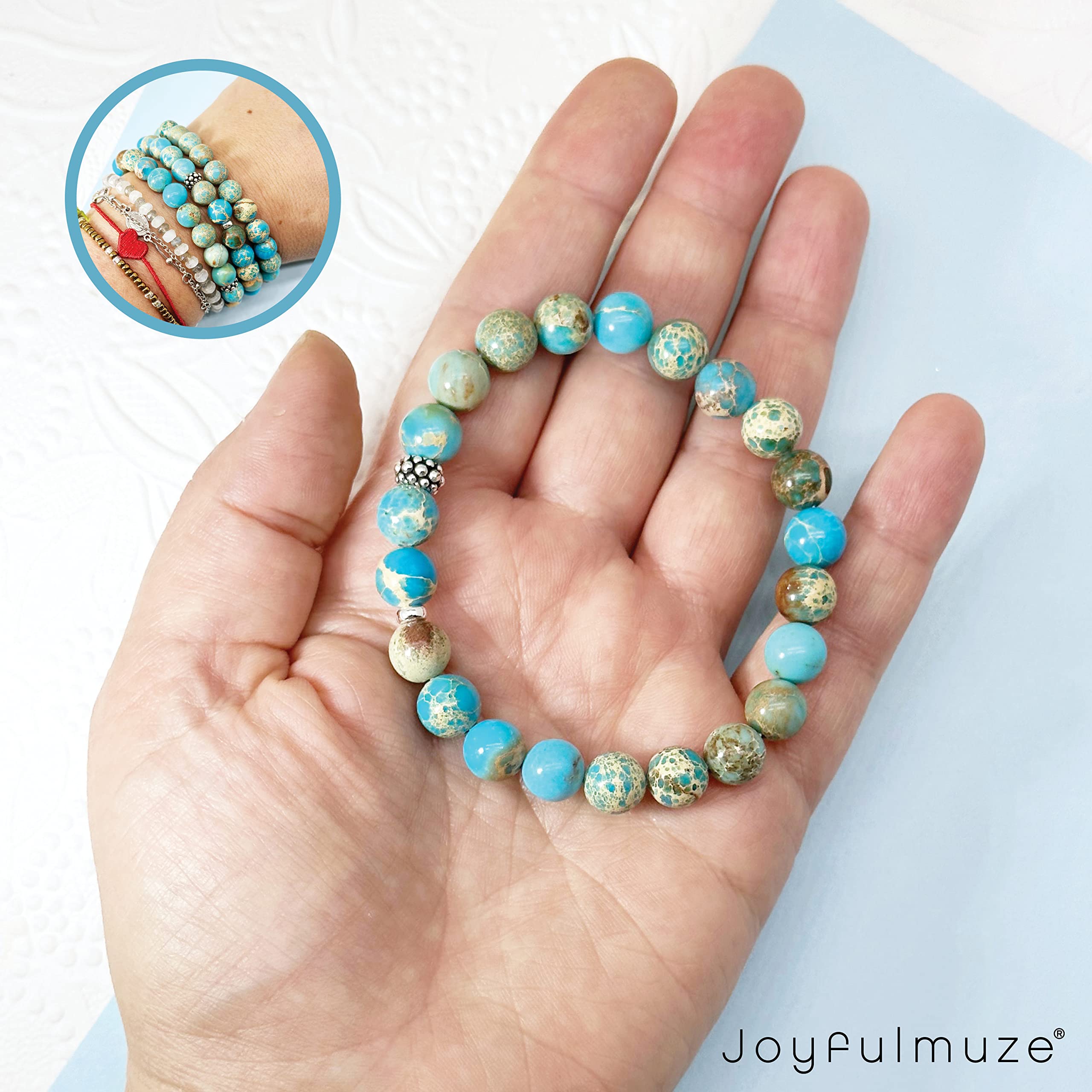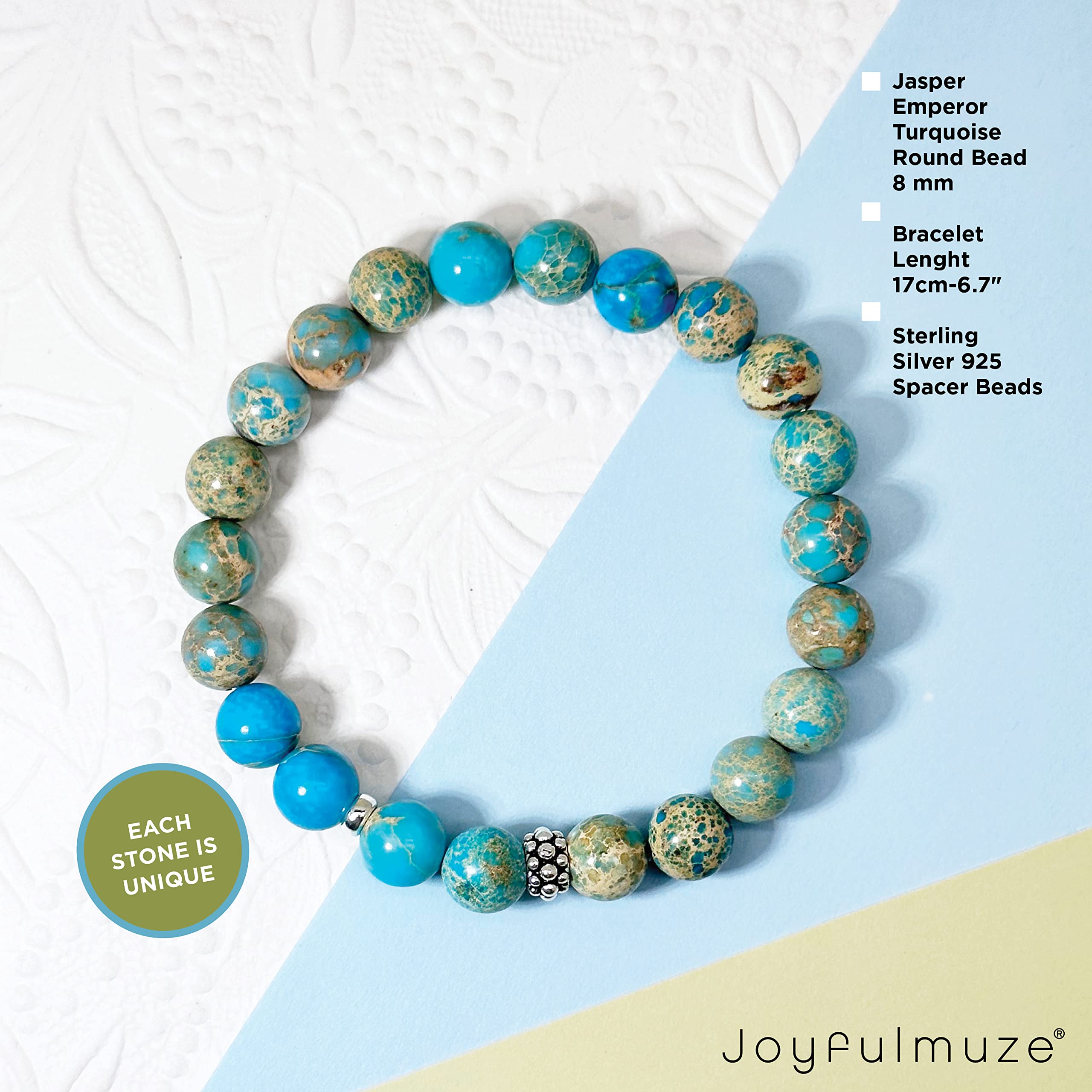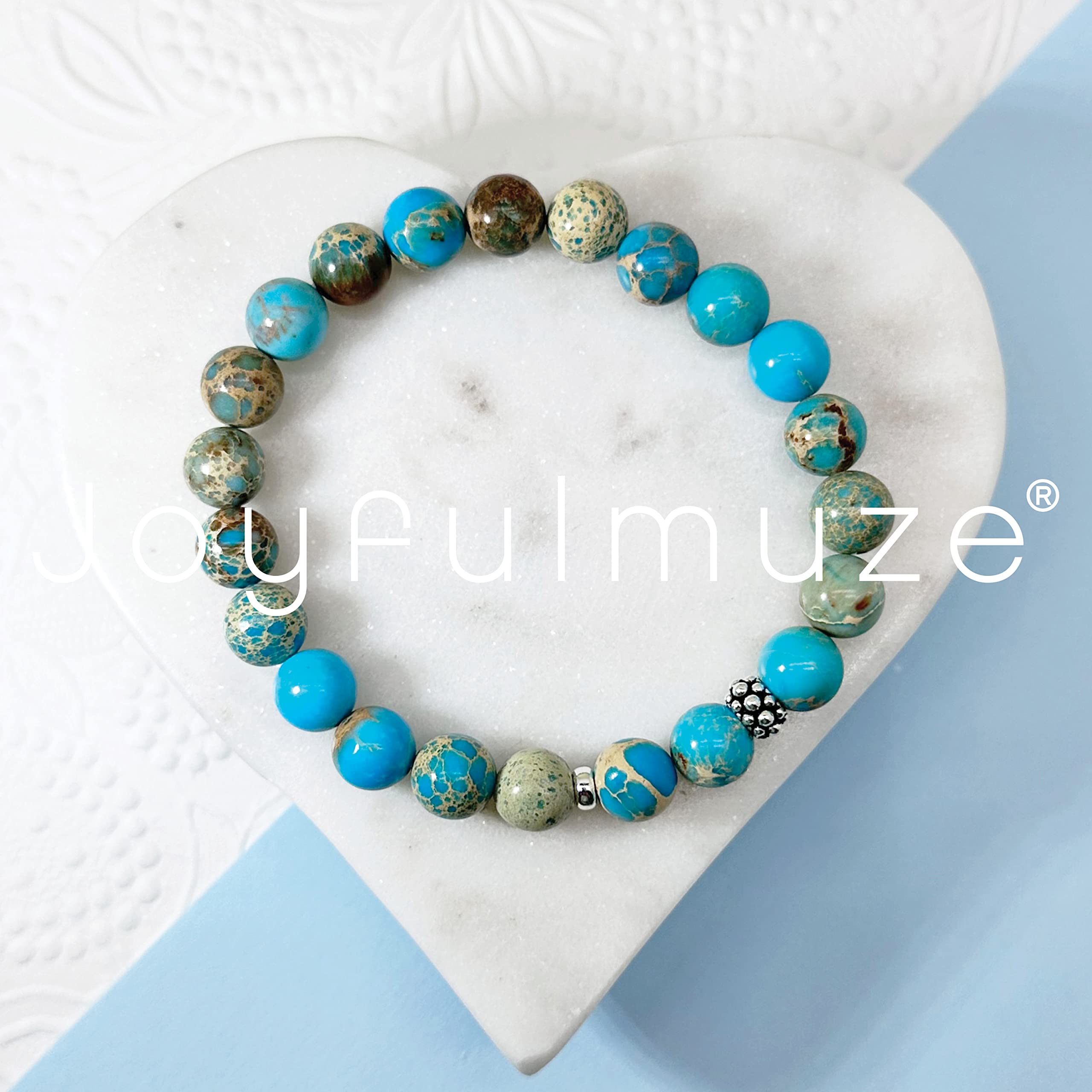 Why Choose Joyfulmuze Jewelry strong> Not only are you supporting a local artist but you are also buying original high-quality handmade jewelry. My beads are ethically sourced from Fair Trade suppliers so that you can love how your jewelry looks, and how it's made. Handmade with love and attention to detail, these natural stone jasper and sterling silver 925 spacer modern beads and round 8mm high polished smooth beads. This calming blue bracelet will flawlessly complement your everyday style. A good healer. It also fights against water retention and relieves hernia problems and is often used for stomach aches. It is used for problems of thyroid, cystitis, hyperglycemia, kidney and bladder disorders. The Turquoise Jasper would also act in cases of diarrhoea, irritated colon, colic and epilepsy. It strengthens liver function and the gastrointestinal system. These natural genuine and good quality stone makes a wonderful gift for any occasion; Mother's Day, Christmas, Hanukkah, anniversaries, birthday, graduation, wedding, or other holiday gifts. Buy for yourself, friends, girlfriend, sister, mom, wife, aunt, grandmother, daughter, or just as a surprise to remind someone how much you care. Each stone is unique, please allow slight variations in size and thickness but always expect the same great quality! Specification: MATERIAL: Sterling Silver, Stone GEMSTONE: Turquoise Emperor Jasper STONE SIZE: 8mm WRIST FIT: 6.5-7" One pc per box HANDCRAFTED WITH LOVE by Joyfulmuze