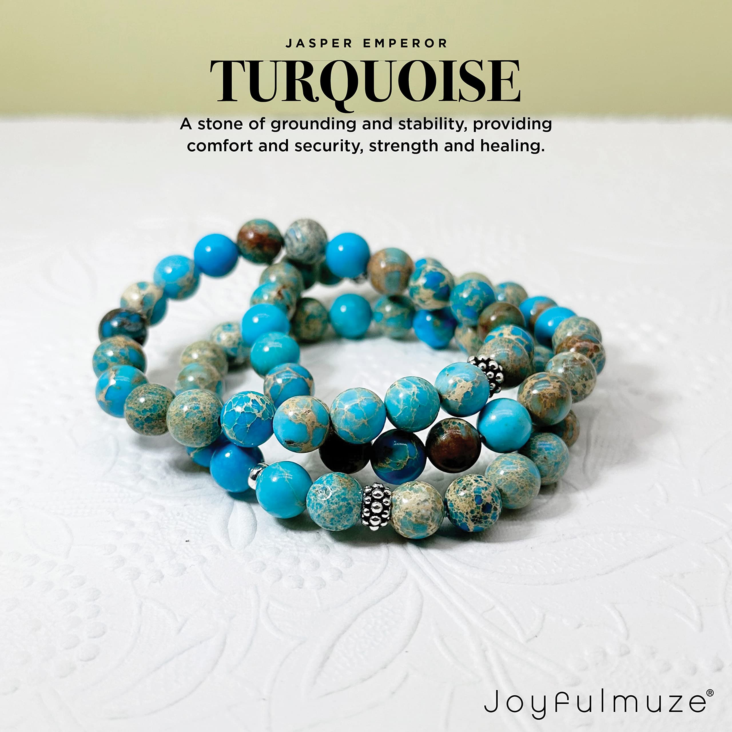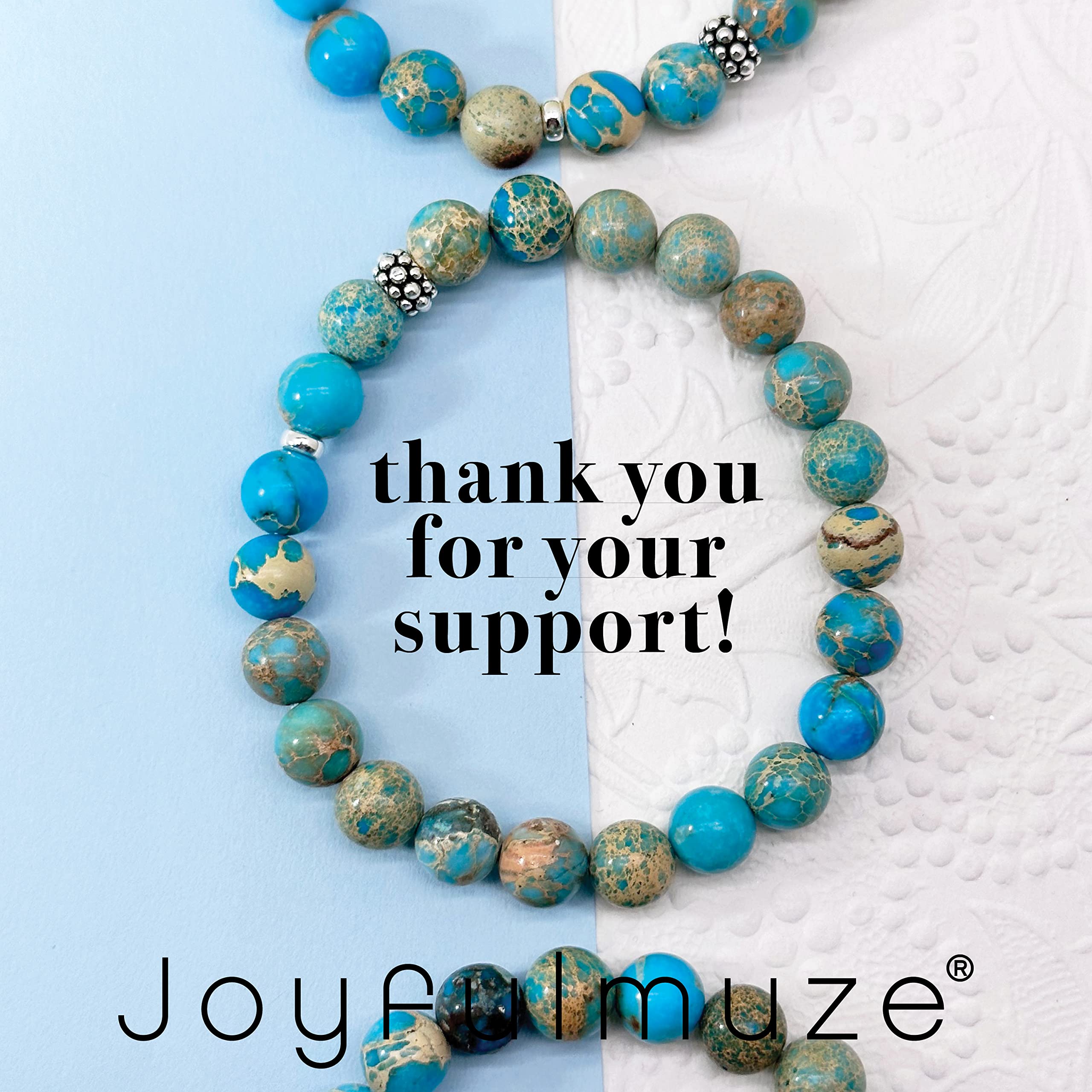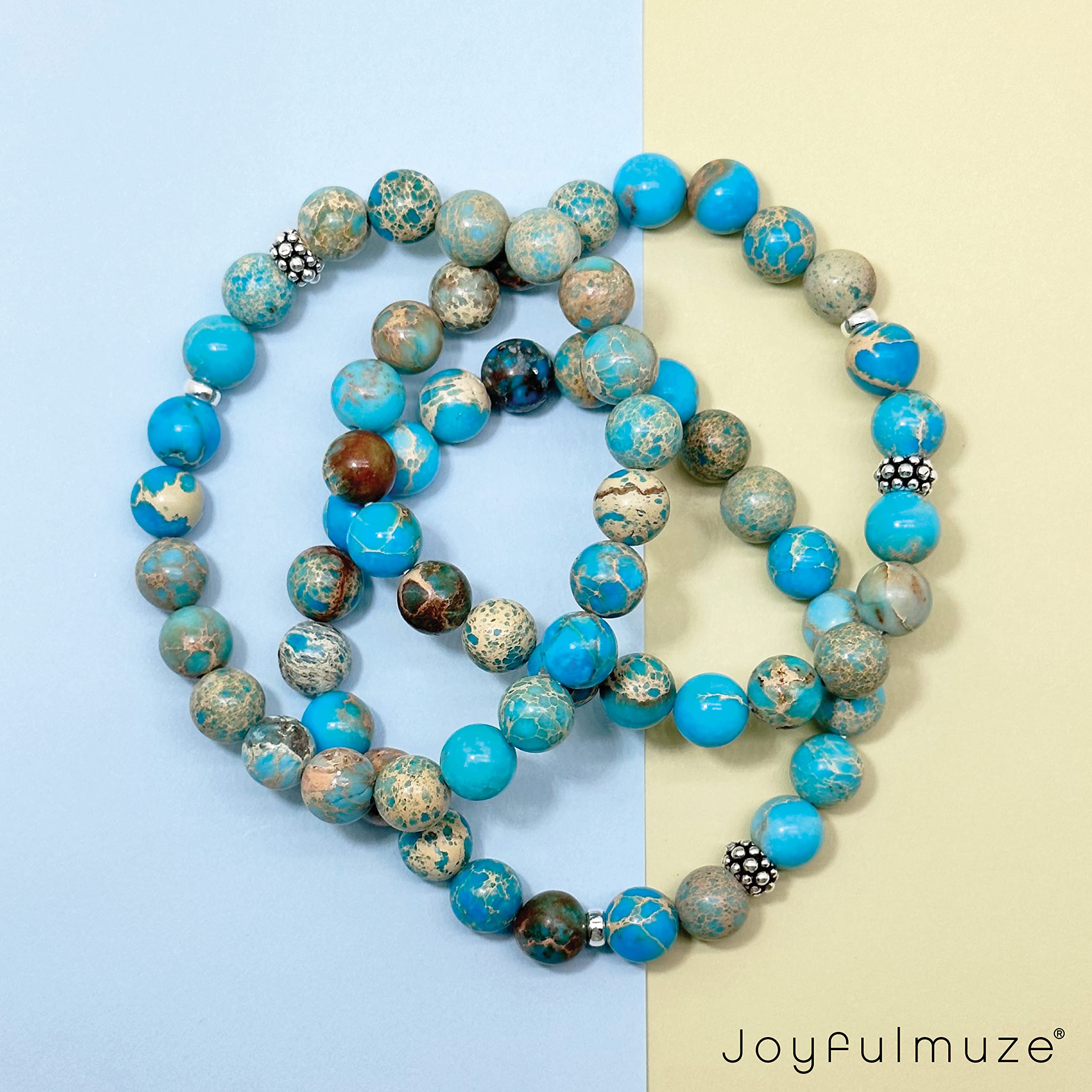 Why Choose Joyfulmuze Jewelry strong> Not only are you supporting a local artist but you are also buying original high-quality handmade jewelry. My beads are ethically sourced from Fair Trade suppliers so that you can love how your jewelry looks, and how it's made. Handmade with love and attention to detail, these natural stone jasper and sterling silver 925 spacer modern beads and round 8mm high polished smooth beads. This calming blue bracelet will flawlessly complement your everyday style. A good healer. It also fights against water retention and relieves hernia problems and is often used for stomach aches. It is used for problems of thyroid, cystitis, hyperglycemia, kidney and bladder disorders. The Turquoise Jasper would also act in cases of diarrhoea, irritated colon, colic and epilepsy. It strengthens liver function and the gastrointestinal system. These natural genuine and good quality stone makes a wonderful gift for any occasion; Mother's Day, Christmas, Hanukkah, anniversaries, birthday, graduation, wedding, or other holiday gifts. Buy for yourself, friends, girlfriend, sister, mom, wife, aunt, grandmother, daughter, or just as a surprise to remind someone how much you care. Each stone is unique, please allow slight variations in size and thickness but always expect the same great quality! Specification: MATERIAL: Sterling Silver, Stone GEMSTONE: Turquoise Emperor Jasper STONE SIZE: 8mm WRIST FIT: 6.5-7" One pc per box HANDCRAFTED WITH LOVE by Joyfulmuze