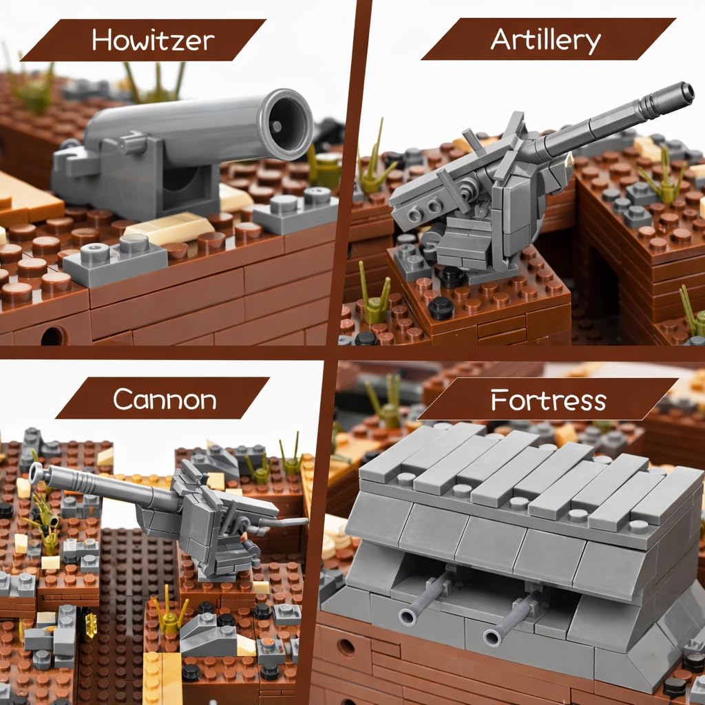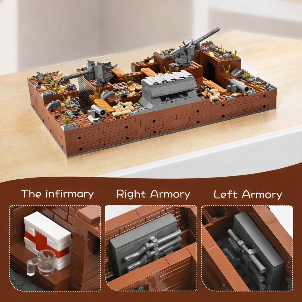 1️⃣Authentic WW2 trench scene restoration: This set includes detailed building blocks that military fortresses, bunkers, trenches, and anti-aircraft guns. It consists of six parts, each of which is very creative and challenging. The door of the fortress can be opened, and the base of the turret can be rotated. The house can accommodate minifigures for treatment, and the armory is equipped with firearms.