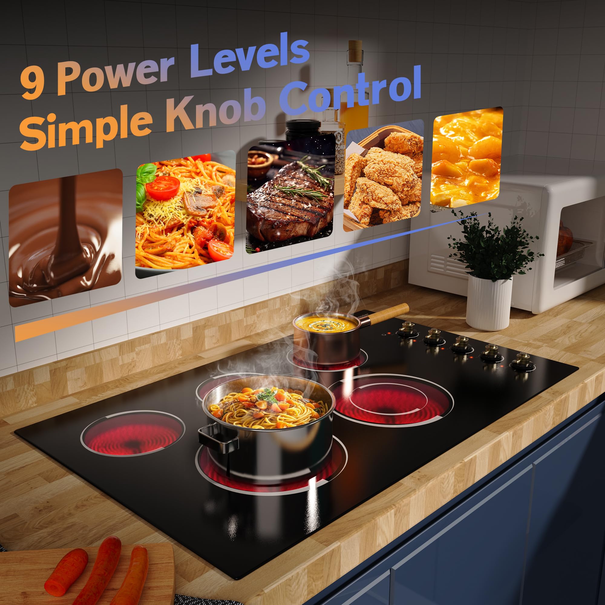 🏰| Safety 5 Burners Electric Cooktop | Jessier 36in electric stove is designed to meet US Norm specifications and has no electromagnetic radiation, harmless to the body. To ensure safety, Jessier ceramic cooktop is equipped with over-temperature protection, auto shutdown protection, and residual heat warning. A safety stove top is a great choice for pregnant women, mom, and the elderly.