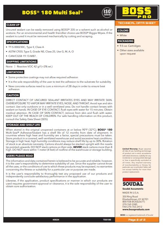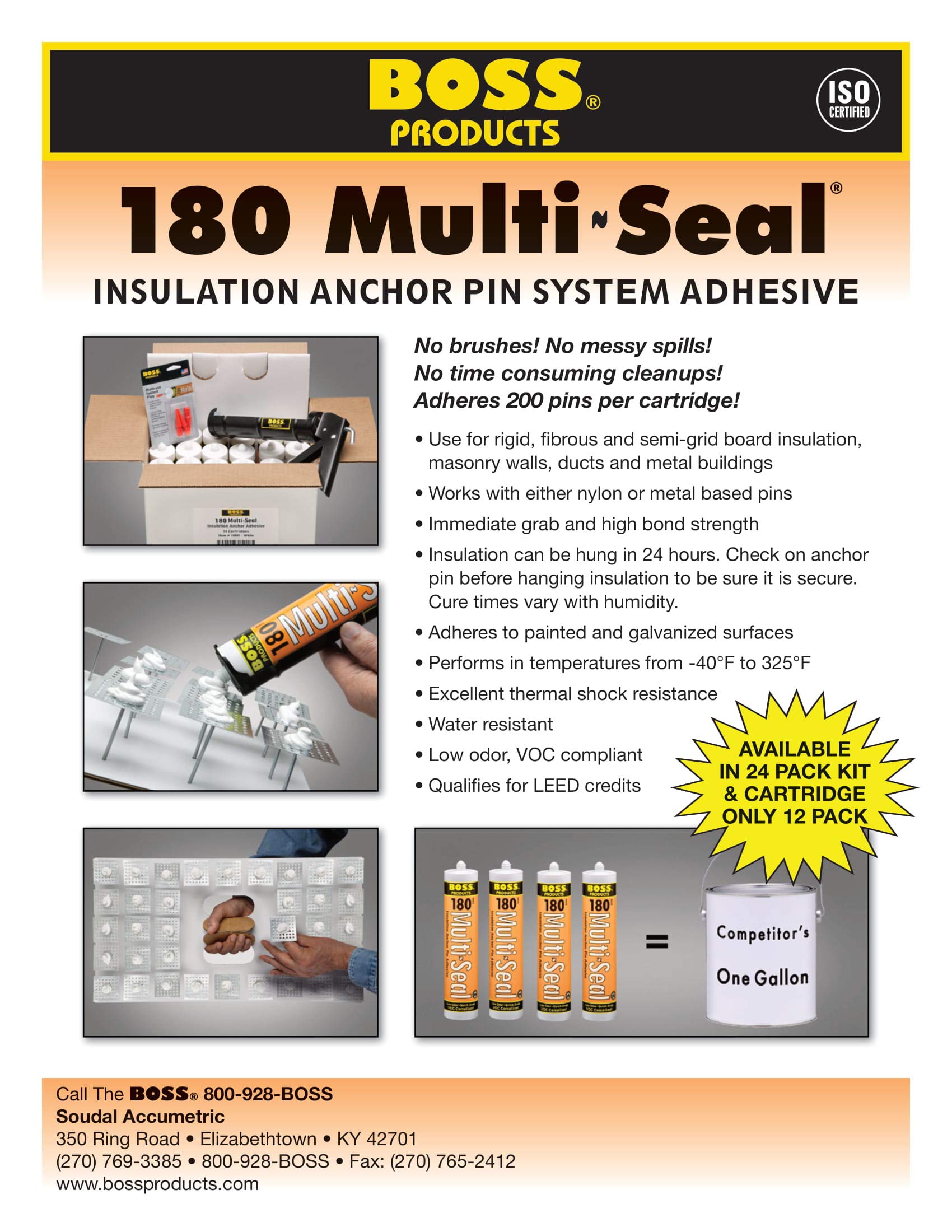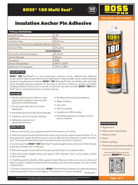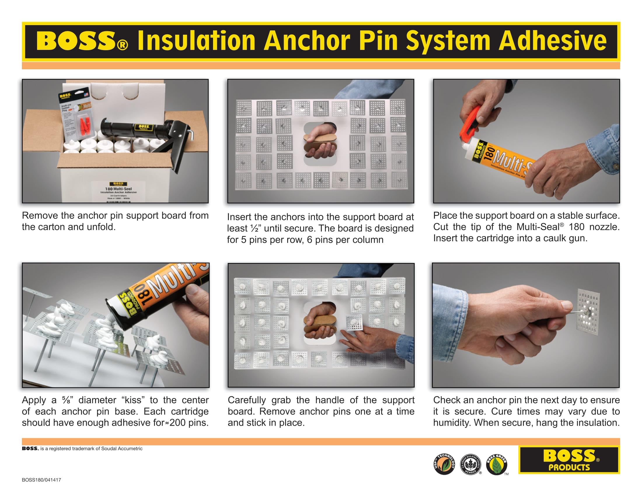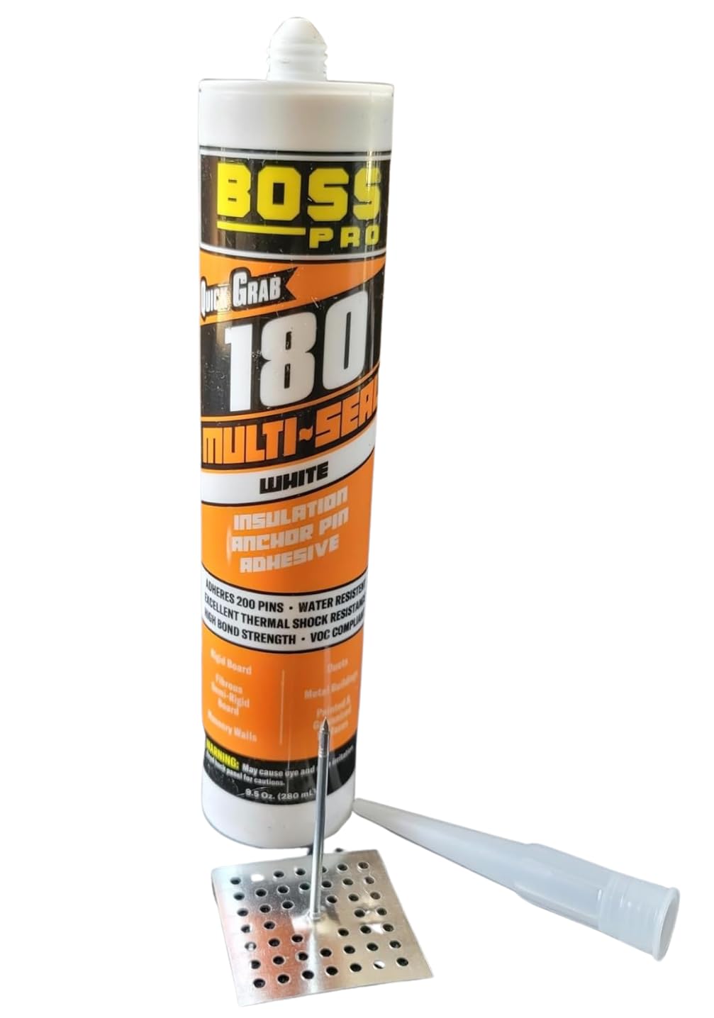 BOSS 180 Multi-Seal is a one component, moisture curing adhesive formulated with USP Technology for adhering anchor pins to rigid boards, fibrous semi-rigid board, masonry walls, ducts,metal buildings, painted and galvanized surfaces. BOSS 180 Multi-Seal has immediate grab and high bond strength allowing insulation to be hung in 24 hours. Check an anchor pin before hanging insulation to be sure it is secure. Cure times vary with humidity. BOSS 180 Multi-Seal forms a strong bond even on damp surfaces. Each tube covers approximately 200 pins.