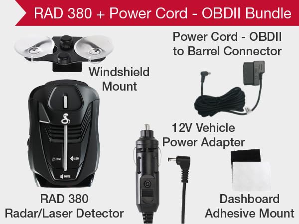 Everything You Need - The Cobra RAD 380 radar detector comes with a 12V vehicle power cord, suction cup car windshield mount, and a hook and loop fastener for dash mounting, for wherever the road takes you.
