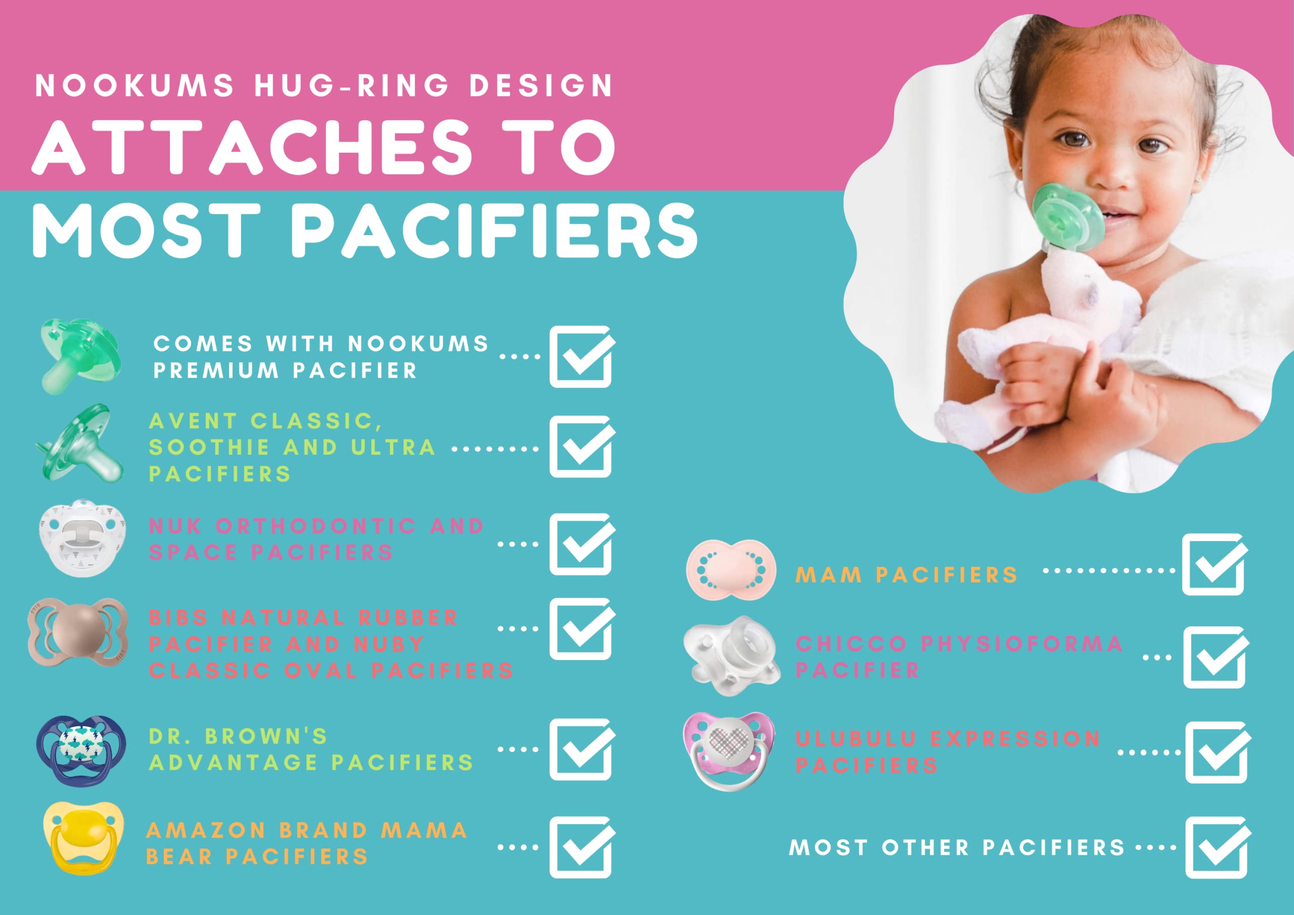 EASILY REPLACE PACIFIERS - Each Paci-Plushie includes a Nookums Pacifier that detaches from the animal for easy replacement & sanitation. Use our Nookums Pacifier or swap it out for your own. Paci-Plushies Pacifier Holders have a flexible Hug Ring that attaches to a variety of baby's favorite pacifiers and is compatible with: Mam, Avent, NUK and many more. Please Note: Paci-Plushies are compatible with most but not all pacifiers. Paci-Plushies work best with pacifiers that have a button shield