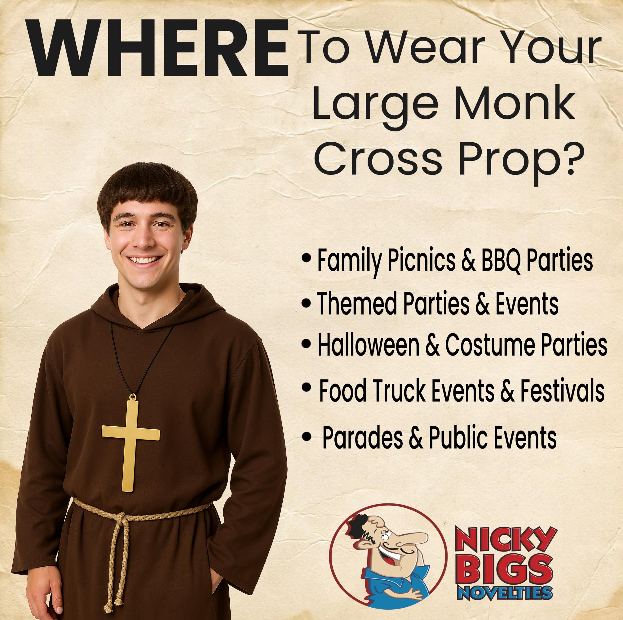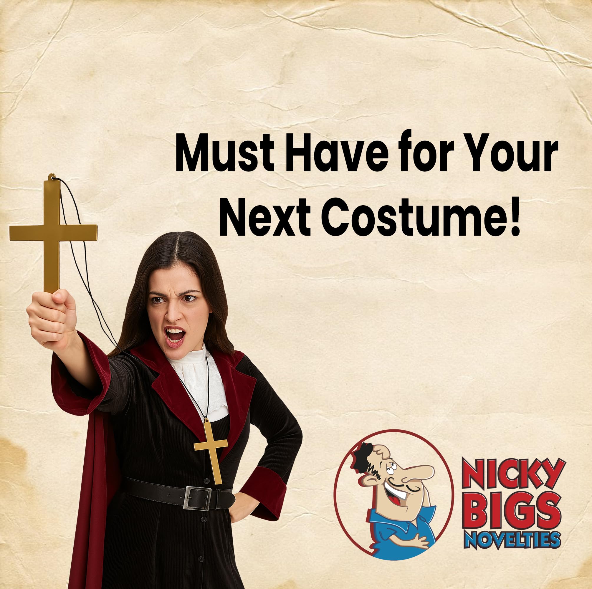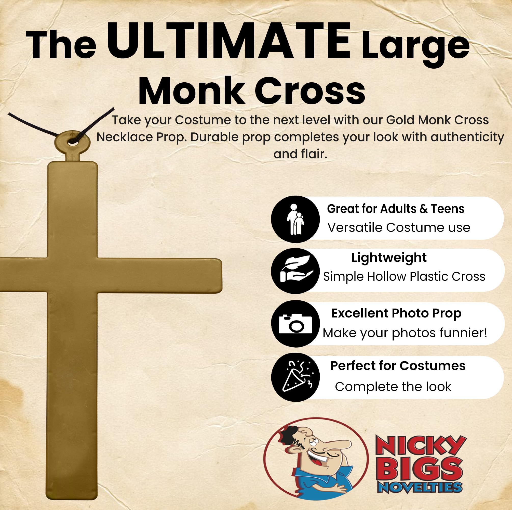 Cosplay Religious Accessory – Add realism to your priest, monk, nun, or pope costume with this classic gold cross necklace, ideal for Halloween, cosplay, and stage performances.