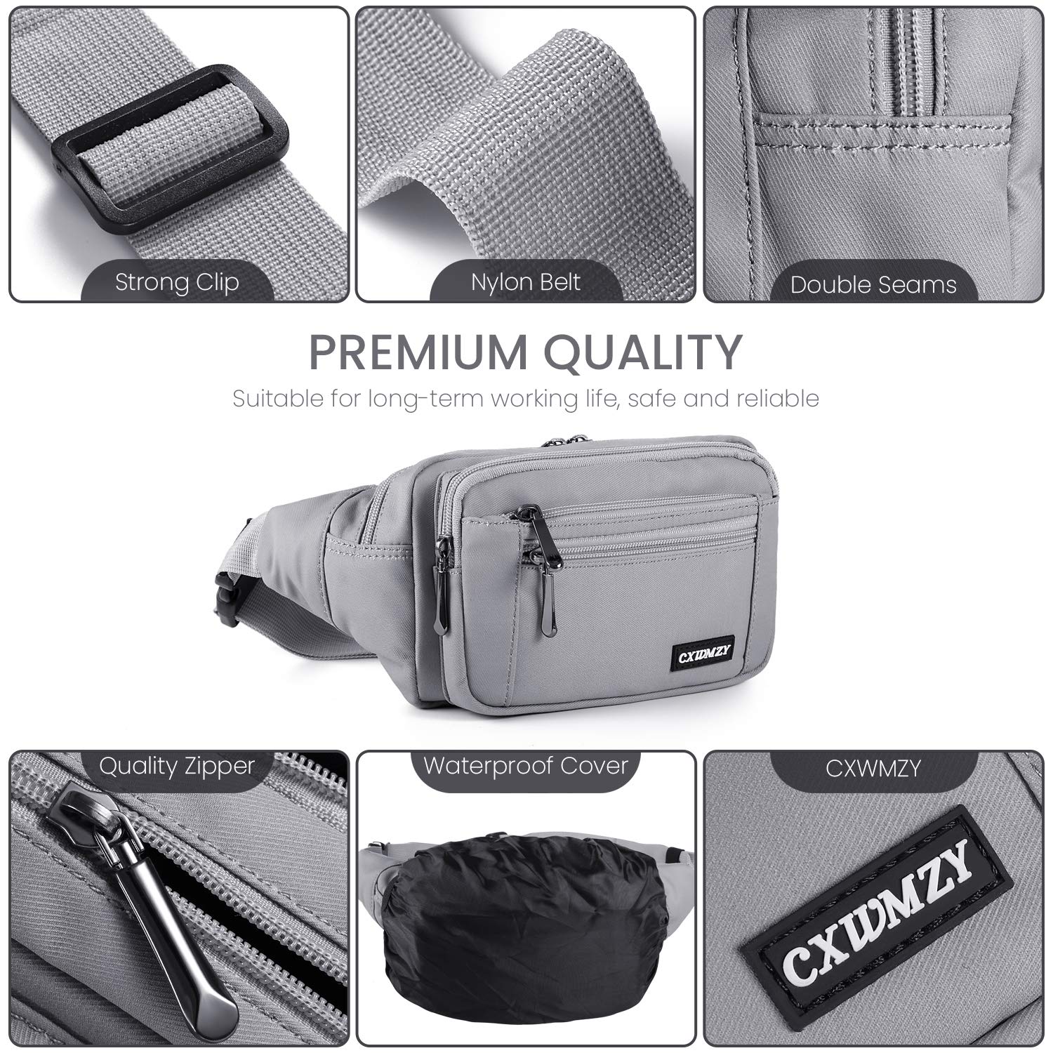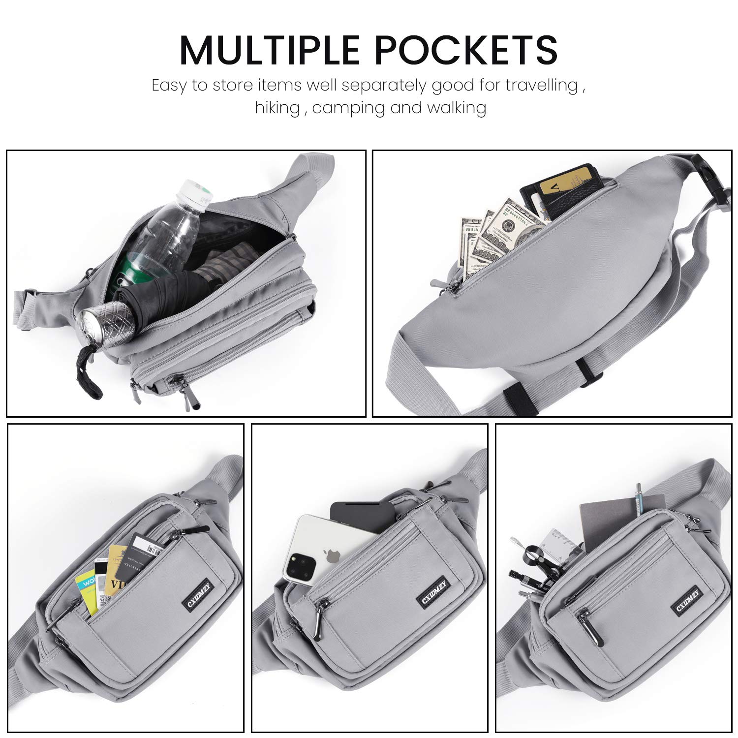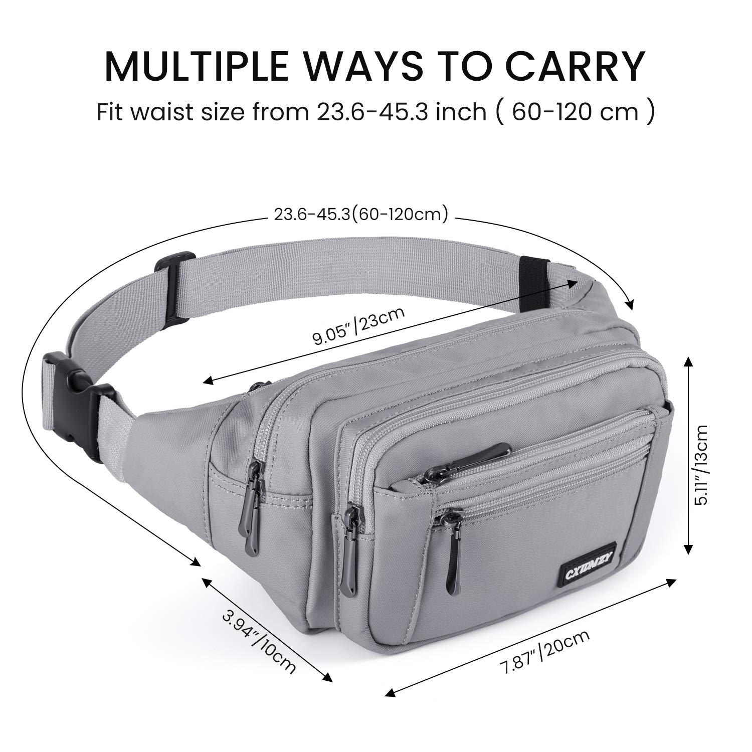 Description Why choose us? CXWMZY is a professional fanny packs product supplier focused on providing a wide range of quality, stylish and attractive products to help improve the quality of life for our customers. We are committed to improving our customers' online shopping experience. Functional, High quality, Easy Length: 7.87 inch / 20 cm Height: 5.11 inch / 13 cm Width: 3.94 inch / 10 cm Material: 1200 D Nylon Large Pocket Waist Circumference: 23.6 to 55 inch / 60-145 cm The CXWMZY fanny packs is a great way to go hands free. This nylon hip bag is perfect for biking around town, festivals, fairs, concerts and farmers markets. Created with a simple design which blends with any style closed with a sturdy zipper. The bag can carry a phone, cash, cards plus a few other essentials and can be worn on your hip, over the shoulder or tight under your arm. Large Capacity Enough space for your wallet, keys, CARDS, phone, Umbrella, 500ML water bottle Easy to get your stuffs organized. Fine Work With excellent stitching, the bag is strong and hard enough to pack your stuffs anytime. Durable Zinc Alloy Electroplated Nickel Zipper Head, High Quality Zippers, ensure your long lasting use. High quality, easy to use, will not break, use more times, Long life. CXWMZY fanny packs with high quality materials This wasit pack is made of top quality materials. The nylon ripstop, 100% Polyester Fabric lightweight, water repellent and durable. Suitable for all kinds of places Used in various occasions, this fanny packs is perfect for anyone, young and energetic, such as cyclists, runner, trainer, camper, hiker, climber, cycler, hunter, fishing, etc. Recommend to your favorite friend! 100% NO-RISK PURCHASE, ADD TO CART NOW!!!