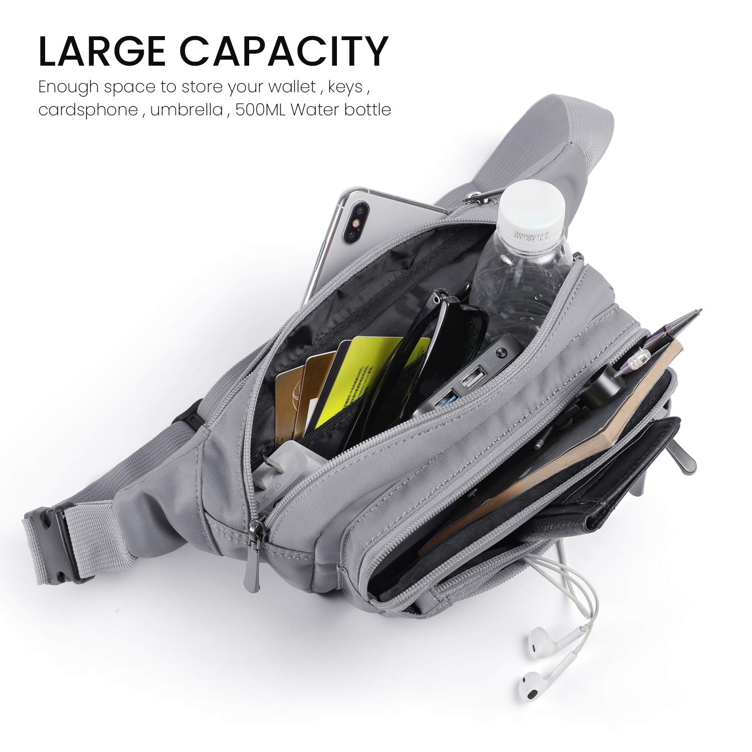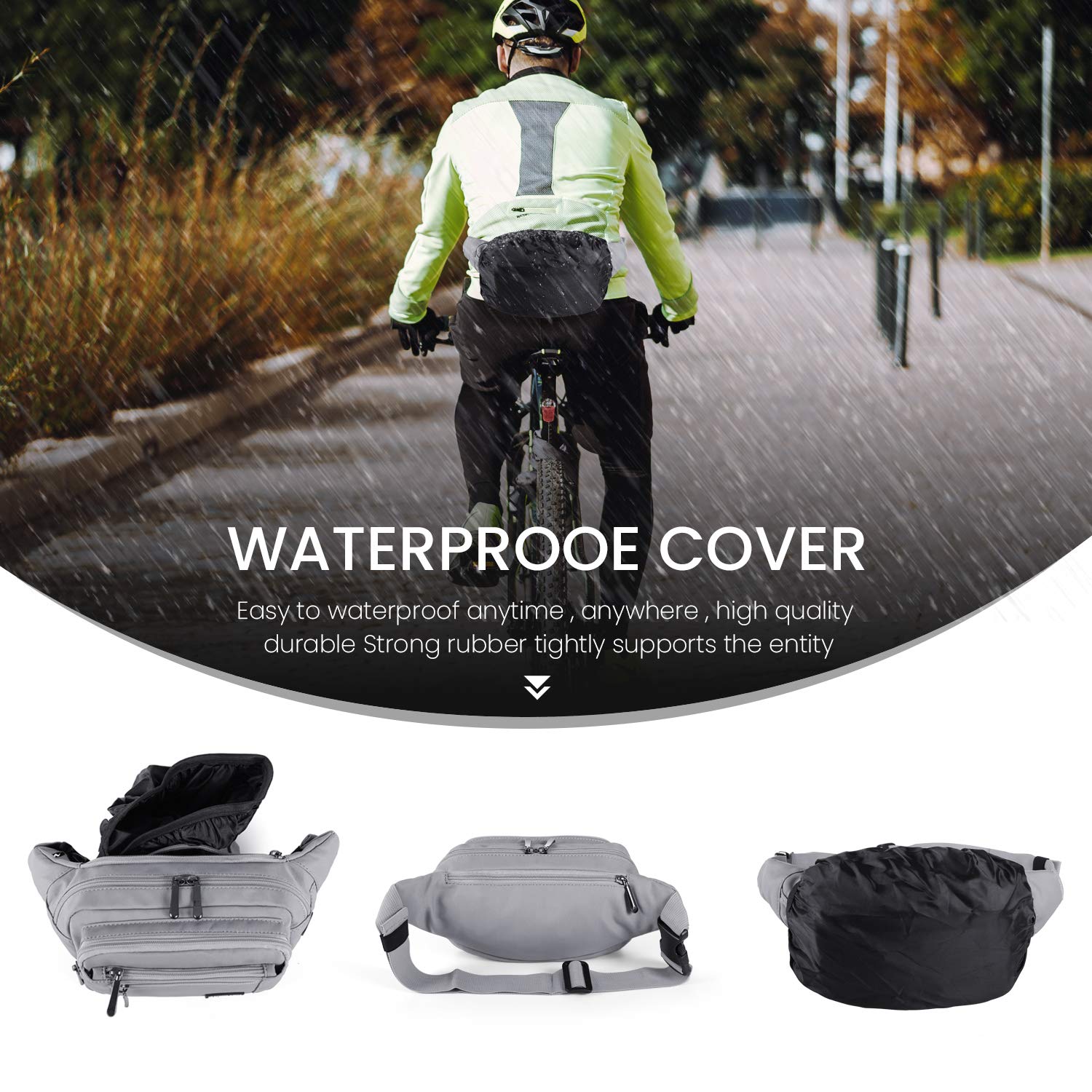 【6 MULTI-POCKET DESIGN】Our fanny packs for women & men will keep your hands & pockets free! 5 zipper pockets of different sizes and a hidden zipper pocket design, hidden zip perfect give your valuables extra security, all your needs. The largest pocket can easily accommodate a standard water bottle. A zippered exterior pocket located behind the waist band with Rain Cover it can better protect important items in rainy days.