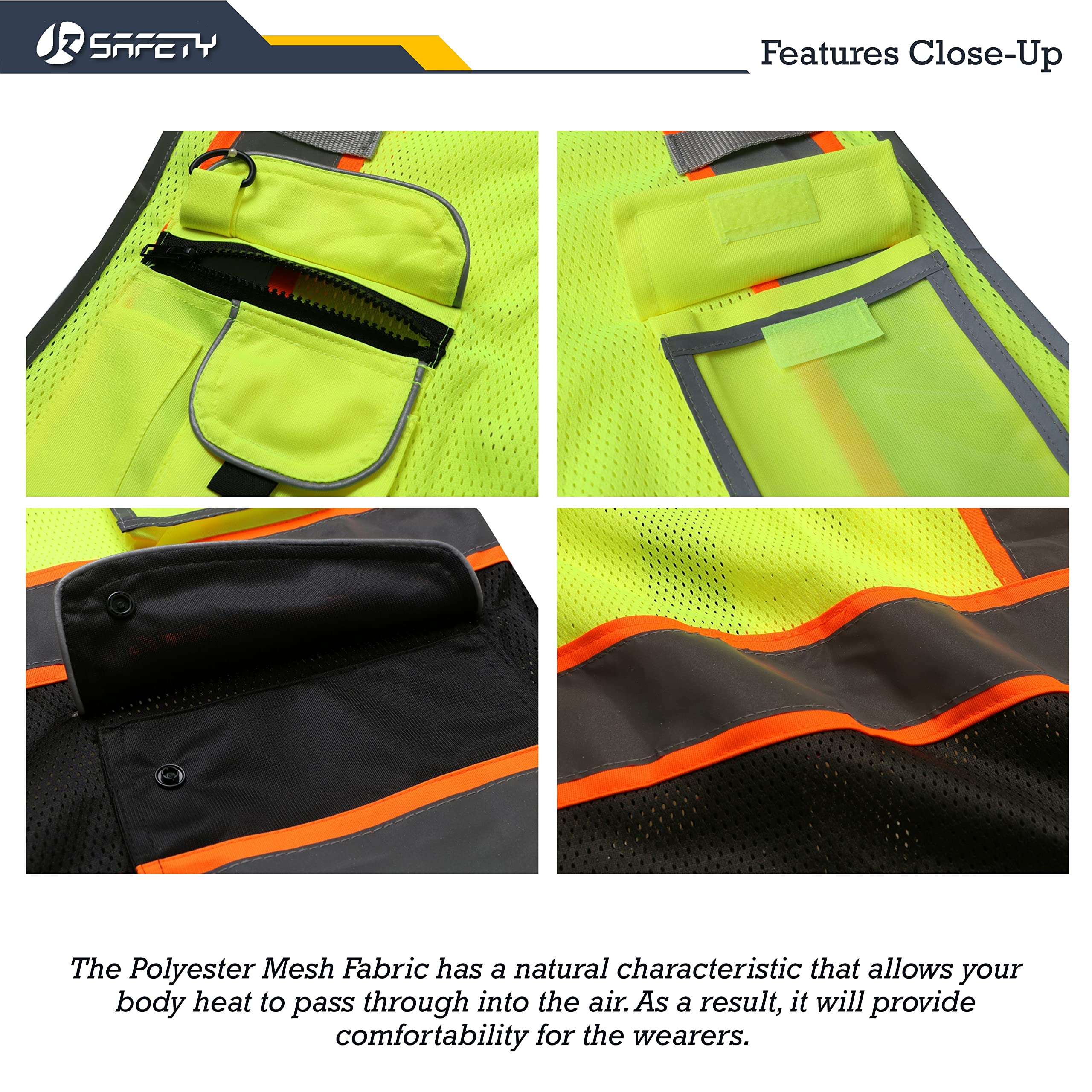 HIGH VISIBILITY AND 360° REFLECTIVITY: Neon Yellow and Black dual body color safety vest is highly visible with Four 2-inches wide Orange color trims reflective strips covering the chest, the waist, and the back, she can reflect 360 degrees Retro-Reflective light wave under daylight or low light conditions.