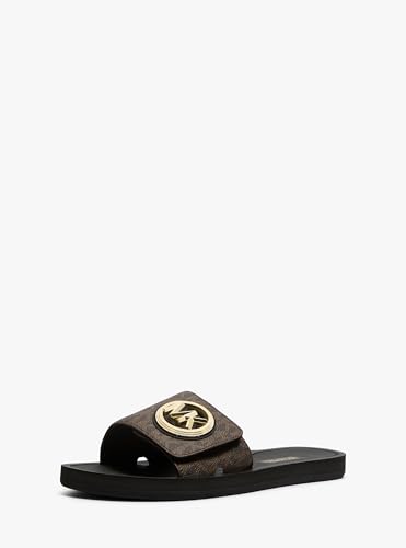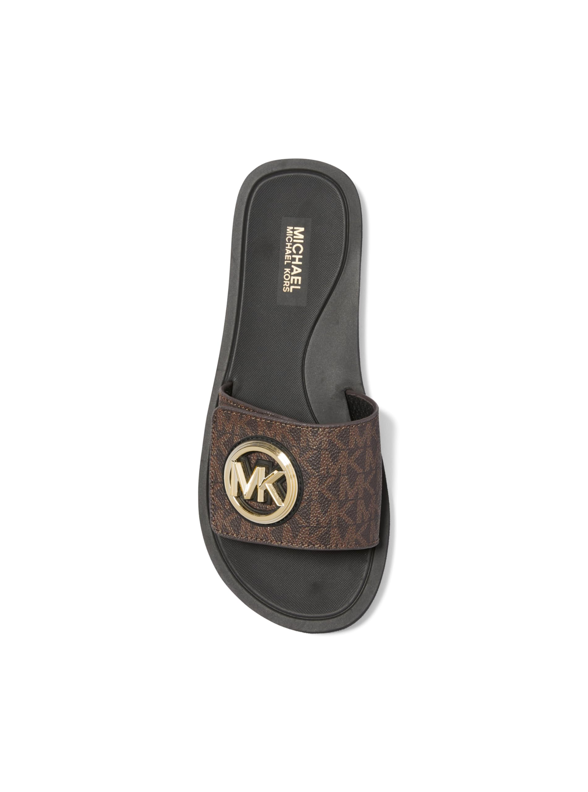 Description Pool slide sandal with MK circle stacked charm hardware on molded footbed.