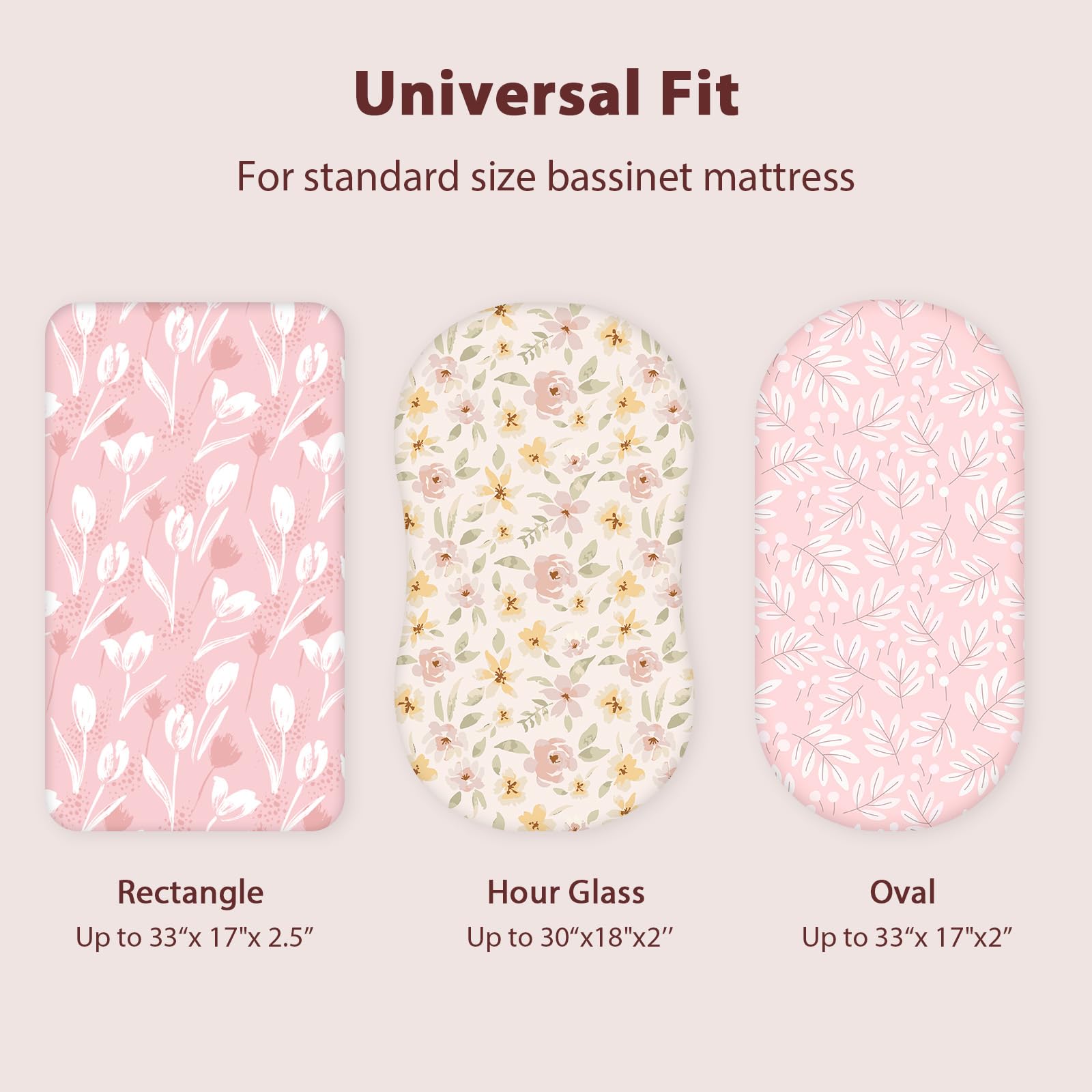 Perfect Size: Measured 32"x16", universal bassinet sheets snugly fit for most popular mattresses, such as standard oval, round, rectangular, and hourglass. 5-Inch pocket provides full coverage and protection for your mattress.