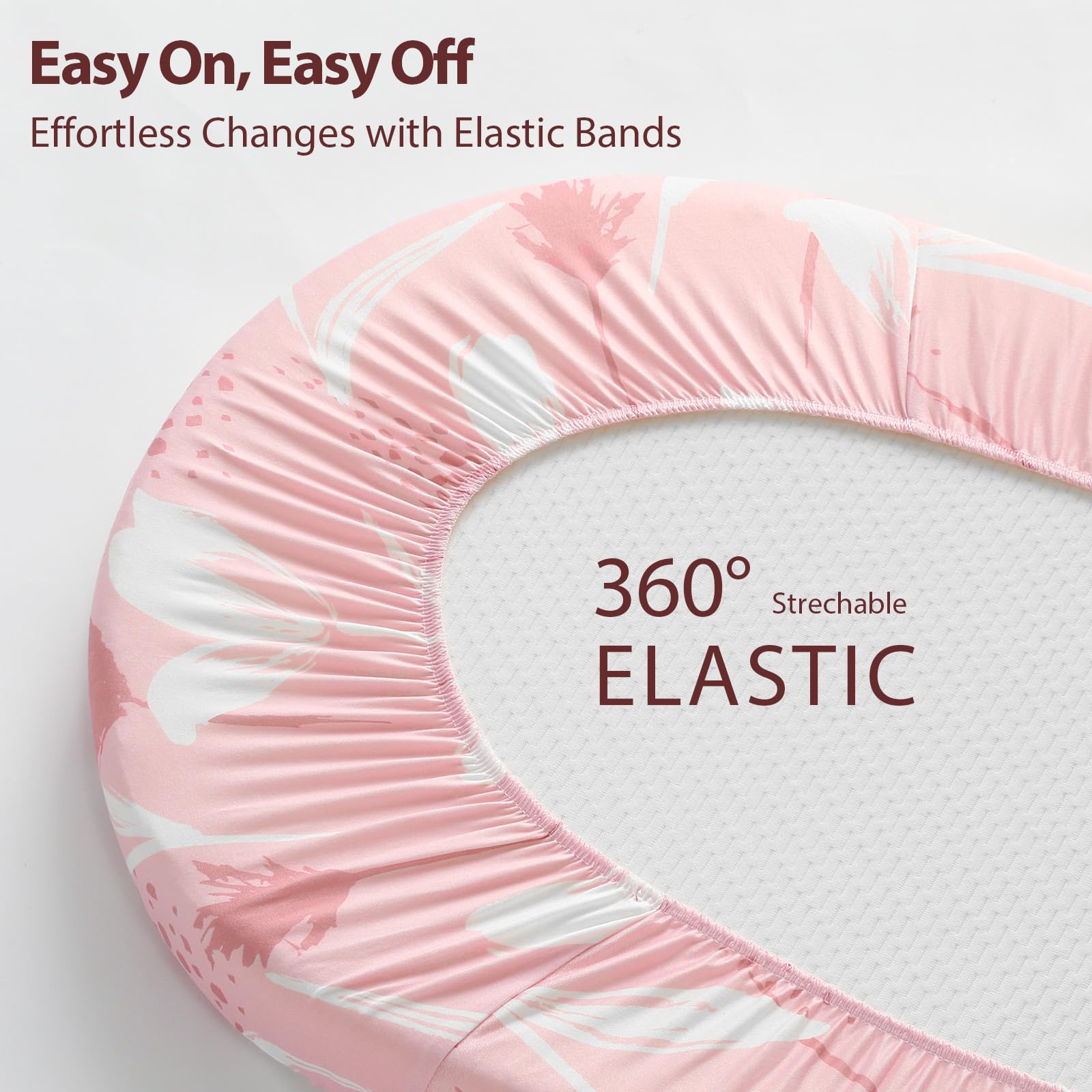 Effortless Installation: With 4-way elastic design around the edge, these bassinet sheet easy to put on and off your crib mattress. The stretchy and durable band keeps the baby sheets for bassinet securely in place, perfect fitting without any loosening or slipping away, so moms can avoid frequently adjusting crib mattress sheet and promote parental joy and simplify parenting.