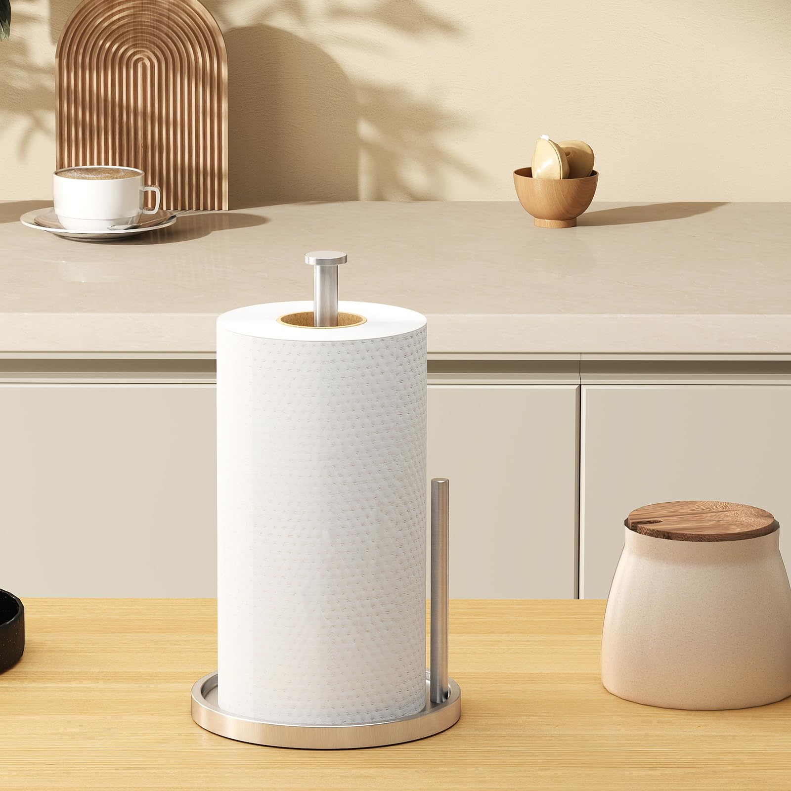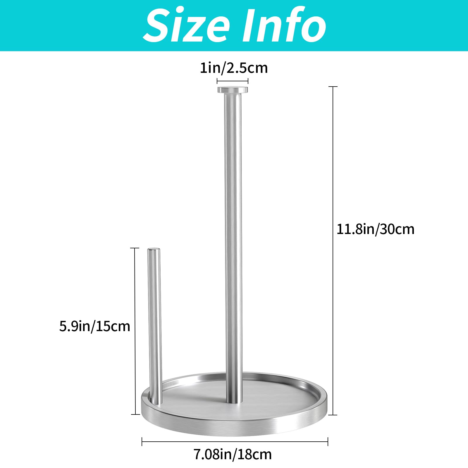 [Ideal Size] The paper towel stand is 12.4" tall with a 7.1" base diameter. Its compact design saves space, making it perfect for small spaces or countertops. Ideal for kitchens, half bathrooms, and areas with limited storage, it fits all standard and large paper towels