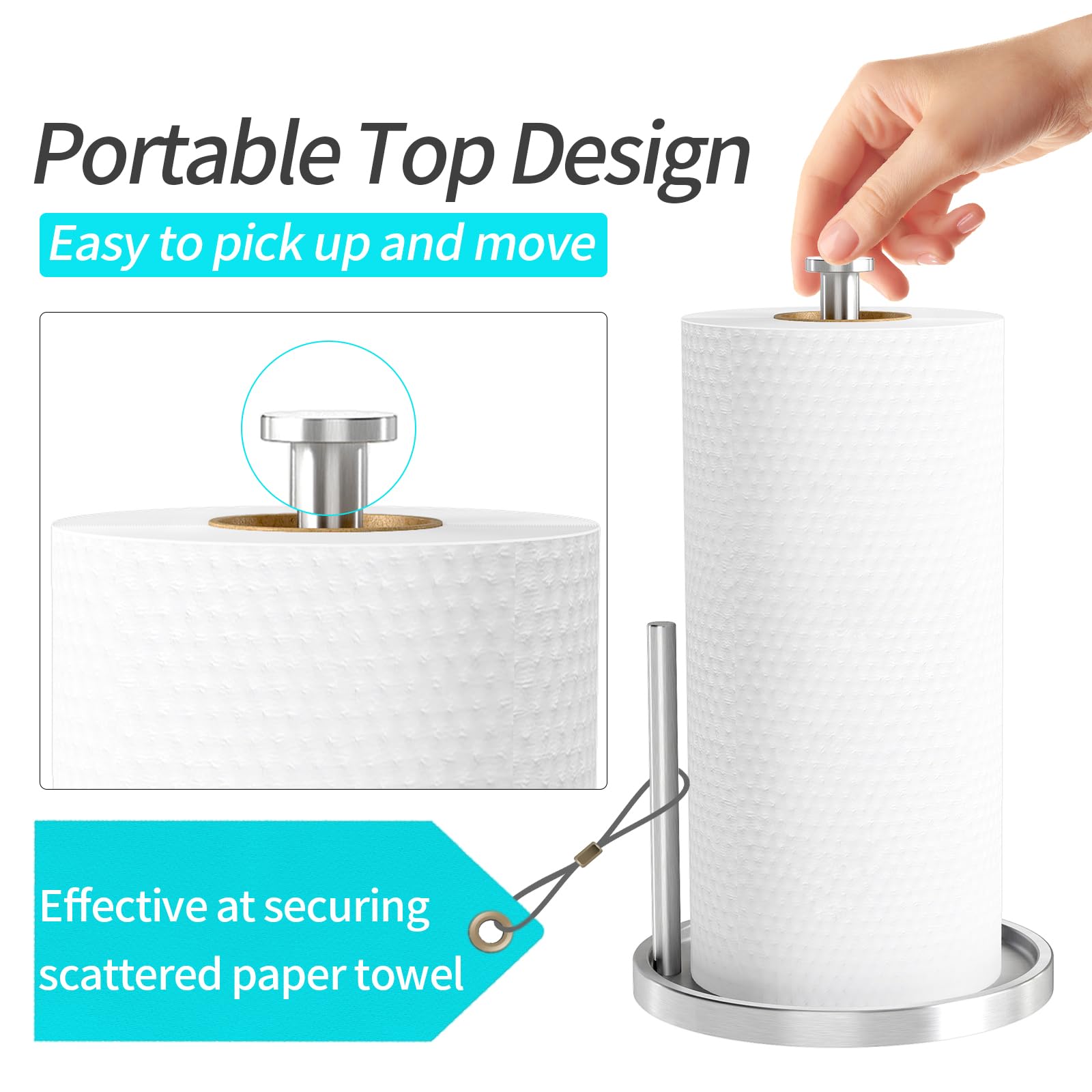 [Portable Top Design] This freestanding paper towel holder adopts a widened top design, which makes the top a handle, greatly increasing the portability, so that you can easily pick it up and take the paper towel holder to anywhere you need it, such as the kitchen or bathroom
