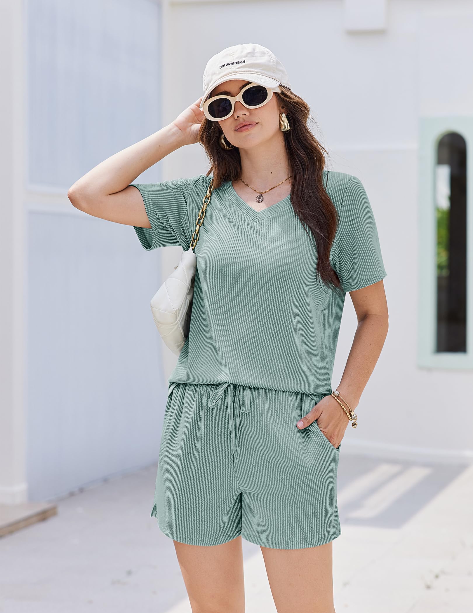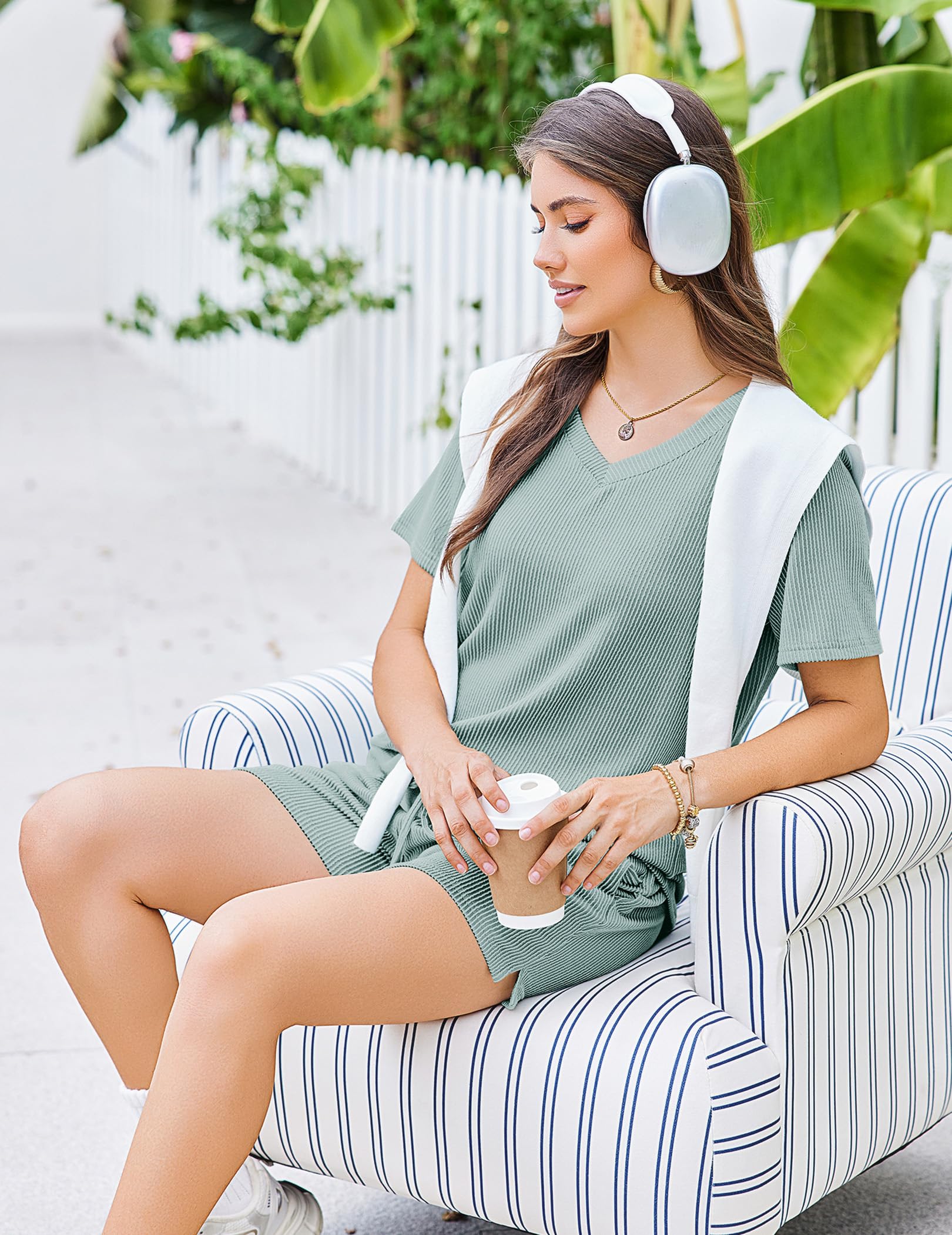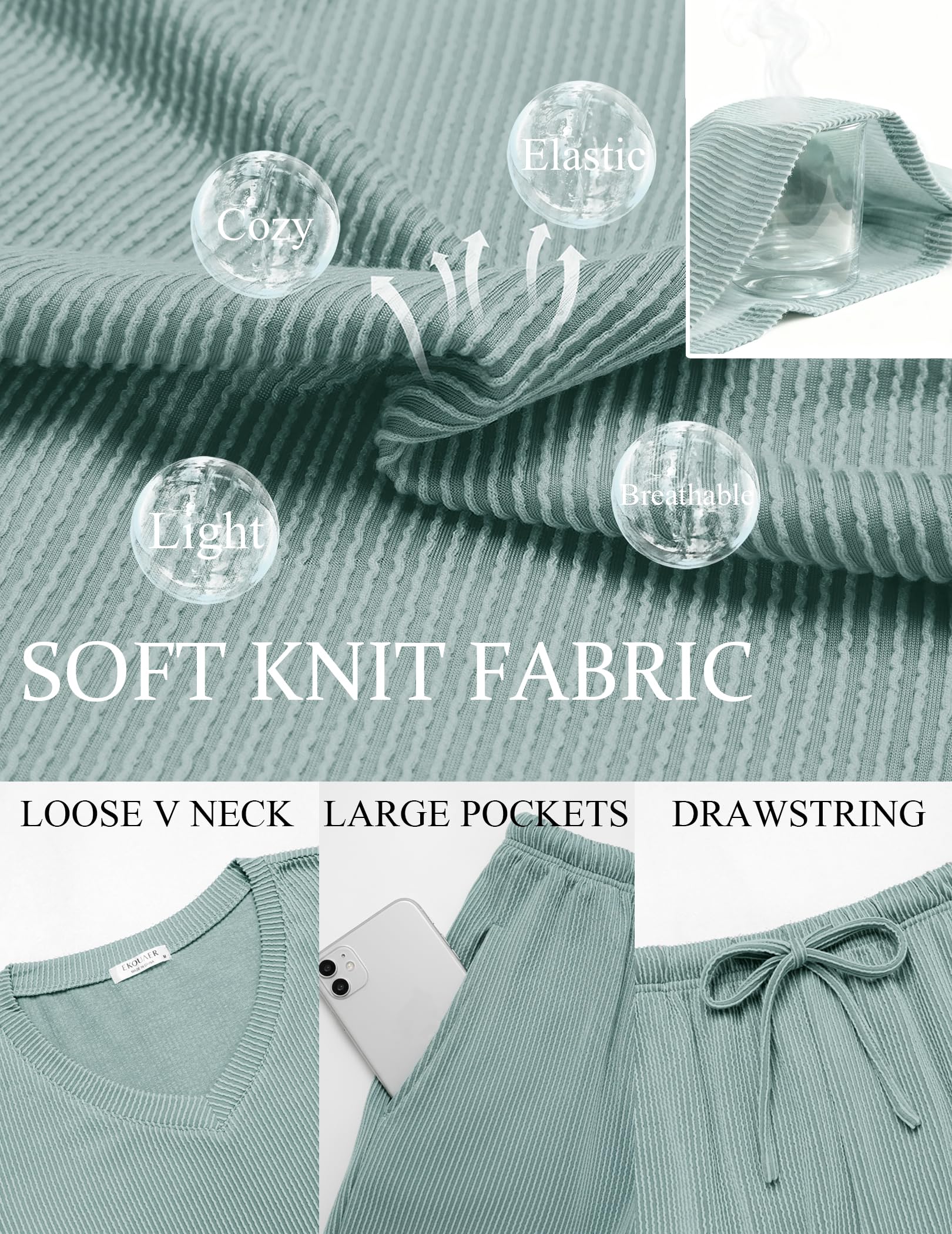Short Sleeve Tops: Elegant Lounge Sets feature a flattering V-neck design with a relaxed, loose-fitting silhouette that celebrates every body type. The casual style ensures a comfortable, effortless fit for women of all shapes and sizes