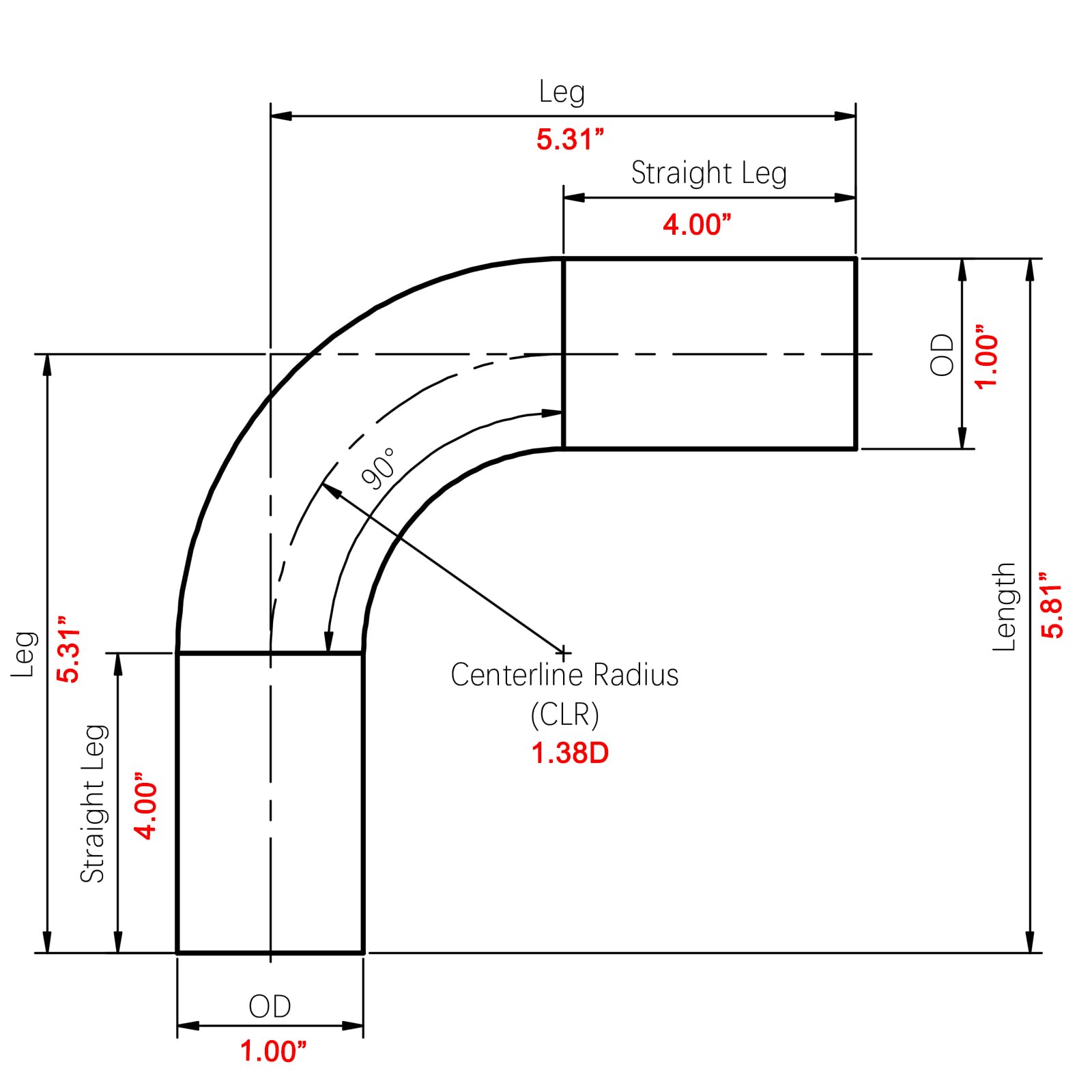 90 Degree bend, outside diameter: 1" (24.8mm-25mm), Leg Length: 4" (100mm), wall thickness: 0.059" (1.5mm)