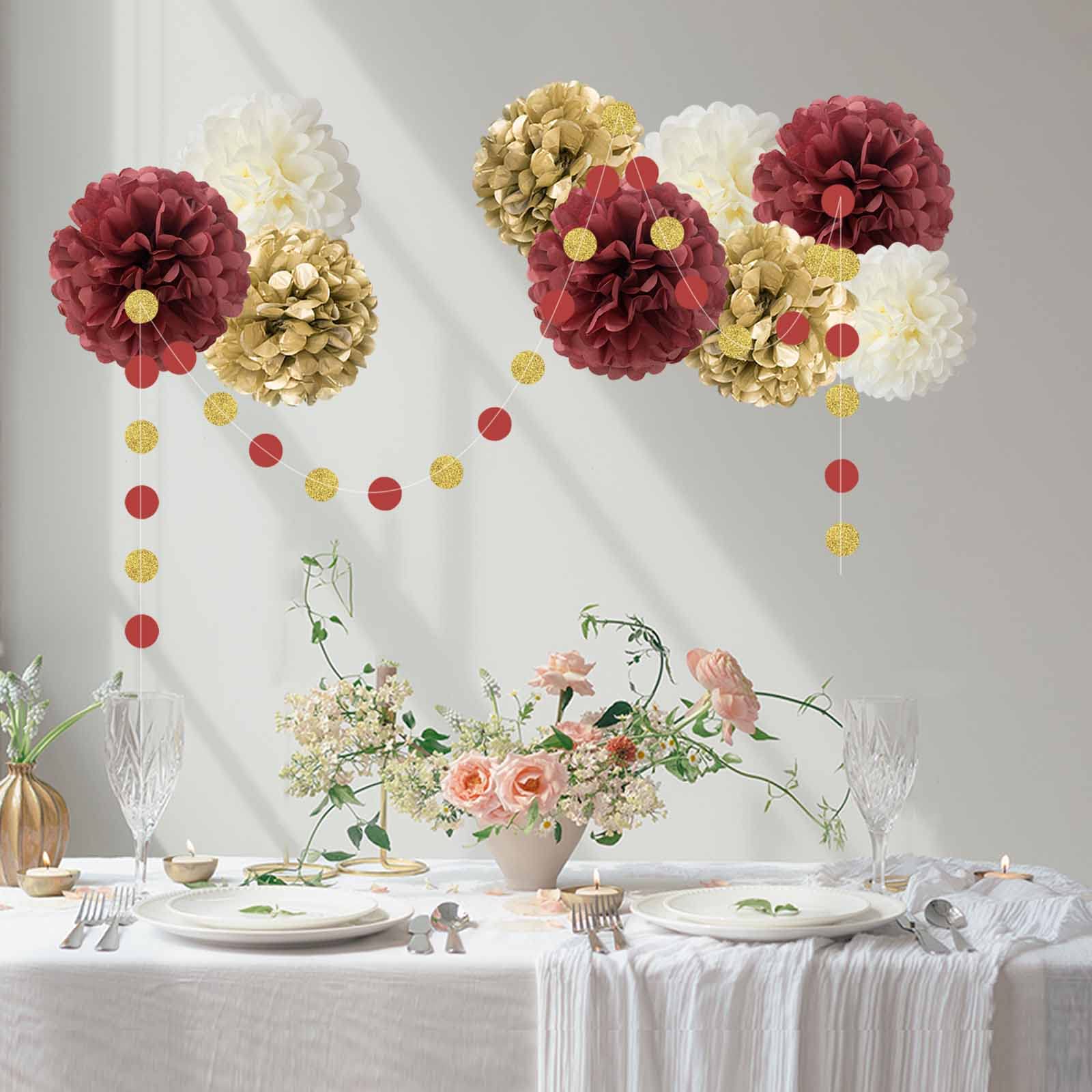 Burgundy maroon wine dark red and gold party decorations. 10 inch Pom poms: burgundy 3 pcs, ivory 3 pcs, gold 3 pcs. 8 inch Paper Lanterns: burgundy 2 pc, gold 1 pc. 10 inch Paper Fans: burgundy 2 pc, gold 1 pc. 8 inch honeycom balls: burgundy 1 pc 6.5 ft polka dot garland. Great for birthday, baby shower, bridal shower, wedding, anniversary, graduation, bachelorette party, engagement parties, etc
