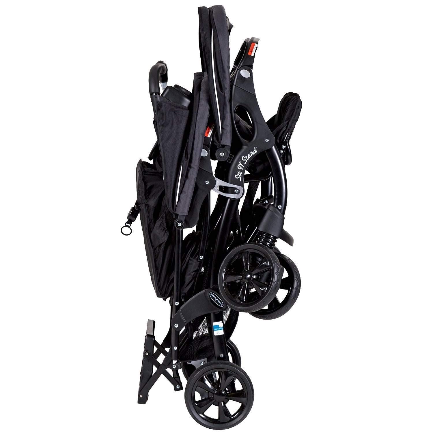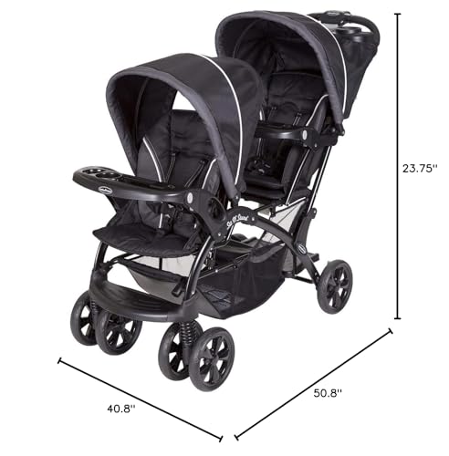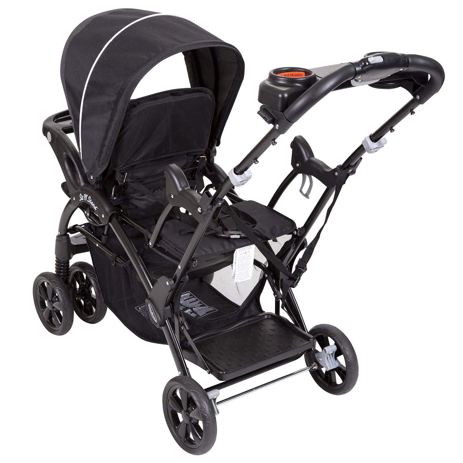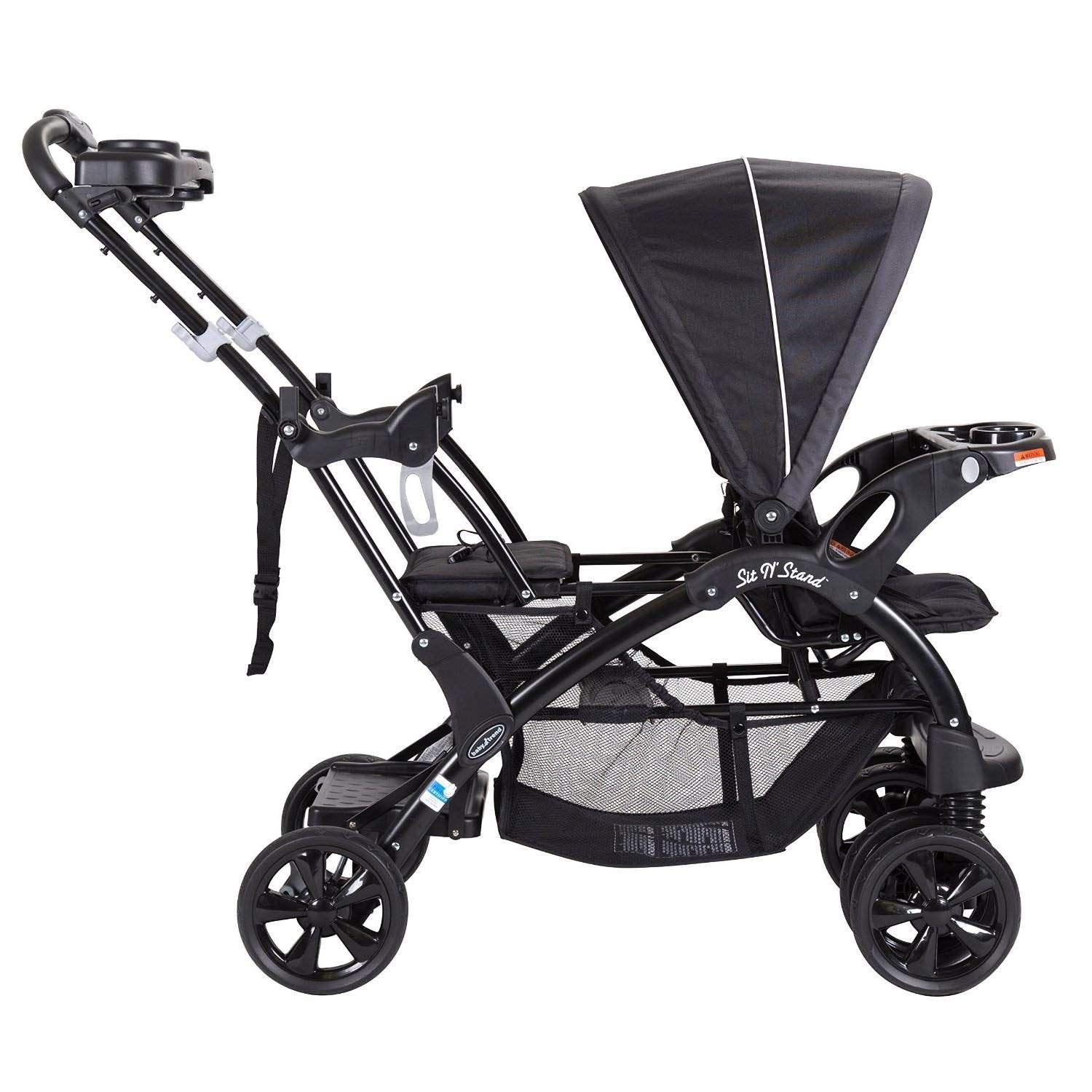 Experience the ultimate in versatility with the Sit N’ Stand Double Stroller from Baby Trend. It comfortably seats two children, and the rear seat can be removed for use of the included jump seat or standing platform. The two ratcheting canopies provide excellent sun protection for both of your passengers. The parent tray features 2 cup holders and a covered storage compartment for small incidentals and the roomy storage basket holds larger items. Both full-sized seats are equipped with reclining seatbacks, child trays with cup holders, and 5-point safety harnesses. The padded jump seat also includes a 3-point safety harness. The 8" EVA tires provide a smooth, comfortable ride and the lockable rear wheels provide stability on command. After your excursion, the Sit N’ Stand folds compact for convenient transport or storage.
