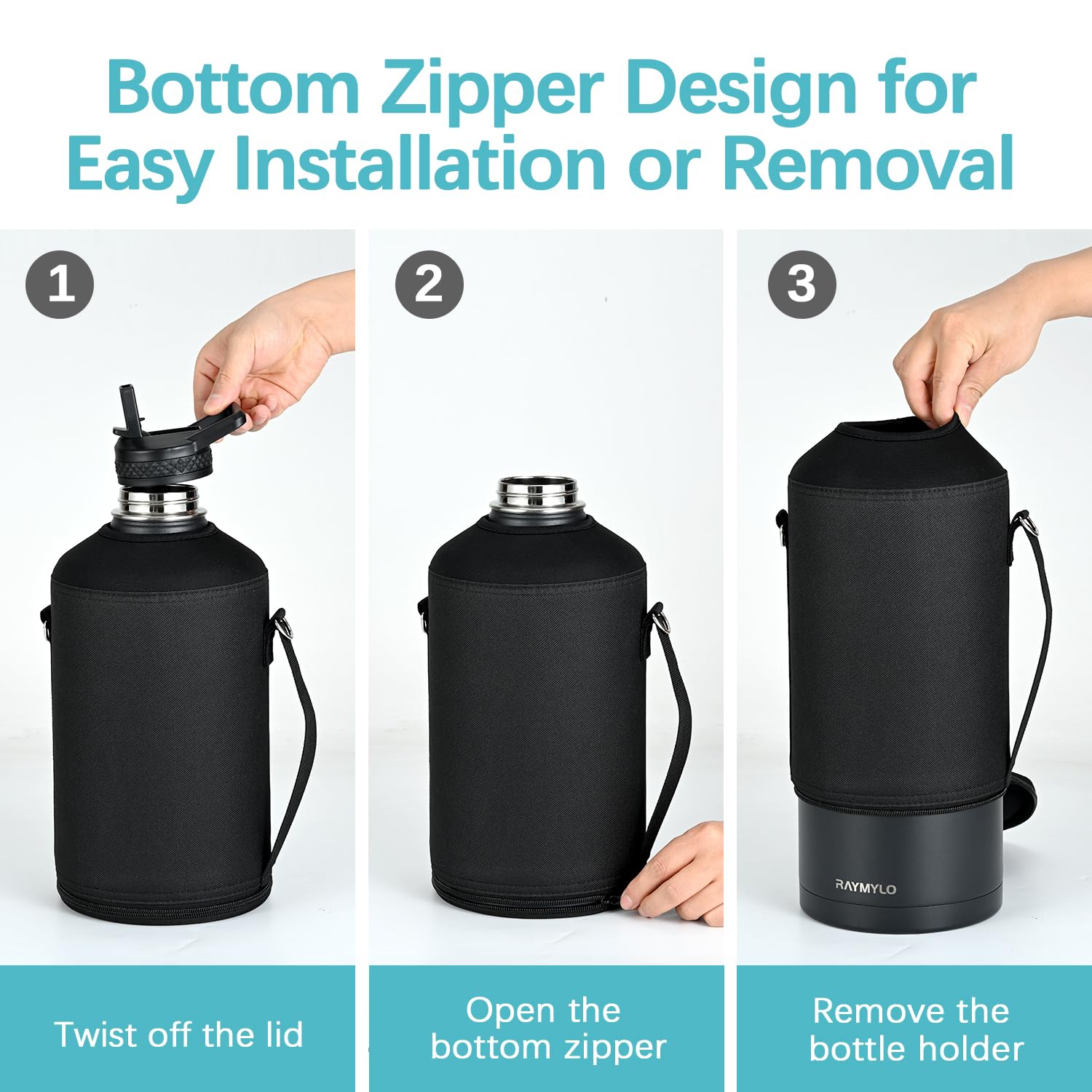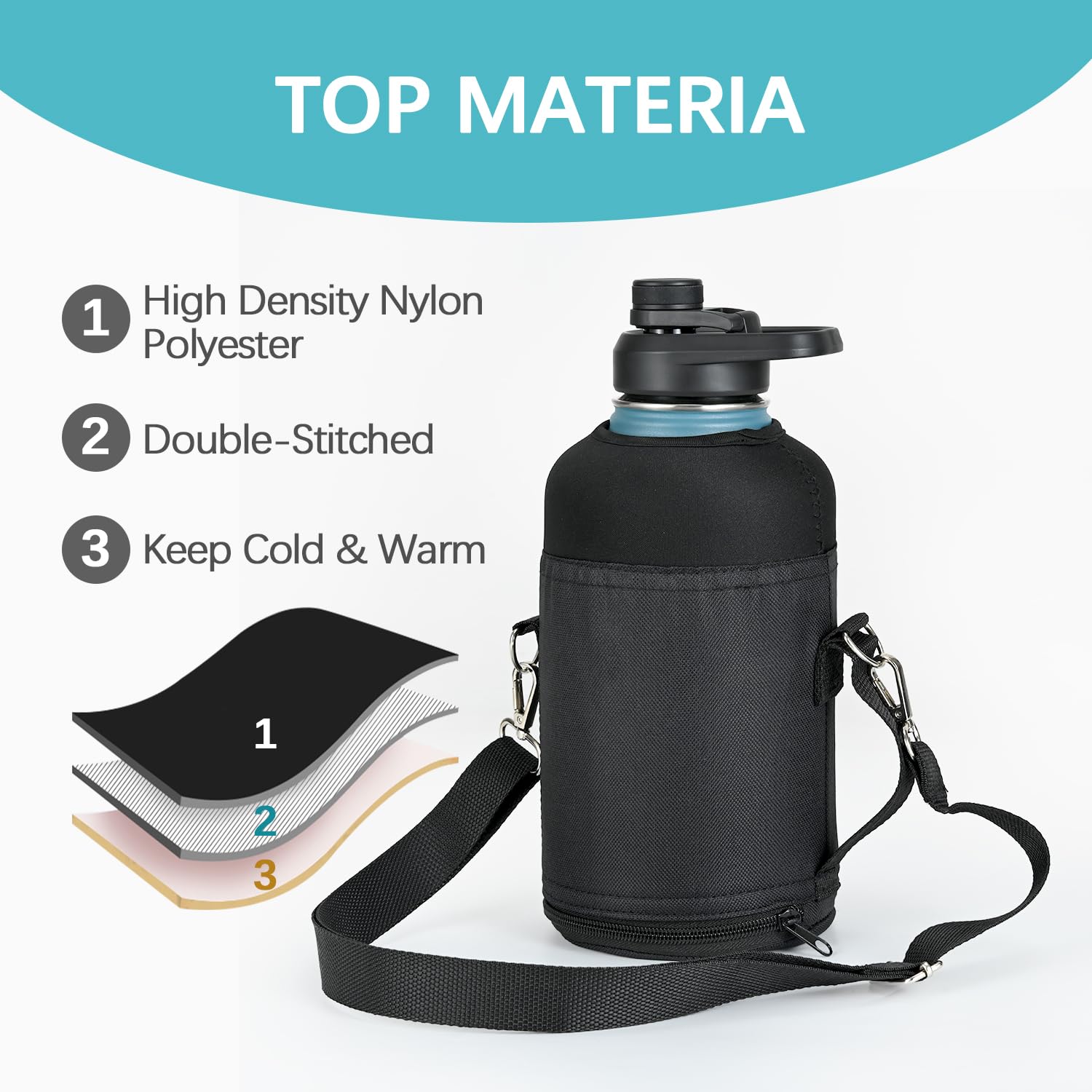 RAYMYLO Water Bottle Holder for 64/128 oz Bottles with an Adjustable Padded Shoulder Strap - Made of High Density Nylon Polyester, Carry, Protect and Insulate Your Flask What You Get: 1 x RAYMYLO Water Bottle Holder 1 x Adjustable Padded Shoulder Strap. 7 x 24H Online Continuous After-sales Service Please Note that the Maximum Size of Suitable Water Bottle is: Height: 9.84”(25 cm) Bottom Diameter: 4.92”(12.5 cm)