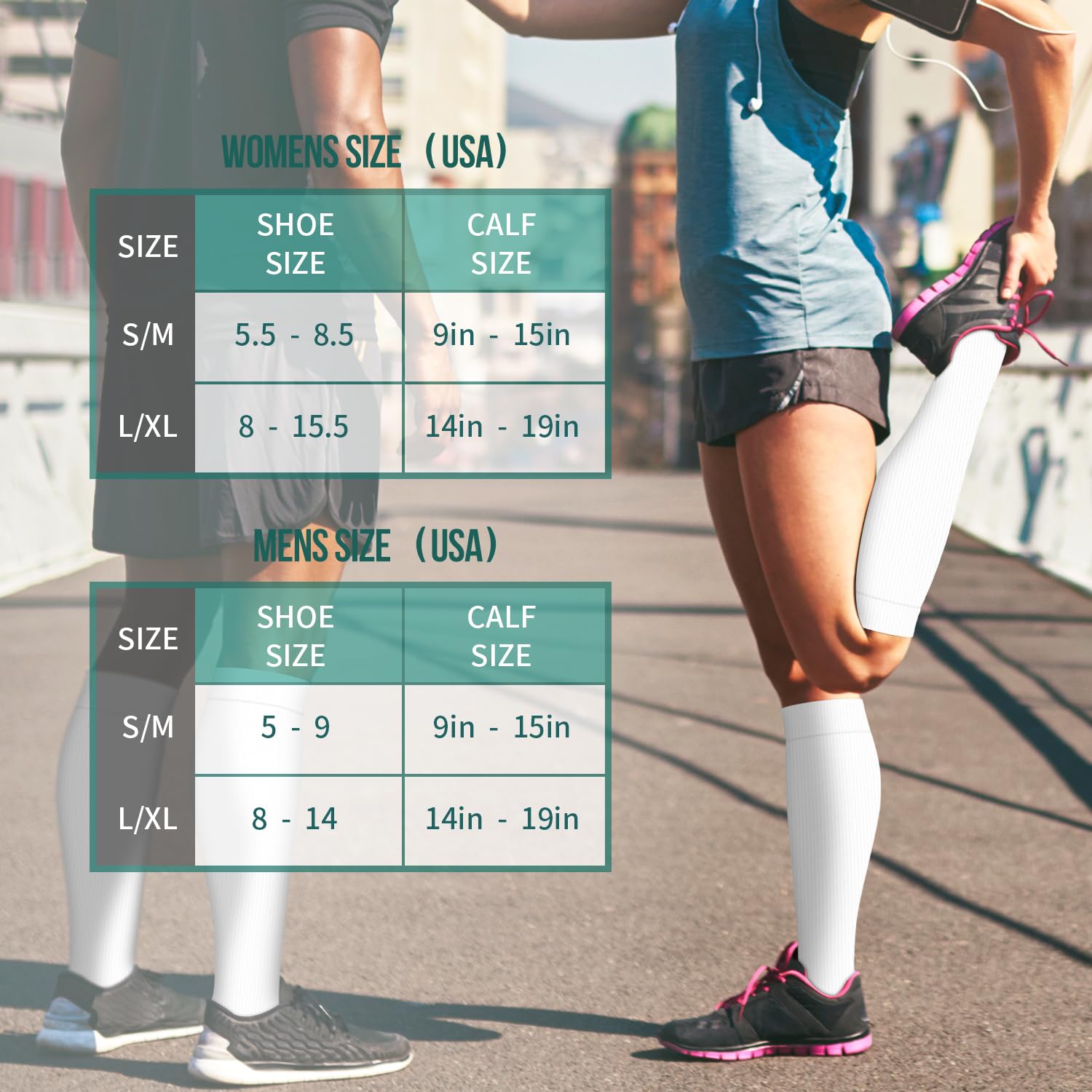 LAB TESTED GRADIENT COMPRESSION -Our Graduated Compression Socks put pressure in just the right spots,work by creating a "pressure gradient"(using graduated compression of 15-20 mmHg)which helps to push oxygen-poor blood out of the feet and legs,and back to the heart. More blood pumping means more Healthier legs and less pain+swelling.Great for long periods of sitting or standing, endurance sports, flying and travel, post-workout recovery, pregnancy, and spider & varicose veins.