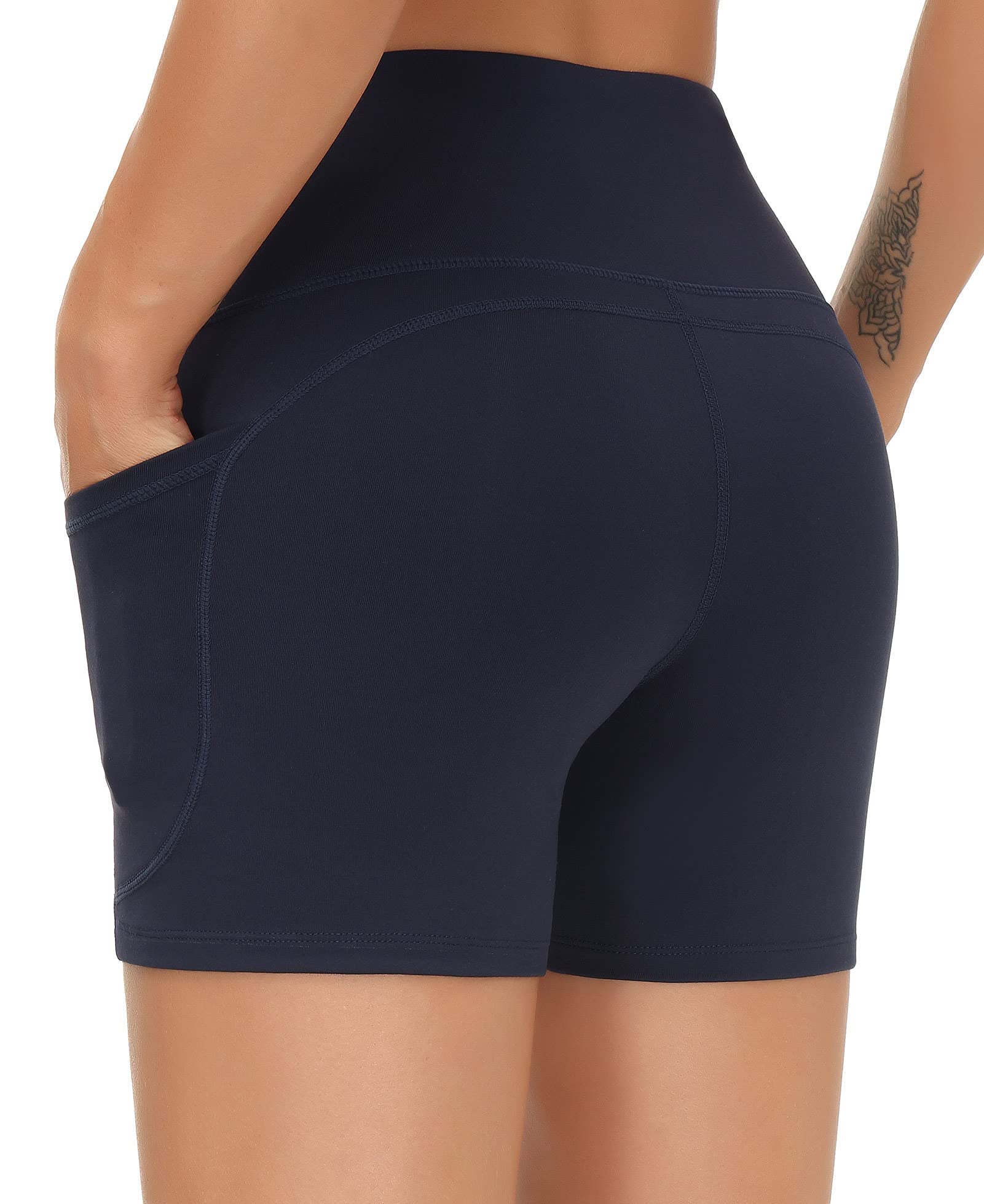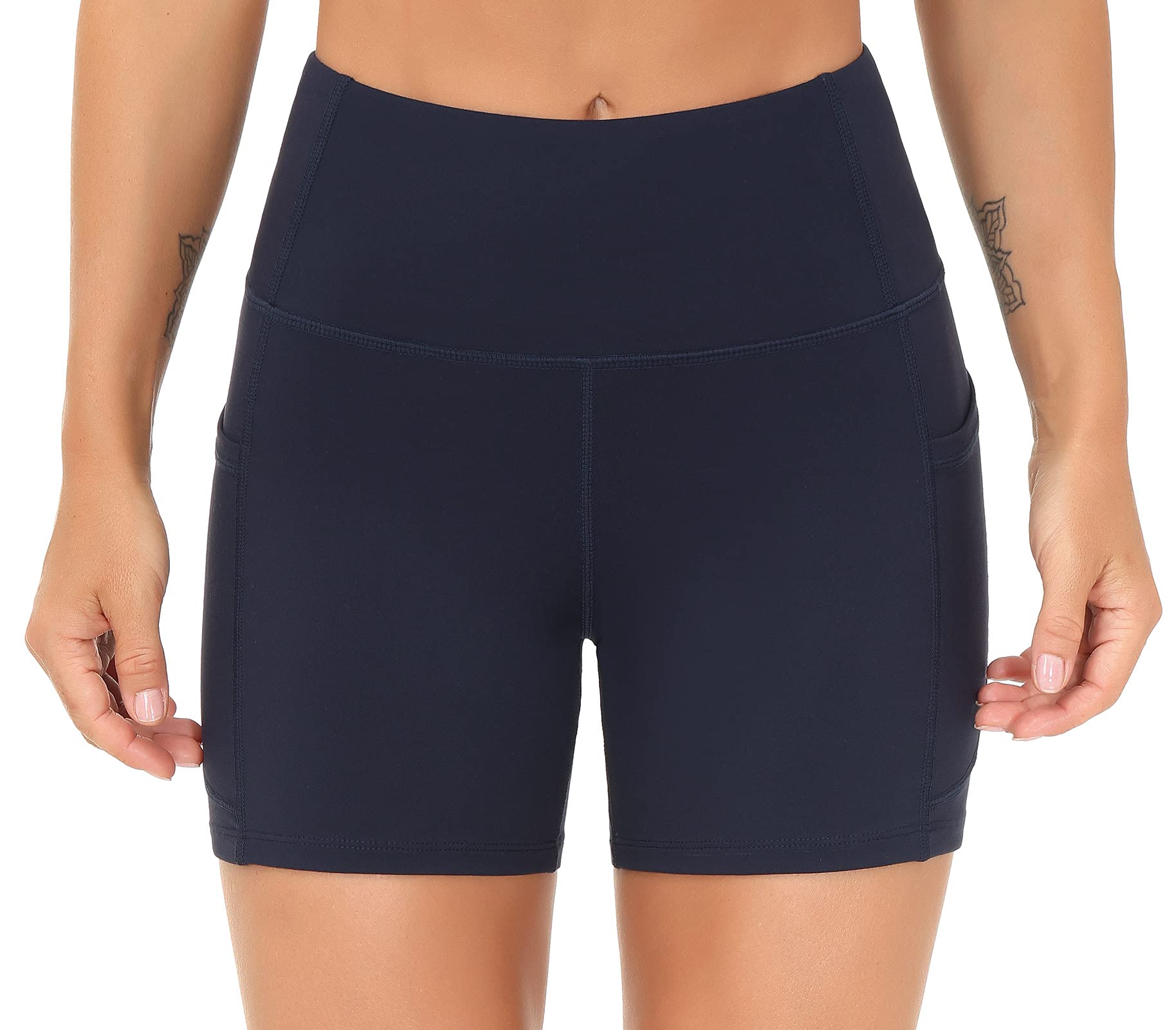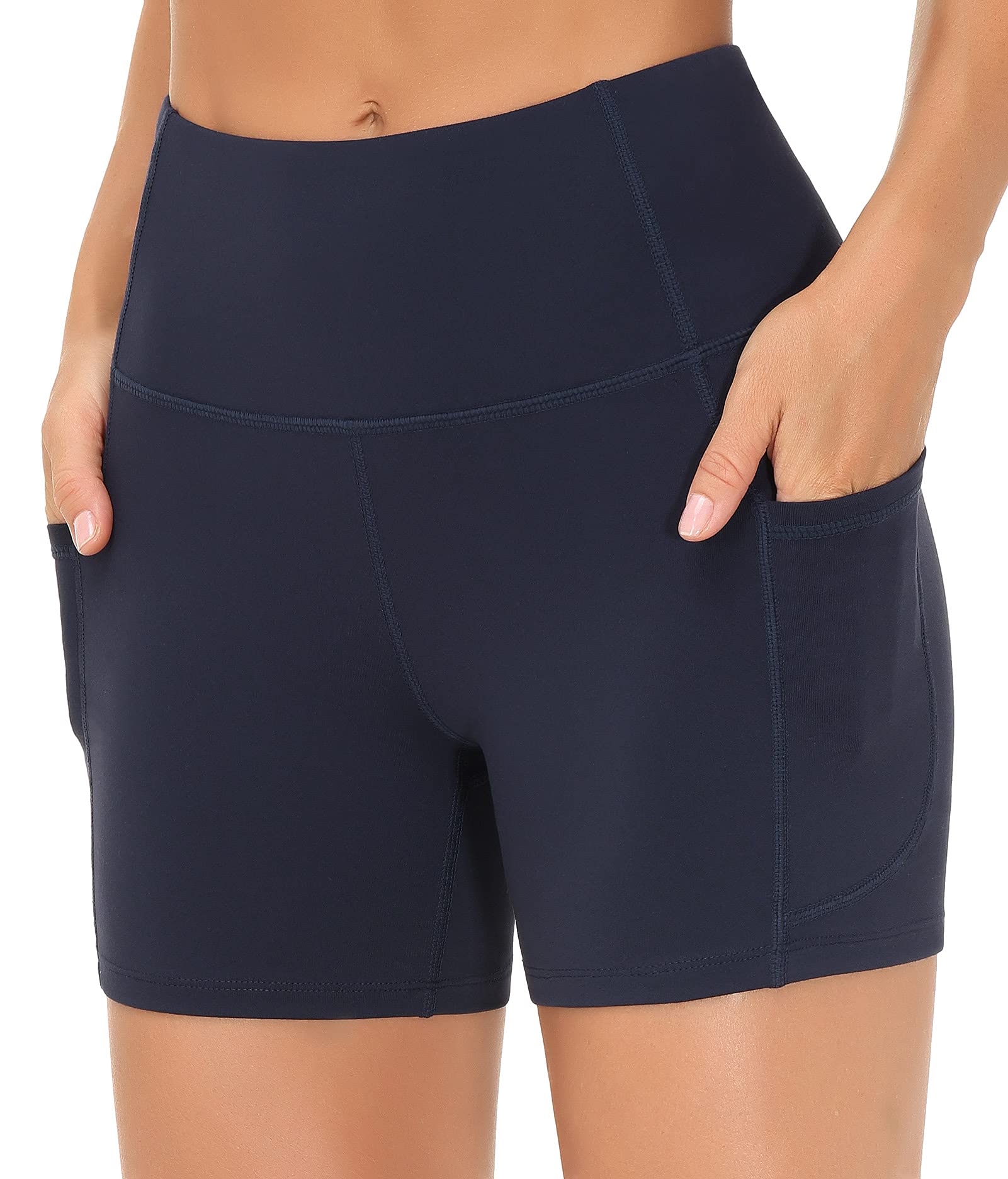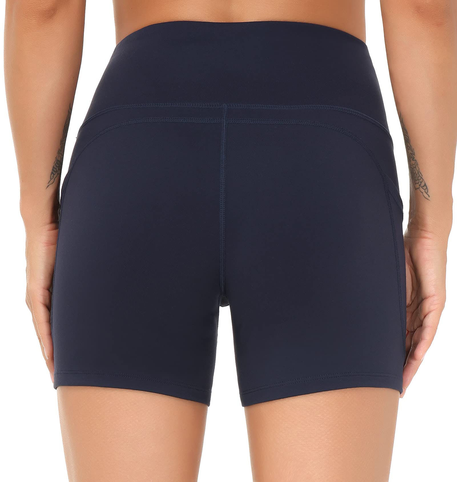 [Keep Perfect Shape] - High-waisted style with tummy control design. Wide waistband contours body curves and streamlines shape help to promote yoga shorts both compression and support.