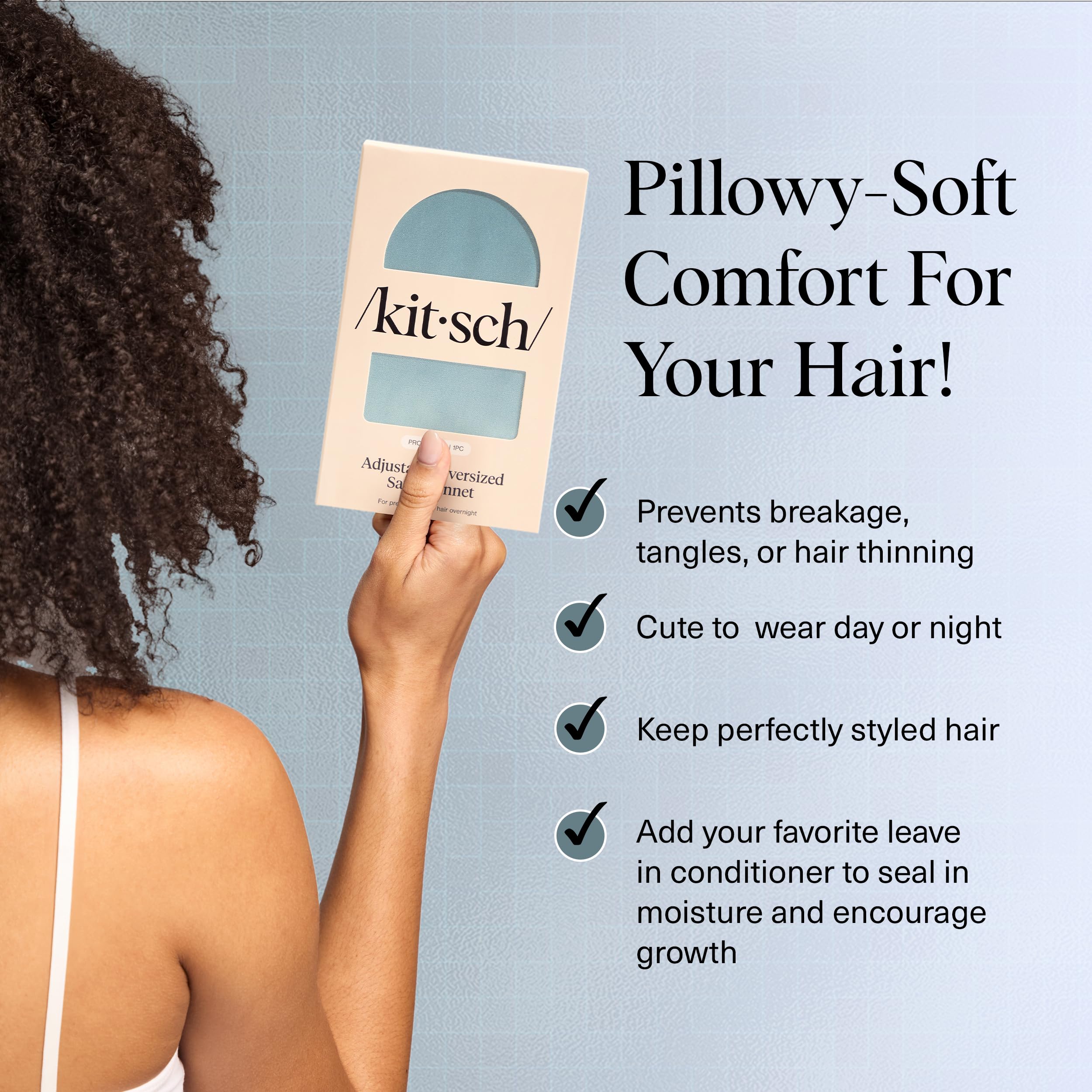 OPTIMAL COMFORT: Keep your hair healthy and hydrated while you sleep with the Kitsch XL Adjustable Satin Bonnet. Made with plush satin, this softer-than-silk bonnet for sleeping women prevents breakage and frizz while offering soft, pillowy comfort. Ideal for women looking for a gentle, softer-than-silk bonnet for sleeping—and makes a perfect gift for women who care about hair health.