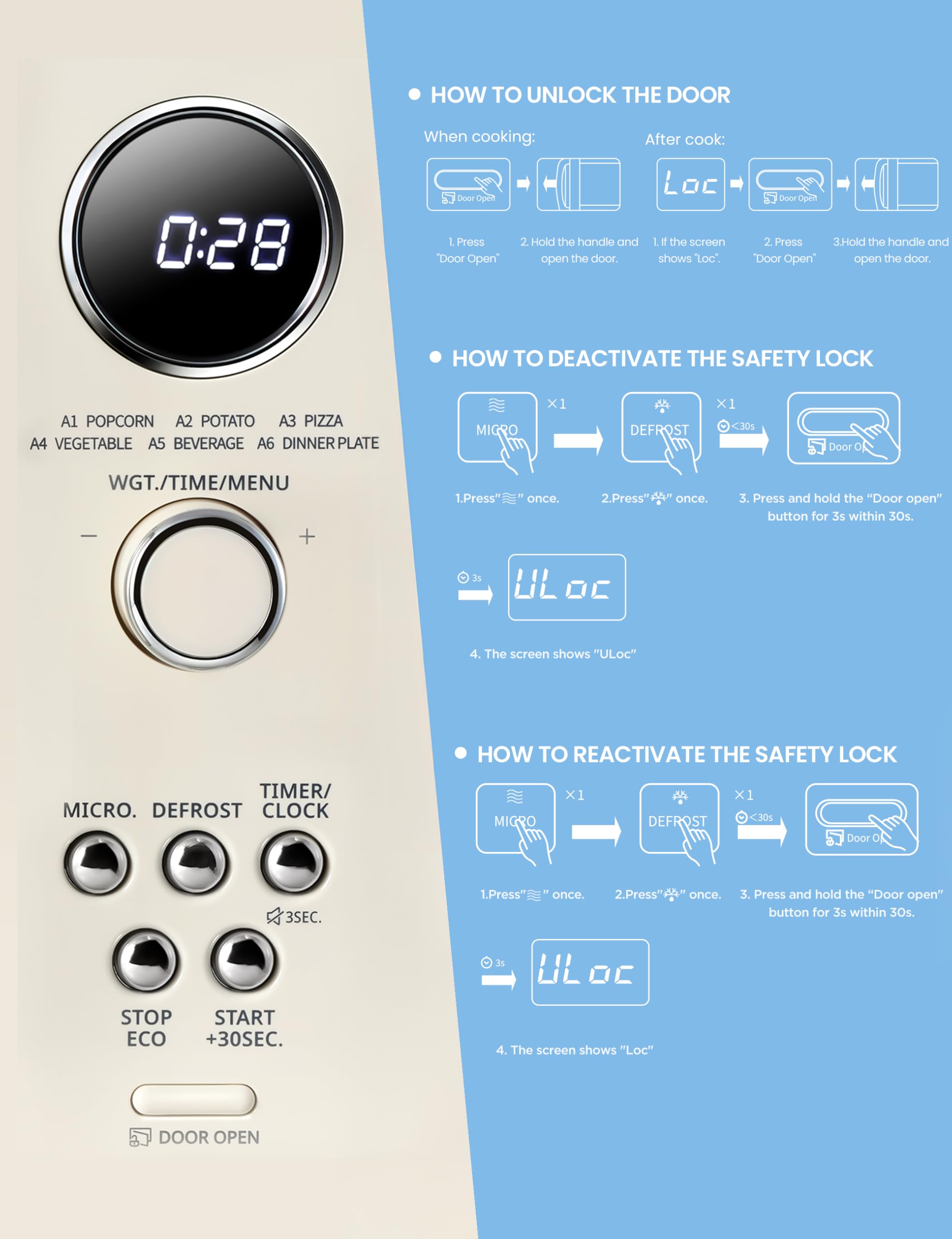 Two-Step Child Lock Feature: For extra protection and prevent misuse, all microwave oven manufacturers are implementing a new safety standard and add a 2-step child lock function, which will be easily deactivate by the instruction. Please refer to the product manual for the full features of this microwave oven.
