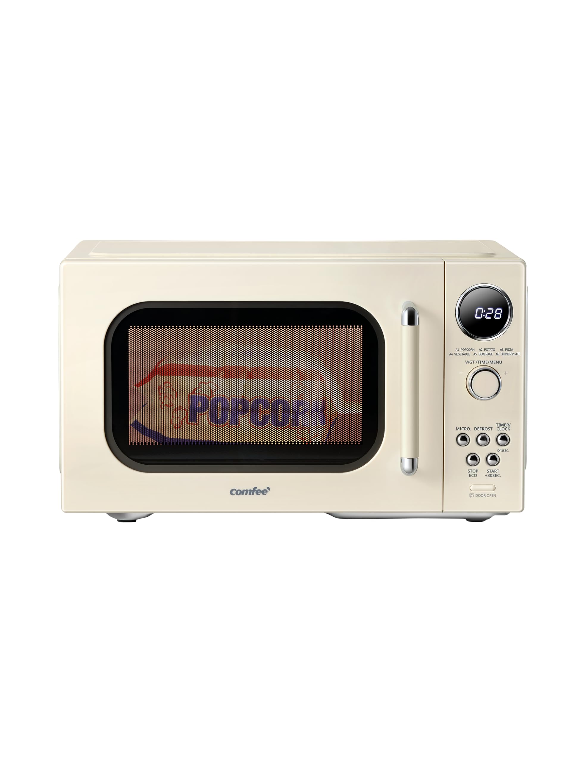 This COMFEE' 0.9 cubic feet 900 watts retro style microwave oven is inspired from those good old days and refined by modern style and practical functions. It features 9 auto menus, an easy defrosting function, microwave cooking with 10 power levels, and an express cooking button. You can now prepare a full meal with just one microwave! This microwave oven comes compact but can easily accommodate most common dishes such as a 10-inch pizza. Express cooking options to cook for 30 seconds at full power or to increase 30 seconds during cooking, press the START button and Comfee microwave will do the rest. Defrost function is simply chosen to defrost by time or by weight, meat can be evenly and thoroughly defrosted. It is equipped with a position memory turntable, energy-saving eco mode, a mute button, a clock, and a kitchen timer. The bright LED digital display, easy-to-read control panel, and cool-touch rounded buttons further improve the user experience. And the compact size is ideal for apartment kitchens, vacation homes, offices, and dorms.