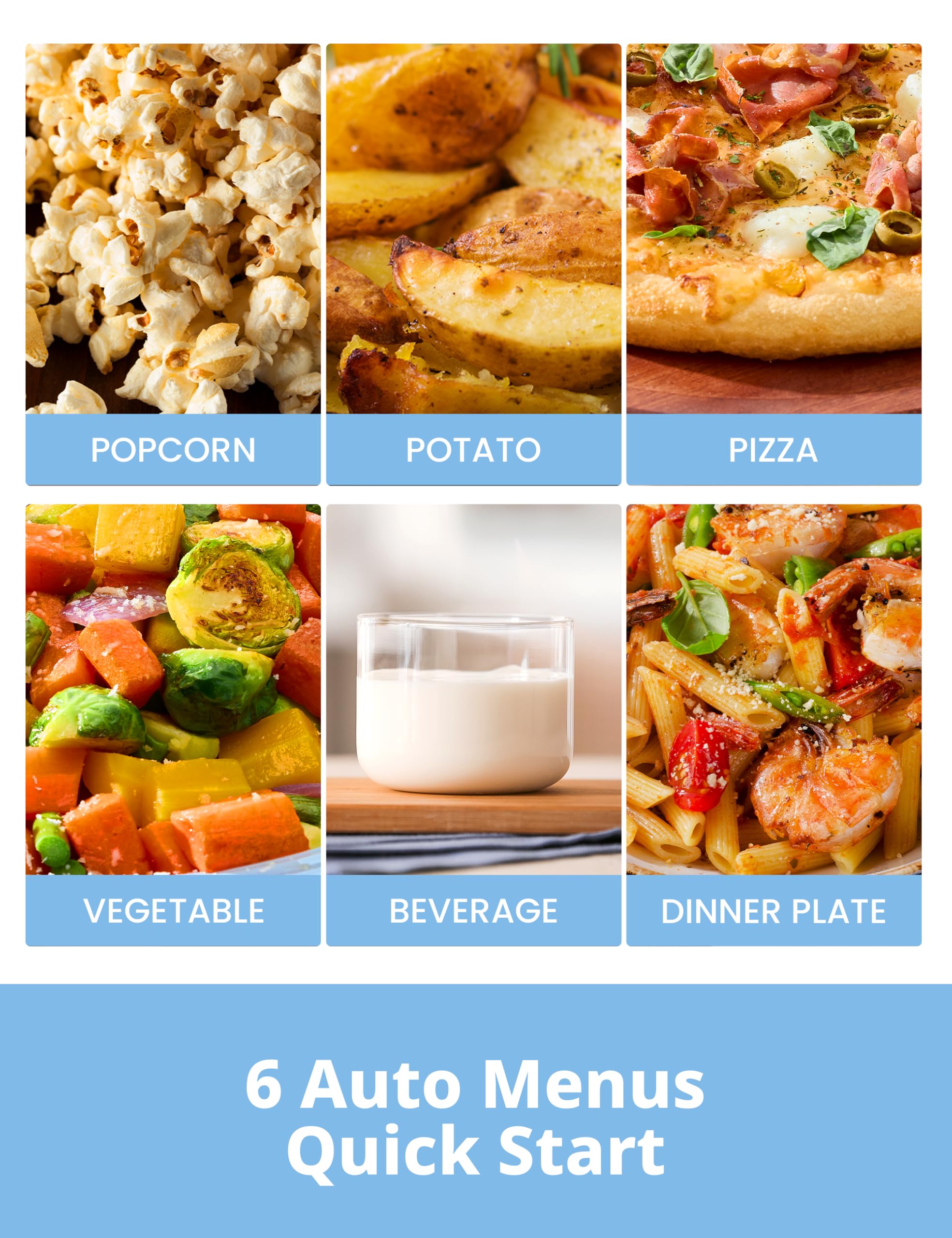 11 Power Cooking Level with 900w Output: This microwave has 6 auto menus, which can help you in your daily meals--popcorn, beverage, vegetable, meat, pizza, potato, pasta, soup, reheat.