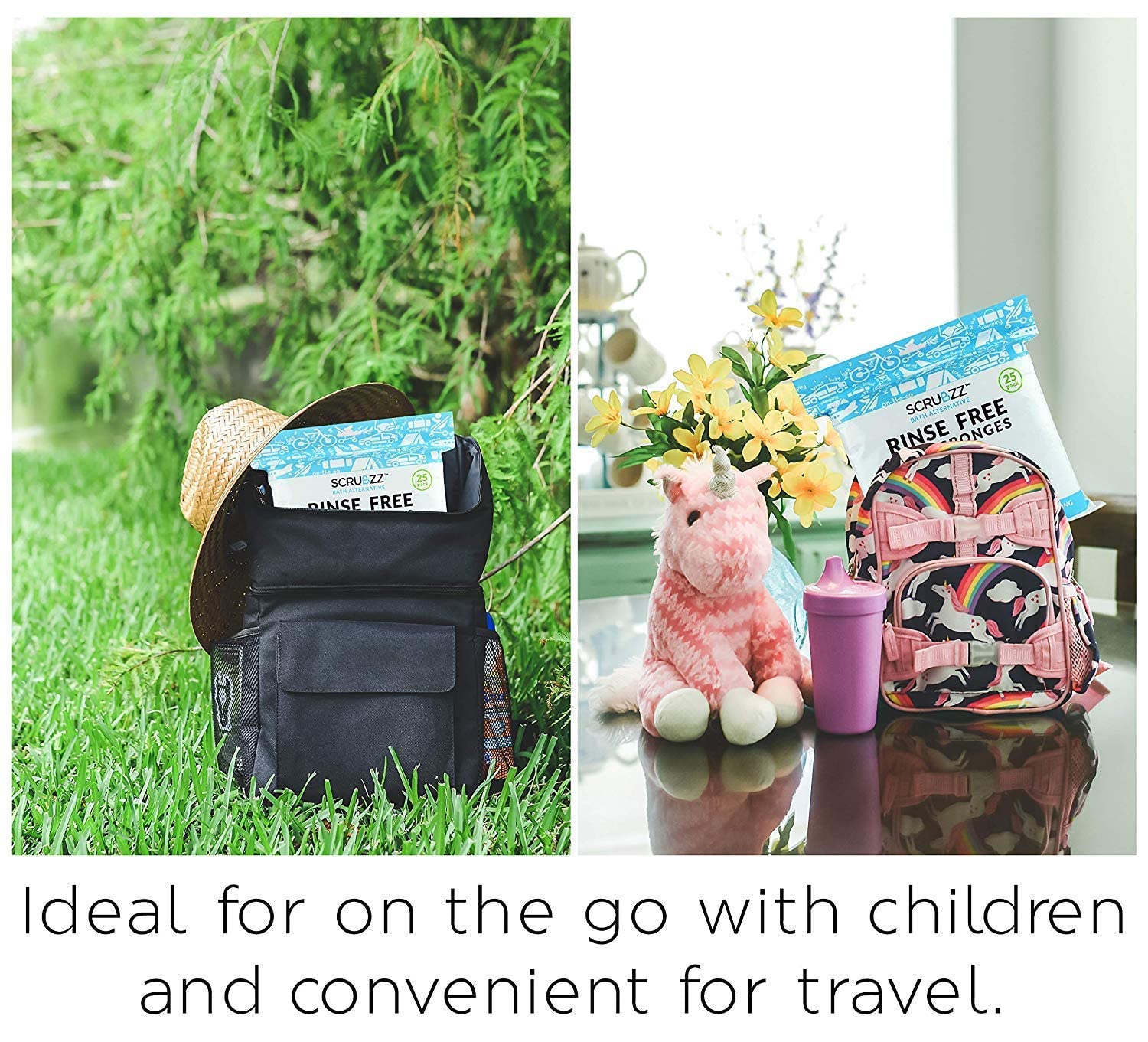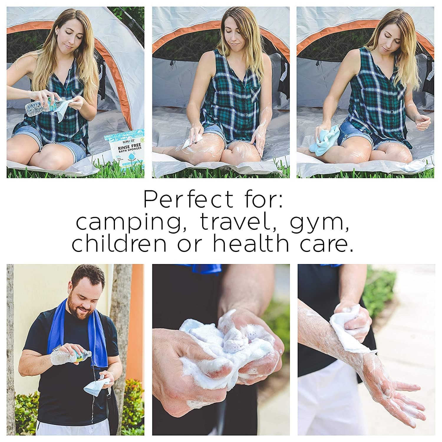 Scrubzz are soap and shampoo infused. To activate simply add a splash of water, lather and scrub your body, and towel dry. No rinsing and no soapy residue.