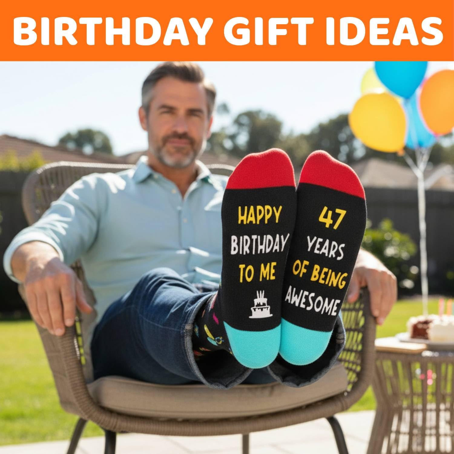 47TH BIRTHDAY GIFTS: These socks feature birthday gifts, balloons, cakes, and other elements on the top, while the bottom features a hilarious secret message written in non-slip ink: "HAPPY BIRTHDAY TO ME, 47 YEARS OF BEING AWESOME".