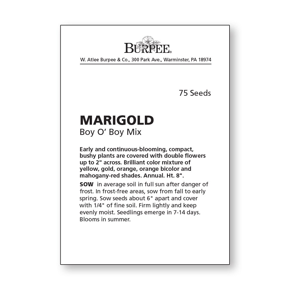 Burpee exclusive Marigold mix has superb Crested types that are a well-balanced mix of early, continuously blooming yellow, gold, Red and Orange 2" blossoms