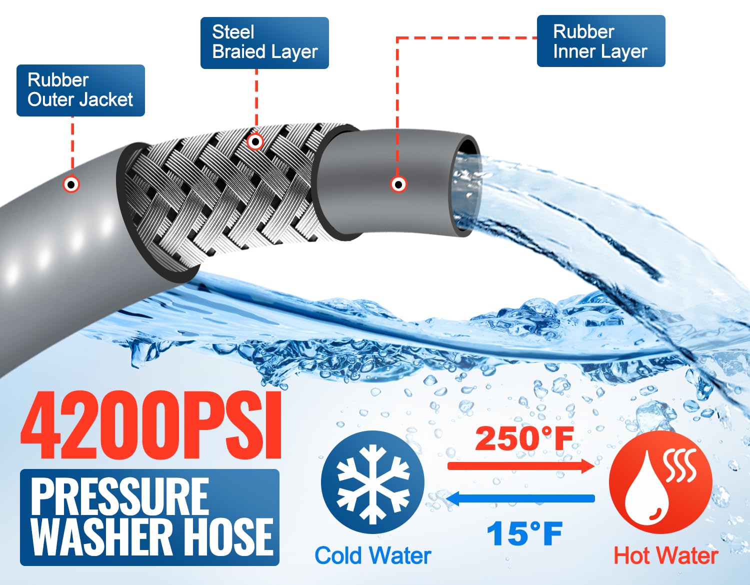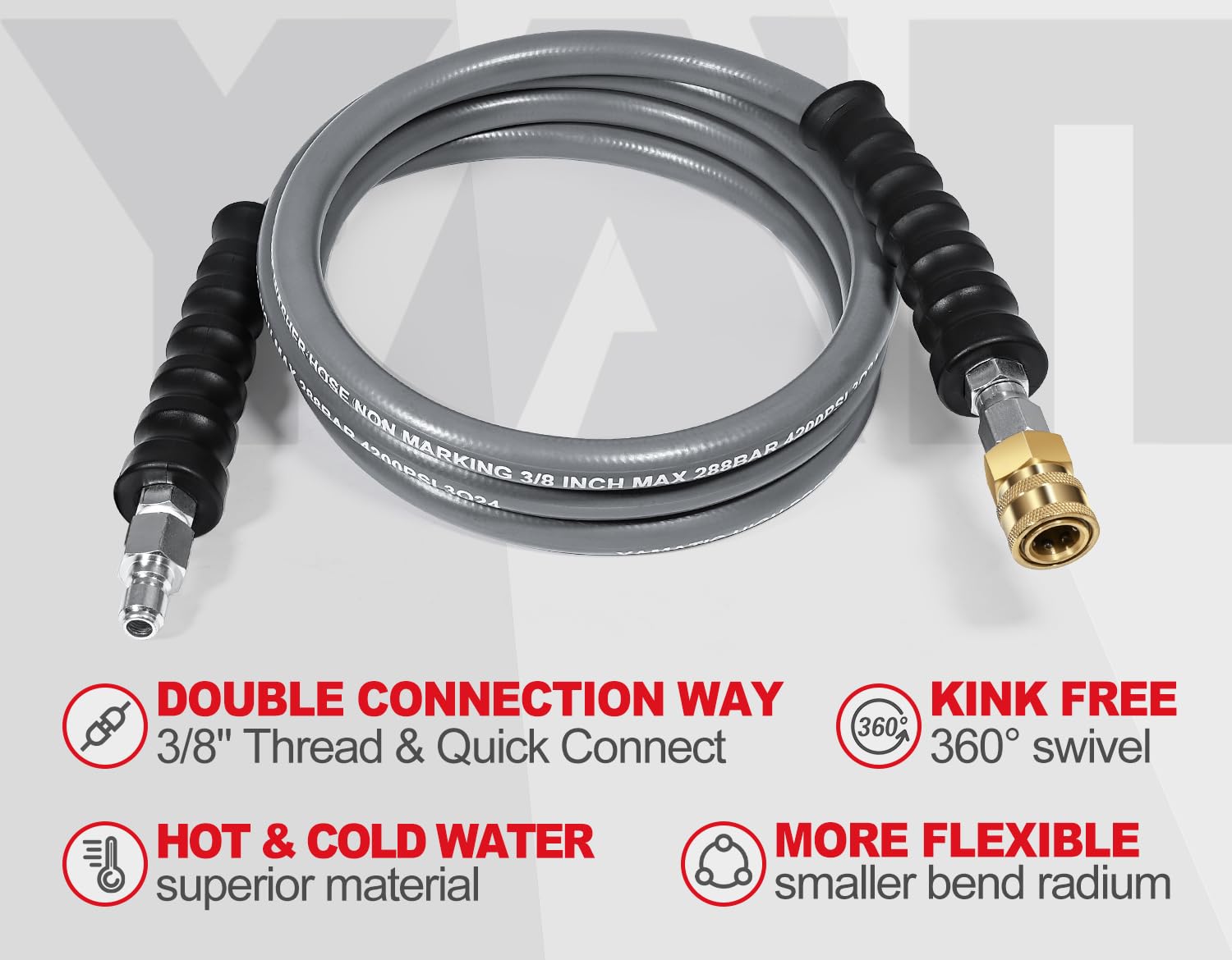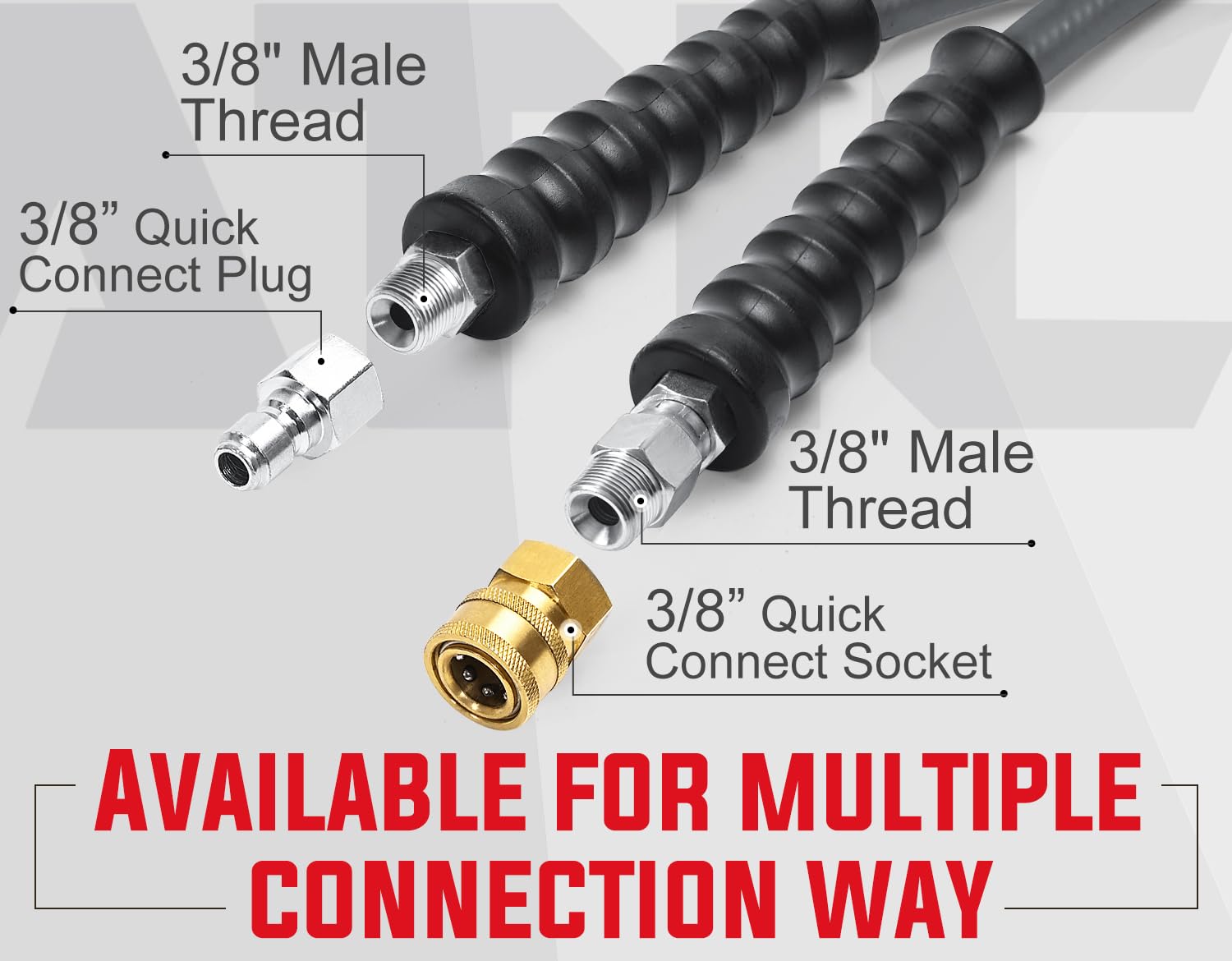 [Pro-Flexible & Anti-Kink ] High-strength steel wire braided pipe with advanced 360° swivel 3/8" quick connector, the hose always lay down exactly what you want and is more easily to setup and unload, won't fight with kink anymore. The 3/8" quick connector complies with National Pipe Standard and fits all gas-powered washer hose replacement & extension.