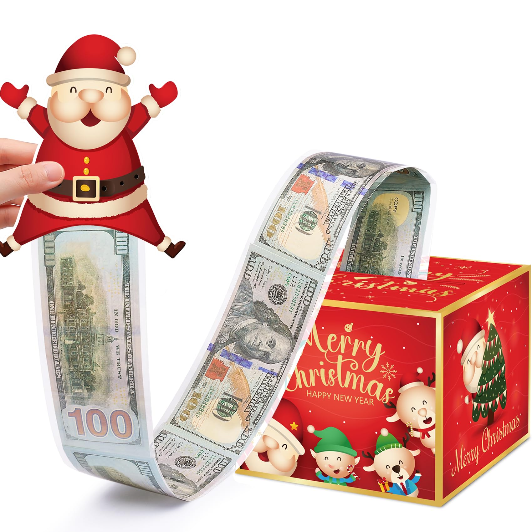 đ ăPerfect Christmas Money Pull Box DesignăThe Christmas Money Box measures 4.3 "x 5.3" x 5.3 "and is made of sturdy cardboard with a Marry Christmas theme pattern. The inside of the cute "Santa Claus" card has tape to secure the money roll. The plastic bag size is 3.15" x 7.89 "(US dollars size: 2.61" x 6.14 "), and 100 plastic bags are enough to accommodate the amount of US dollars you want to customize. This is not only a surprise gift, but also an elegant way to give cash