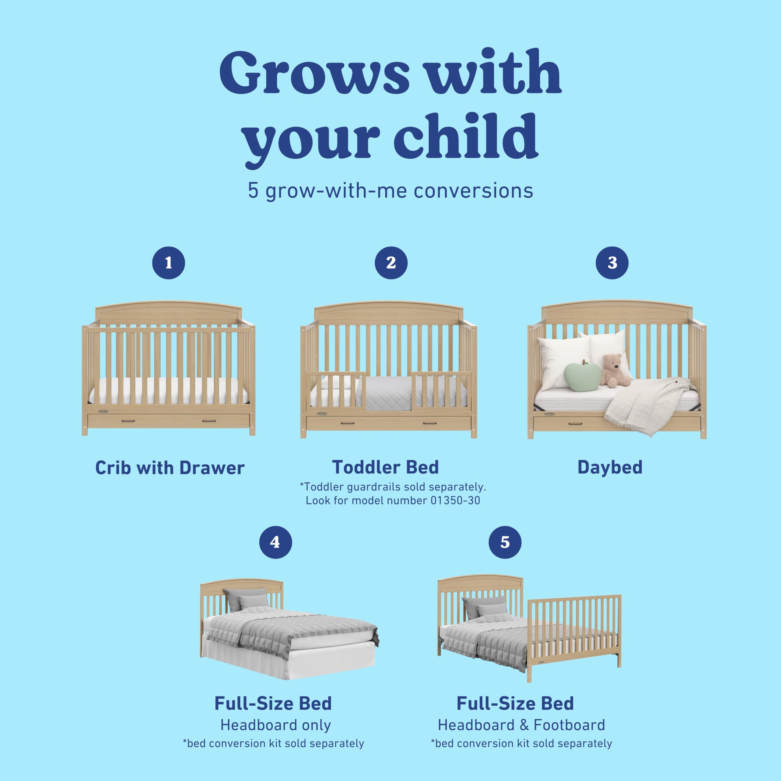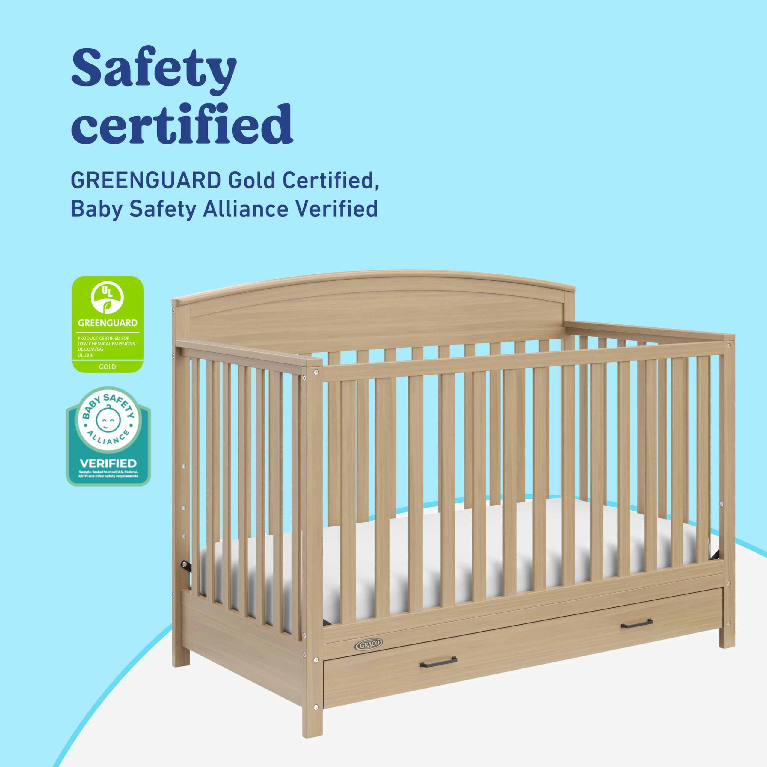 Introducing the Graco Benton 5-in-1 Convertible Crib with Drawer. With its clean, classic design, the Benton is the perfect addition to any nursery and easily complements any room style. The crib features a full-size under-crib storage drawer with two compartments, providing convenient organization for all your nursery essentials. The drawer comes with pre-installed Euro drawer glides for easy assembly. Crafted from pine wood, engineered wood, and wood composites, the Benton's finish has been tested to meet or exceed ASTM and CPSIA safety standards. The Benton is GREENGUARD Gold Certified, meaning it has been screened for over 15,000 chemicals and VOCs known to pollute indoor air. It is also Baby Safety Alliance Verified, independently tested by accredited third-party laboratories to meet or exceed all applicable voluntary and mandatory safety standards. Designed to adapt as your child grows, the Benton features an adjustable mattress support base with 4 height positions, allowing the mattress to be lowered as your baby develops—from newborn until your child can sit or stand safely on their own. Please note: this crib is intended for use until your child can easily climb out or reaches 35 inches (89 cm) in height. The Benton transitions seamlessly from crib (mattress not included) to toddler bed (guardrail kit sold separately), daybed, full-size bed with headboard only, or full-size bed with headboard and optional footboard (full-size conversion kit sold separately), supporting your child from infancy through early childhood. The Graco Benton 5-in-1 Convertible Crib with Drawer accommodates any standard full-size crib and toddler mattress (mattress sold separately; we recommend a Graco crib mattress for the best fit). Exclusively manufactured by Storkcraft, proud licensee of the Graco® brand within nursery and kids’ bedroom furniture. Storkcraft is a Parent Tested Parent Approved (PTPA) Seal of Approval recipient, recognized for trusted quality and craftsmanship. Backed by Storkcraft’s Customer Care team and a 1-year limited manufacturer’s warranty. Assembly required.