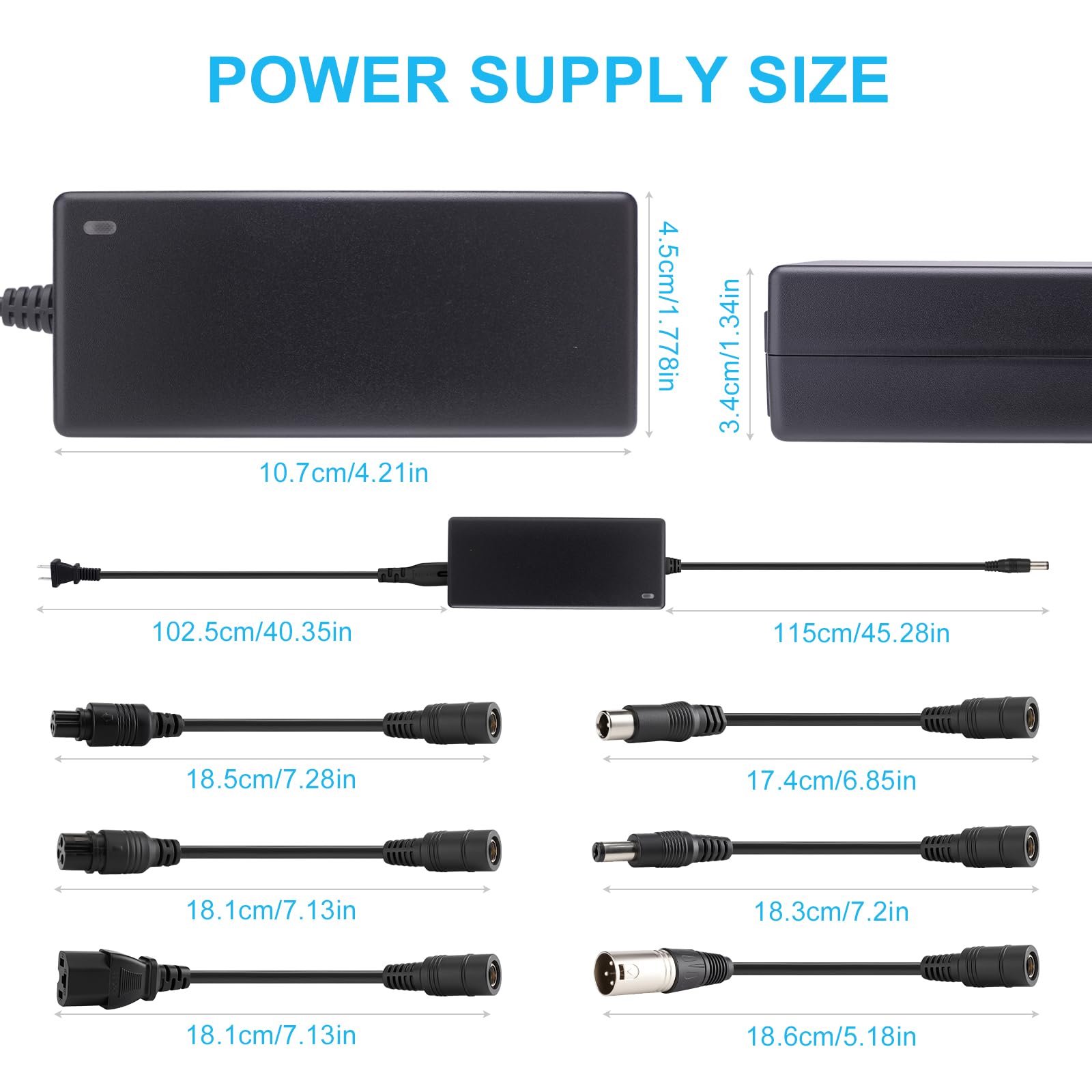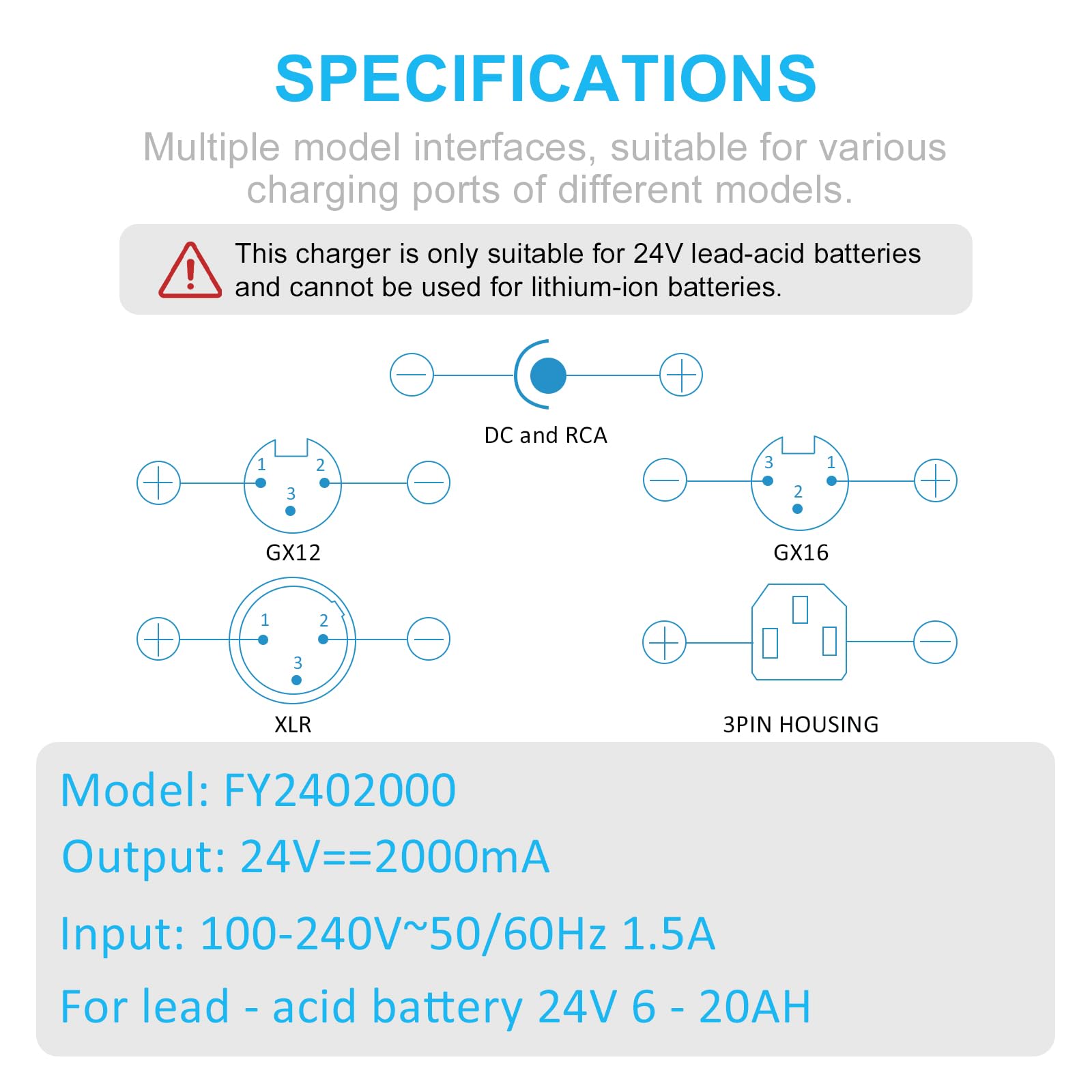 Universal Compatibility: TENGSHUNNIU’s 24V 2A charger is built for true versatility. It comes with 7 essential adapters to cover 99% of 24V lead-acid devices: DC 5.5×2.1mm (built-in), DC 5.5×2.5mm (spare), GX12 (9mm), GX16 (12mm), RCA (8mm), XLR (18mm), and 3PIN HOUSING (23×16mm). Compatible with top brands like Razor (E100-E500 series, ZR350, MX350), Go-Go (Elite Traveller, Jazzy Power Chair), and Dirt Quad, it replaces your original charger without skipping a beat.