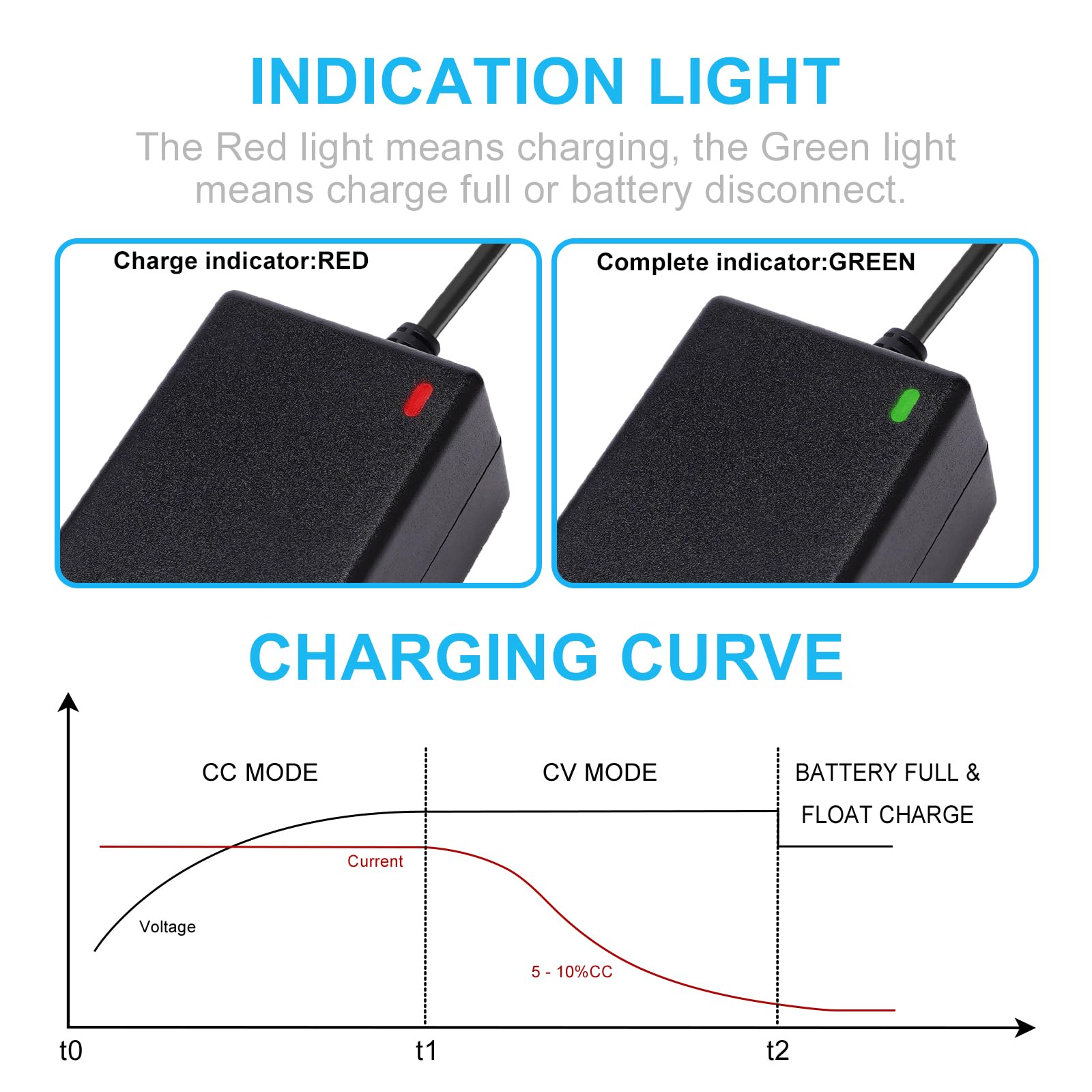 Smart LED Indicators: No more guessing if your battery is charged. Our charger features dual LED lights that tell you exactly what’s happening: Red light: Charging in progress (CC mode: constant current for fast, stable power delivery). Green light: Fully charged or disconnected (CV mode: constant voltage to protect battery life and prevent overcharging).