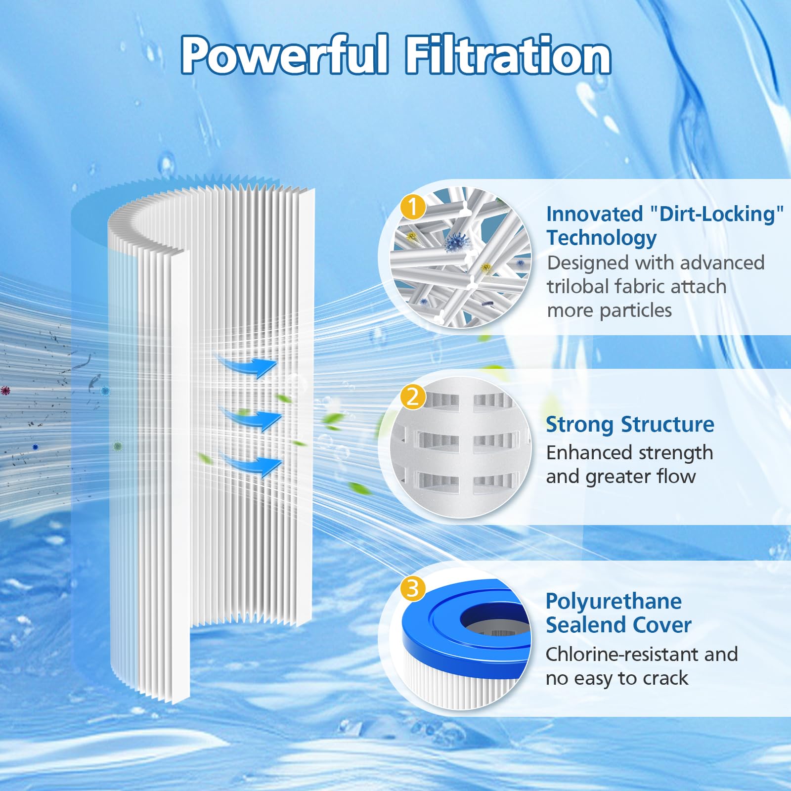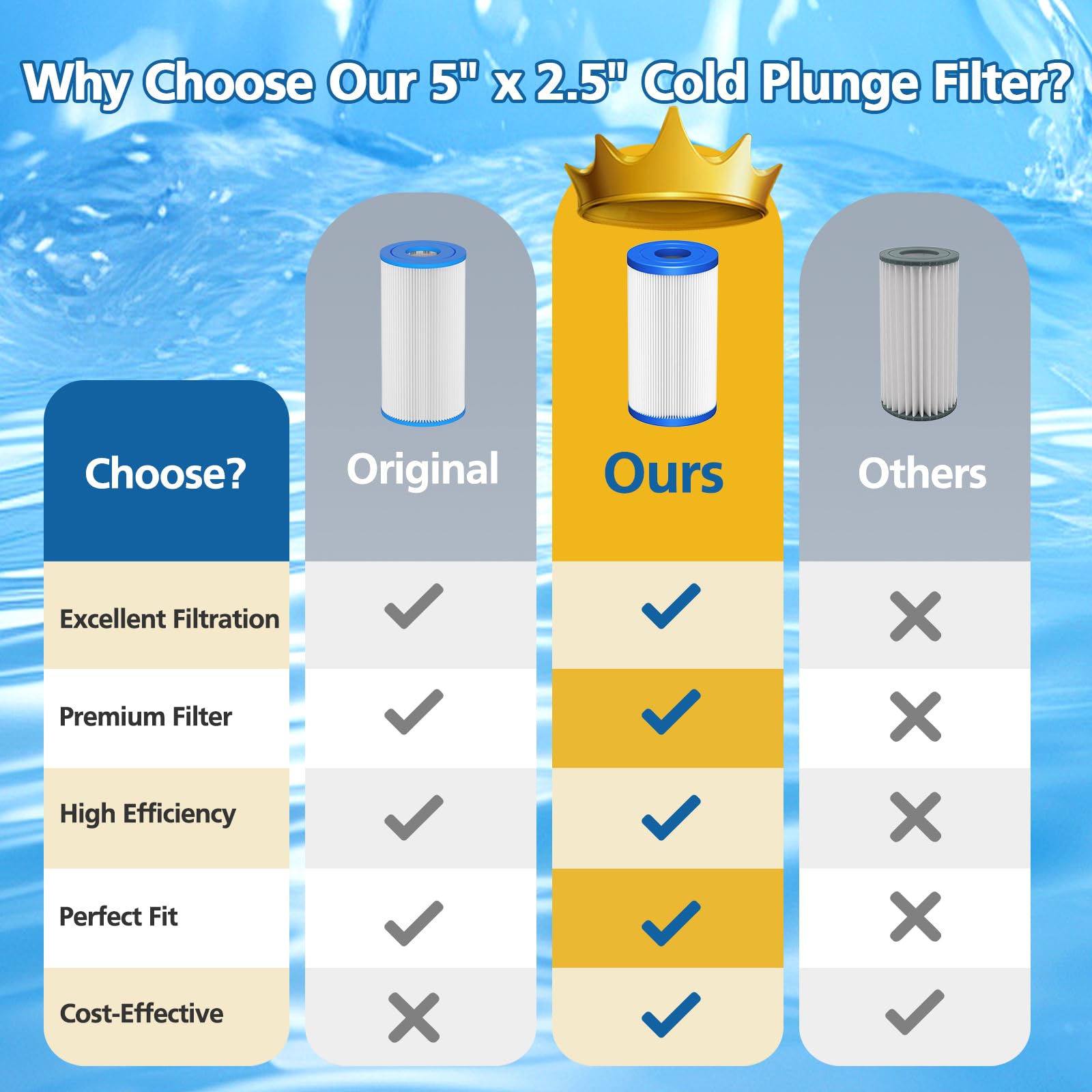 【High Efficiency Filter System】Our 20 Micron 5" x 2.5" Water Filter replacement for Most Cold Plunge System include ① innovated "Dirt-Locking" Technology which is designed with advanced trilobal fabric attach more particles; ② Strong Structure have enhanced strength and greater flow; ③Polyurethane Sealed Cover provide chlorine-resistant and no easy to crack.