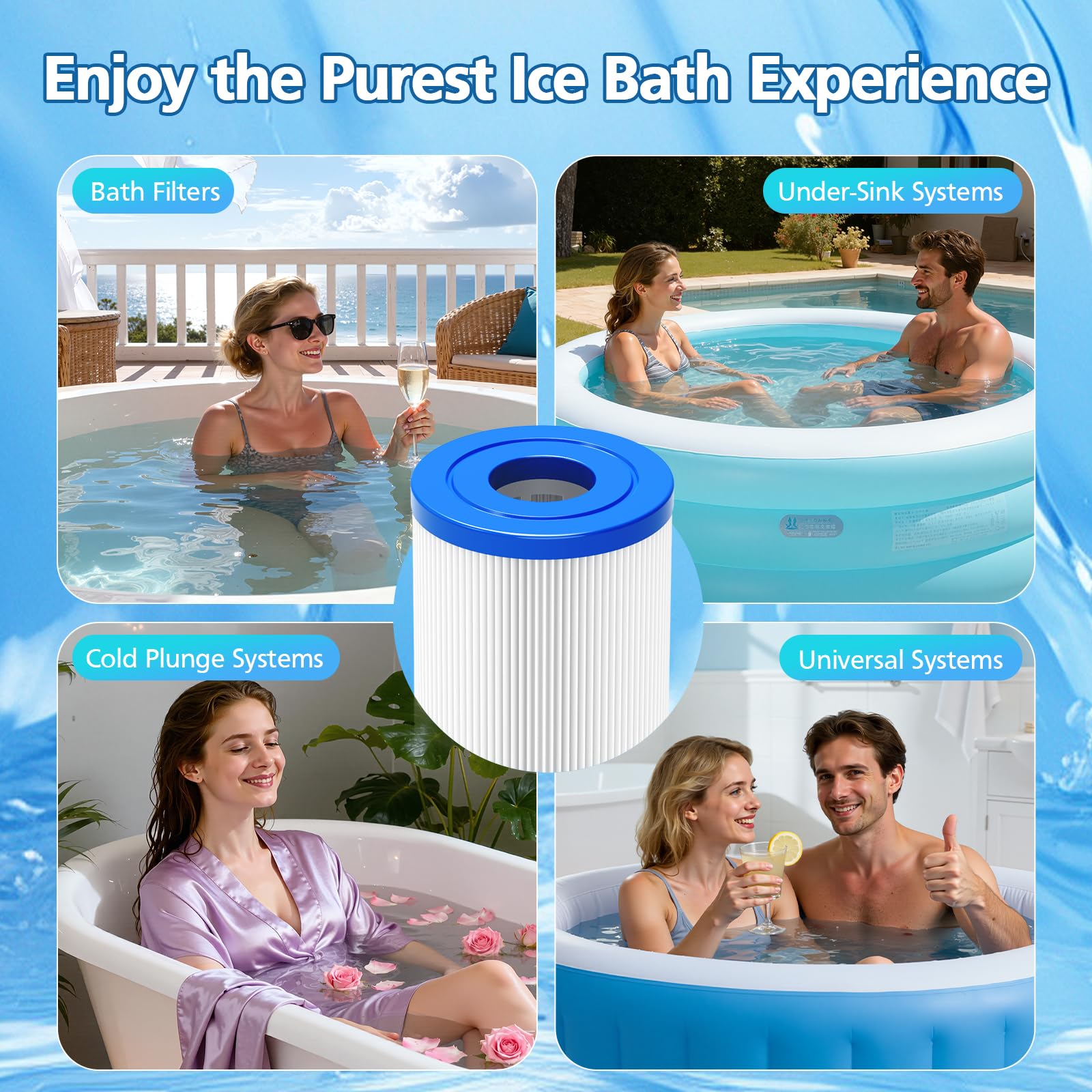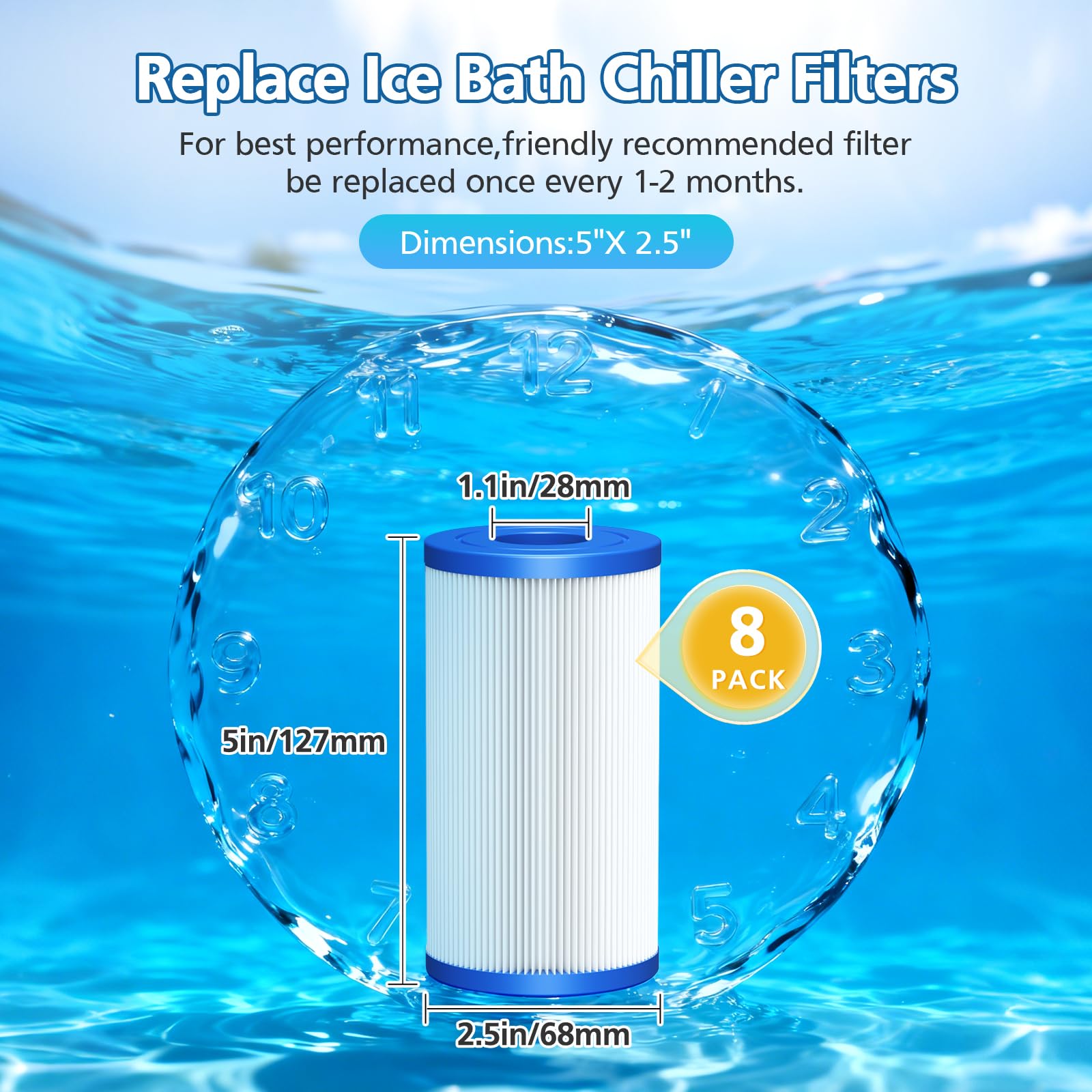 【Easy to Clean & Maintain】8 Pack Cold Plunge Filter can be installed easily without any tools. The durable and reusable design allows for easy cleaning; simply rinse to restore performance, making maintenance quick. We recommended filter be replaced once every 1-2 Months to get best performance according to the frequency of use.