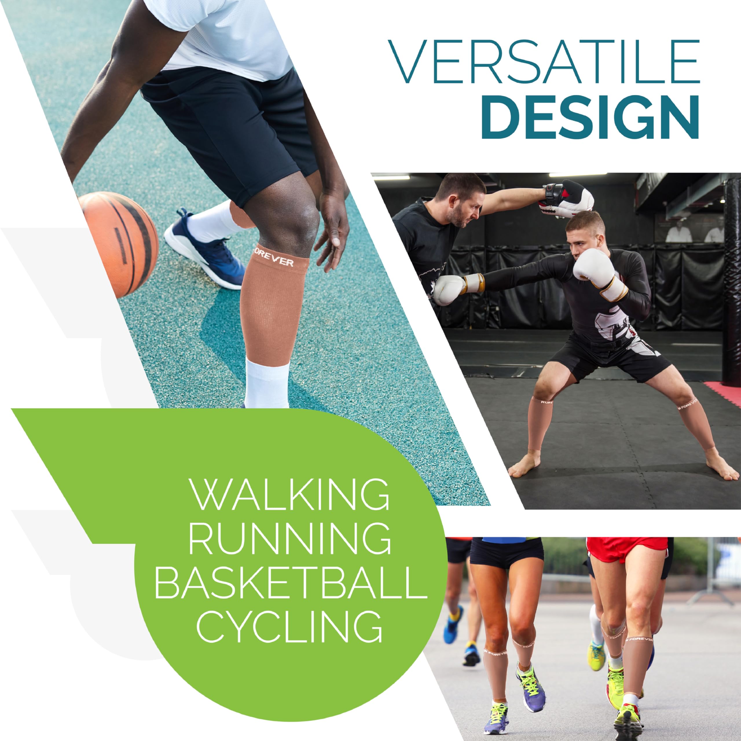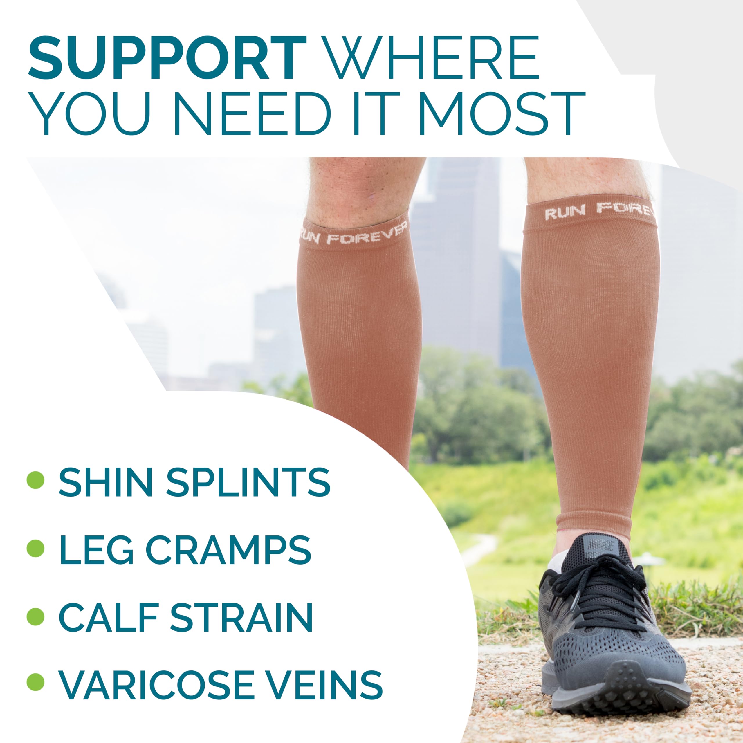 Multiple designs, colors & sizes: Run Forever Sports calf compression sleeve for men & women has many engaging colors and caters to all sizes, from small, to xl, to plus size!