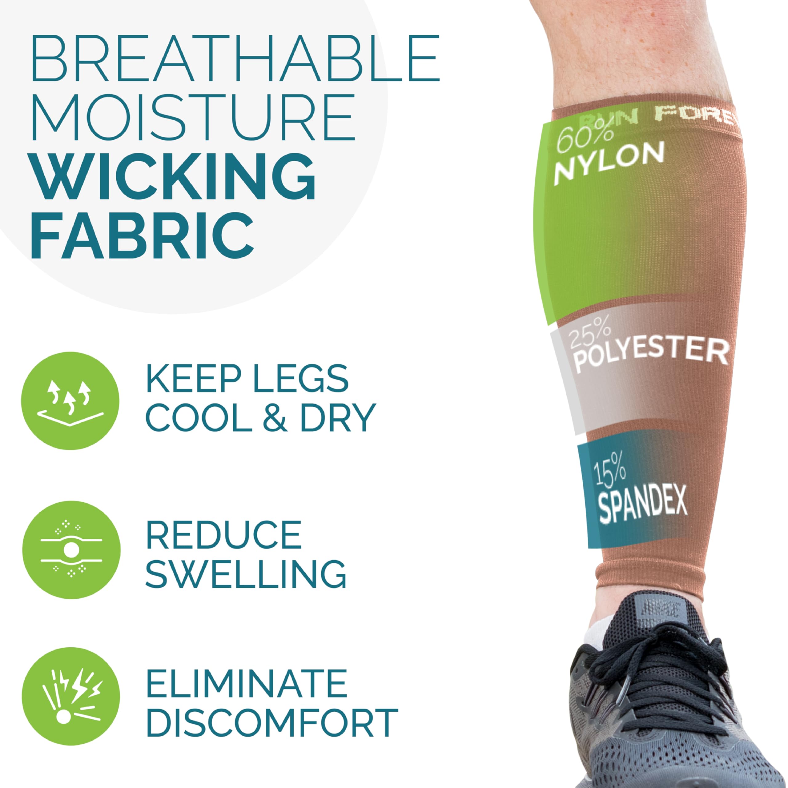 High quality: The leg compression sleeve is made of premium fabric with a combination of 60% Nylon, 25% Polyester & 15% Spandex making it durable, machine washable, breathable & comfortable