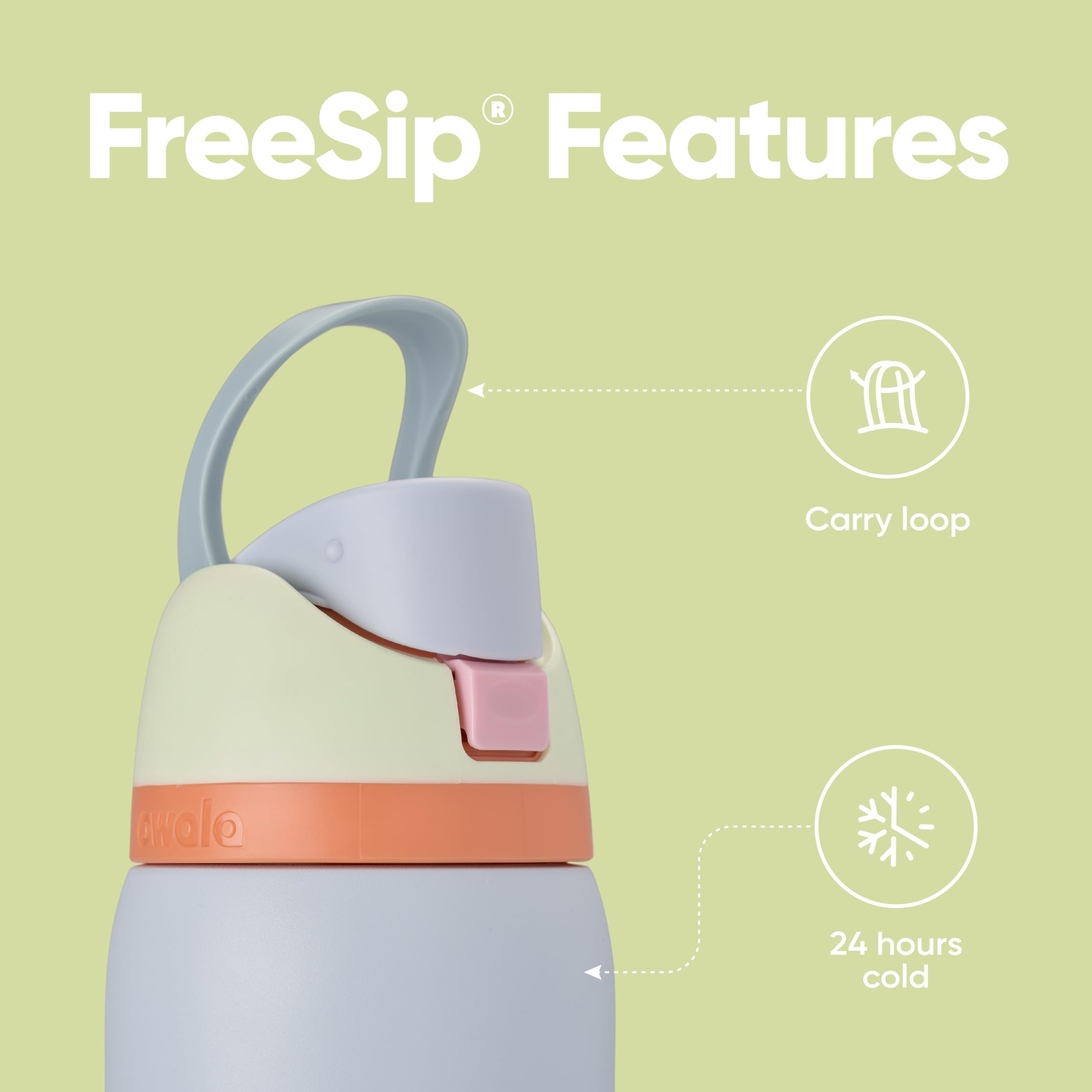 The Owala FreeSip Insulated Stainless-Steel Water Bottle with Locking Push-Button Lid easily tackles every thirst. With a built-in, easy-clean straw and a wide-mouth opening, the FreeSip reusable bottle is designed for drinking two different ways: sipping upright through the straw or tilting back to swig from the wide-mouth spout opening. Add in a push-to-open lid and playful colors, and staying hydrated has never been simpler—or more fun. Additional features include double-wall insulated stainless steel that keeps drinks cold up to 24 hours, a carry loop that doubles as a lock, a cup holder-friendly base, and a wide opening for easy cleaning and adding ice. The Owala FreeSip Insulated Stainless-Steel Water Bottle with Locking Push-Button Lid is available in three sizes: 24-Ounce, 32-Ounce, and 40-Ounce. Lid is dishwasher safe; hand wash cup. Not for use with hot liquids. Manufacturer’s limited lifetime warranty.