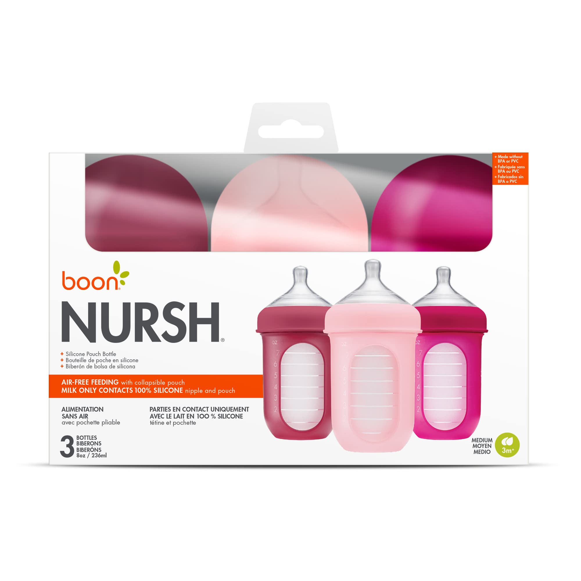 KICK COLIC TO THE CURB! Boon Nursh bottles feature a revolutionary air-free feeding design with a 100% silicone pouch that collapses as your little one drinks, helping prevent colic symptoms like gas and spit up. Other baby bottles use vents or valves that introduce air into milk to help it flow, NURSH doesn’t need any of that. Our silicone pouch collapses as baby drinks, mimicking breast feeding with no added air. The silicone material is also safe for boiling, sterilizing, and freezing, making it easy to get ready for each feeding session for your little one. As a bonus, no vents or valves make it a snap to clean with a dishwasher-safe design and assembly that takes a matter of seconds. After all, who wants to prepare a complicated bottle at 2 am? Nursh’s optimal bottle nipple shape and length are easy for your baby to latch on to Separating the pouch and the plastic shell in Nursh's patented design ensures your baby's milk never touches plastic, only food-safe silicone. Each Nursh bottle is BPA and PVC free.