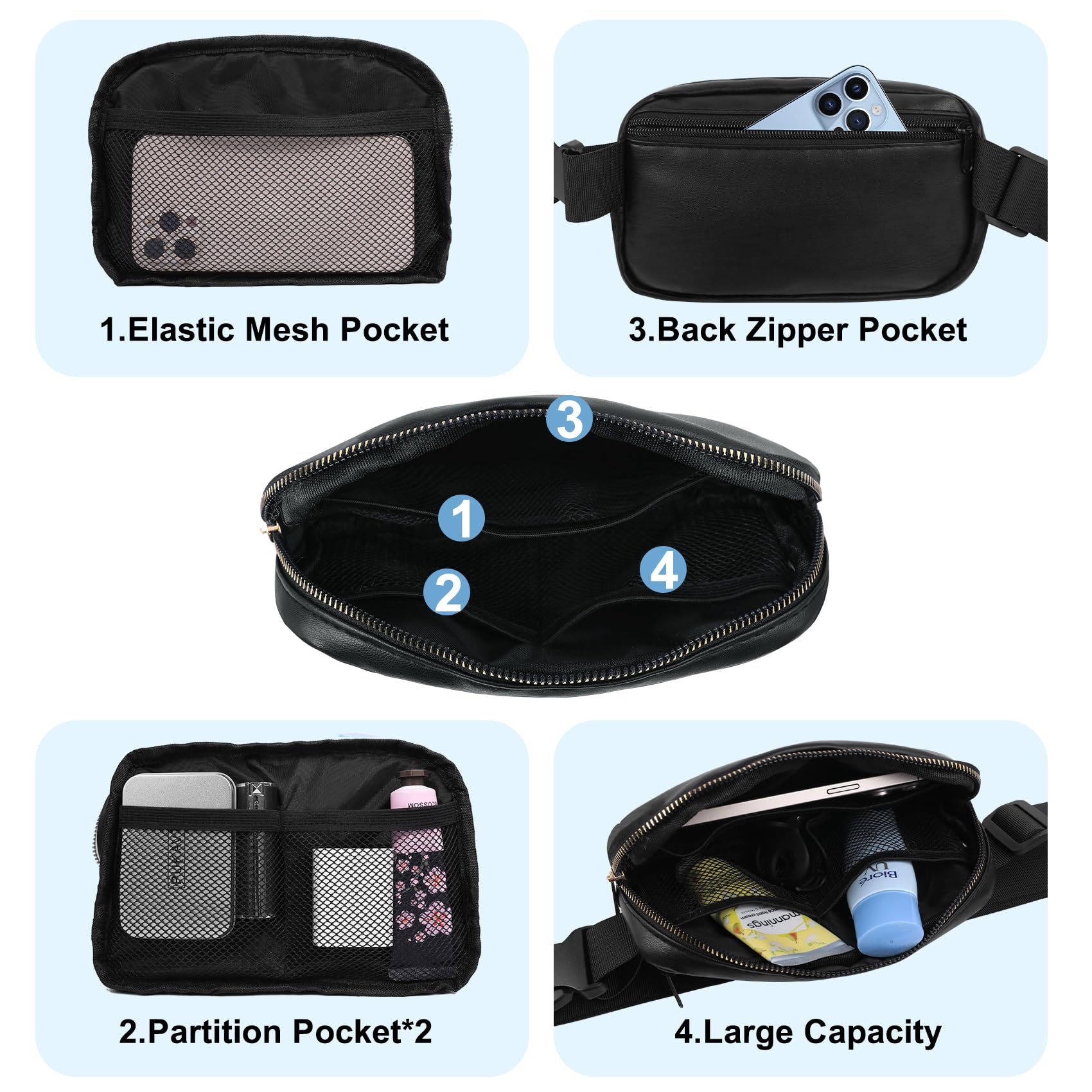Large Capacity: The Belt packs have one main pocket + back pocket + big insert bag +insert card pocket*2. You can put your mobile phone, key, headset, headset, sunglasses, cosmetics, wallets, passports, etc.