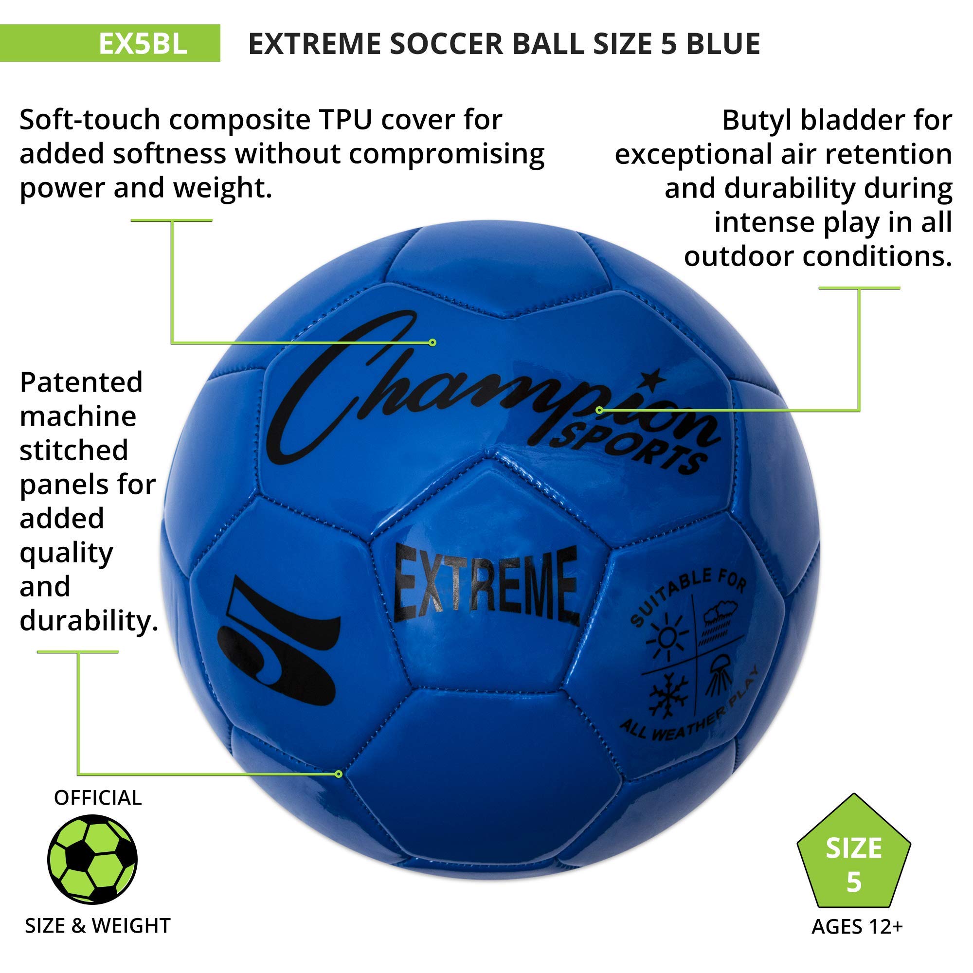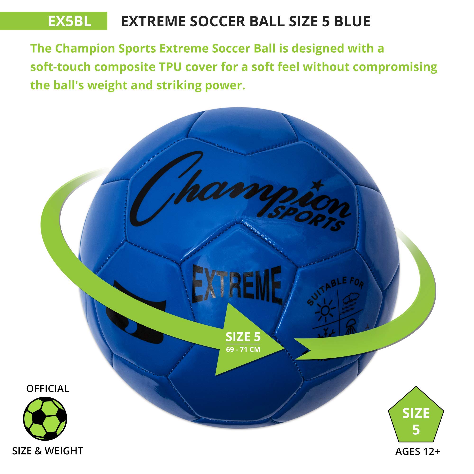 The Champion Sports Extreme Soccer Ball is a Durable, All-Weather Ball for Competition & Training. Built for both competitive matches and casual play, the Champion Sports Extreme Soccer Ball is designed to perform in any weather. Its soft-touch TPU cover provides a comfortable feel for dribbling, passing, and striking, while maintaining the weight and power needed for accurate shots. Engineered for durability, this high-quality soccer ball features a butyl bladder for superior air retention and machine-stitched panels for long-lasting performance. Whether you're playing in the heat, cold, wind, or rain, this ball maintains its shape and reliability. Available in three sizes: EX3 (Size 3): Ages 8 & under, EX4 (Size 4): Ages 8 to 12, and EX5 (Size 5 – Official Size): Ages 12 & up. Choose from a variety of vibrant colors, including Red, Orange, Yellow, Green, Blue, Purple, Black, Silver, and Pink. Note: Ball ships deflated. Pump sold separately.