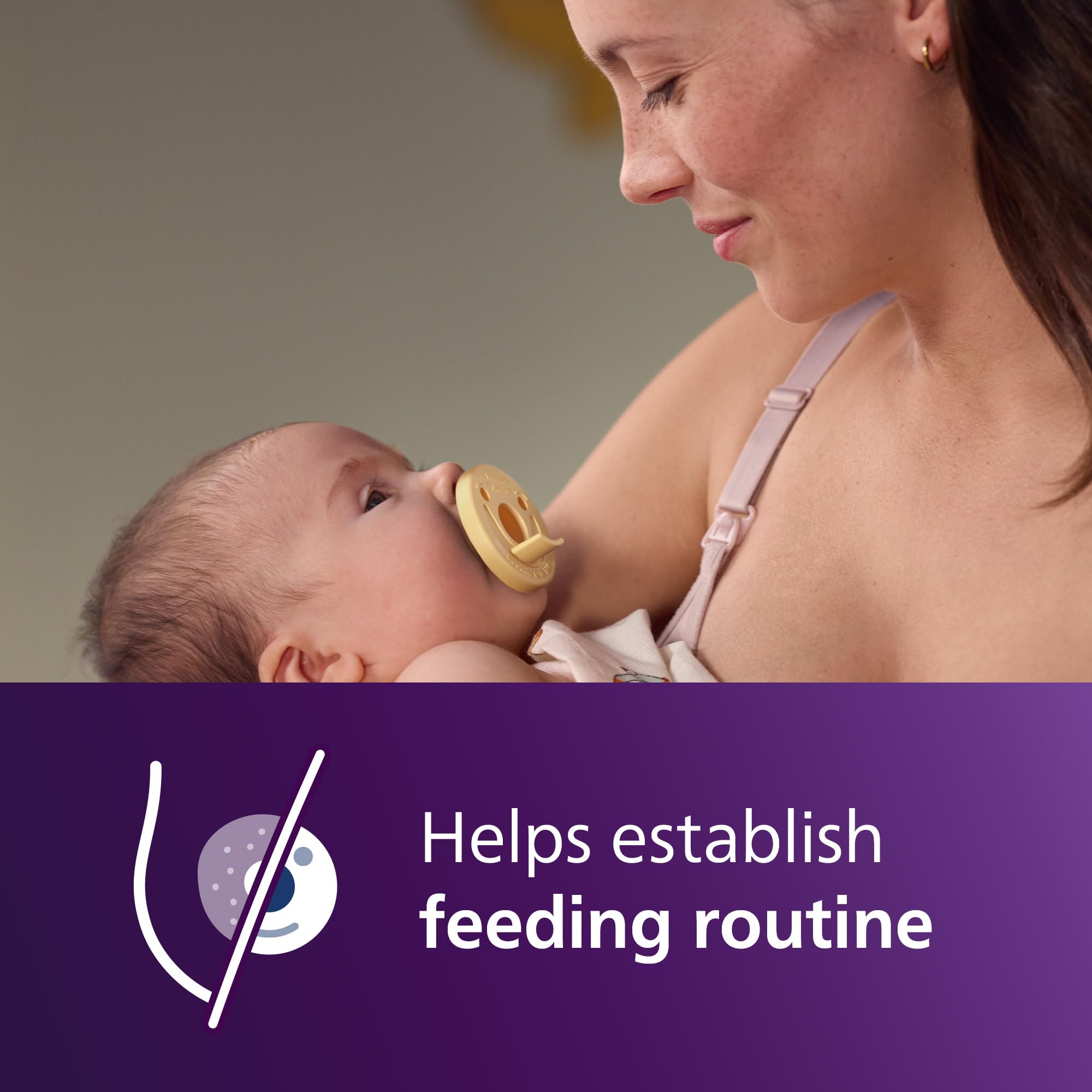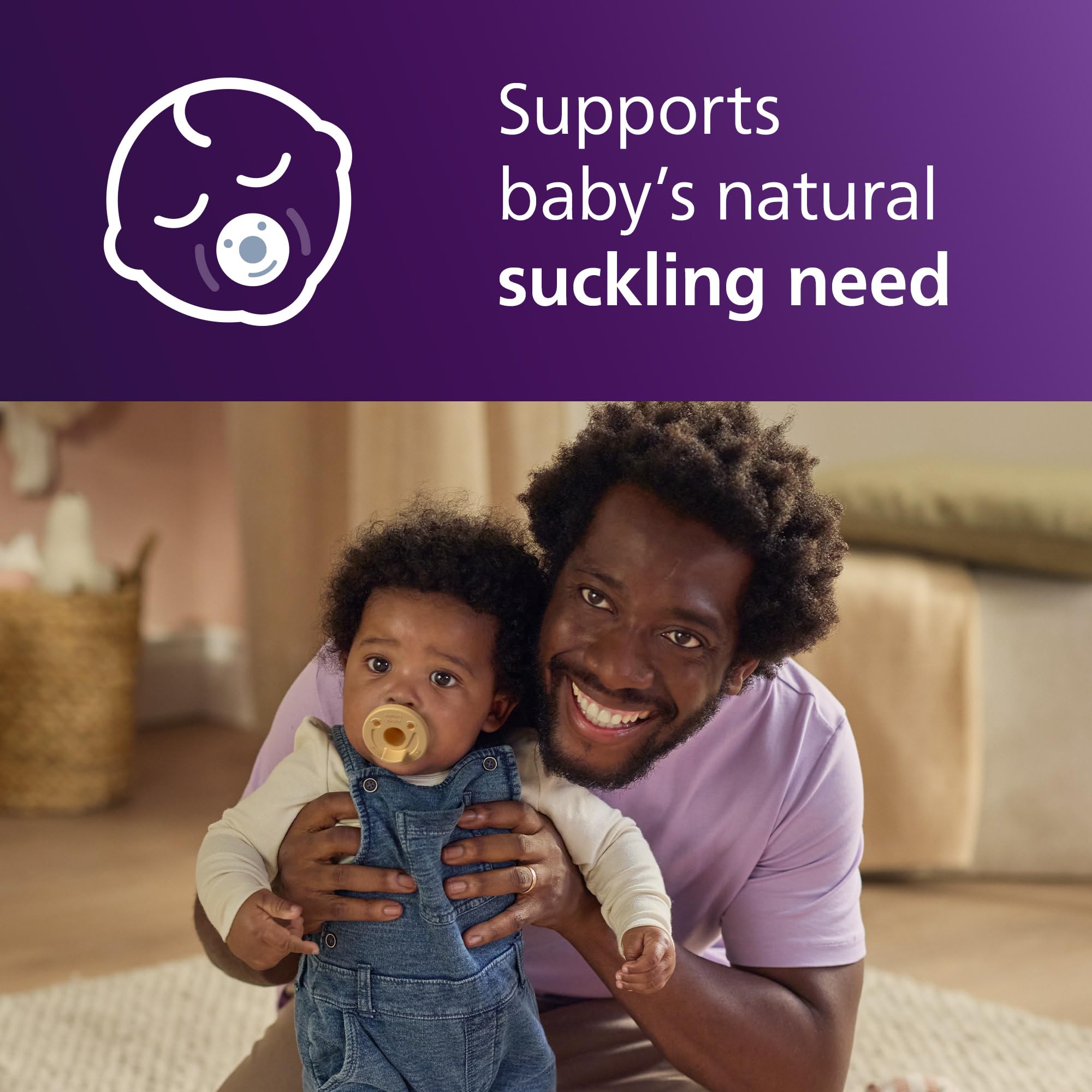 Philips Avent Soothie one-piece pacifiers are specially sized and shaped for babies 3-18 months old and adhere to the American Academy of Pediatrics guidelines¹. The set includes 2 green and 2 yellow pacifiers. Soothies are made of hospital-grade, BPA-free and latex-free silicone for comfort and durability. A collapsible, symmetrical-shaped nipple supports healthy oral development and promotes your baby's natural suckling instinct. The unique finger-held design lets you place your finger in the nipple so parents and caregivers can bond and connect with the baby, making it easier to share the care. This also makes cleaning easy and prevents water from getting trapped in the nipple. Clean Soothie pacifiers with your sterilizer or submerge them in boiling water. For hygiene reasons, replace soothers after 4 weeks of use. Soothies are compatible with Soothie Snuggle pacifier holders, a soft animal plush toy for babies to hold. The Soothie and plush toy detach so parts can be cleaned separately. Philips Avent Soothie is distributed in hospitals nationwide. 92% of moms trust Soothie for their newborns² ¹ American Academy of Pediatrics recommends to “purchase pacifiers that cannot possibly come apart. Those molded of one solid piece of plastic are particularly safe”. (Caring for Your Baby and Young Child: Birth to Age 5, 7th ed. 2019, By American Academy of Pediatrics, Tanya Remer Altmann and David L. Hill, New York: Bantam Books.) ² of moms aware of Soothie